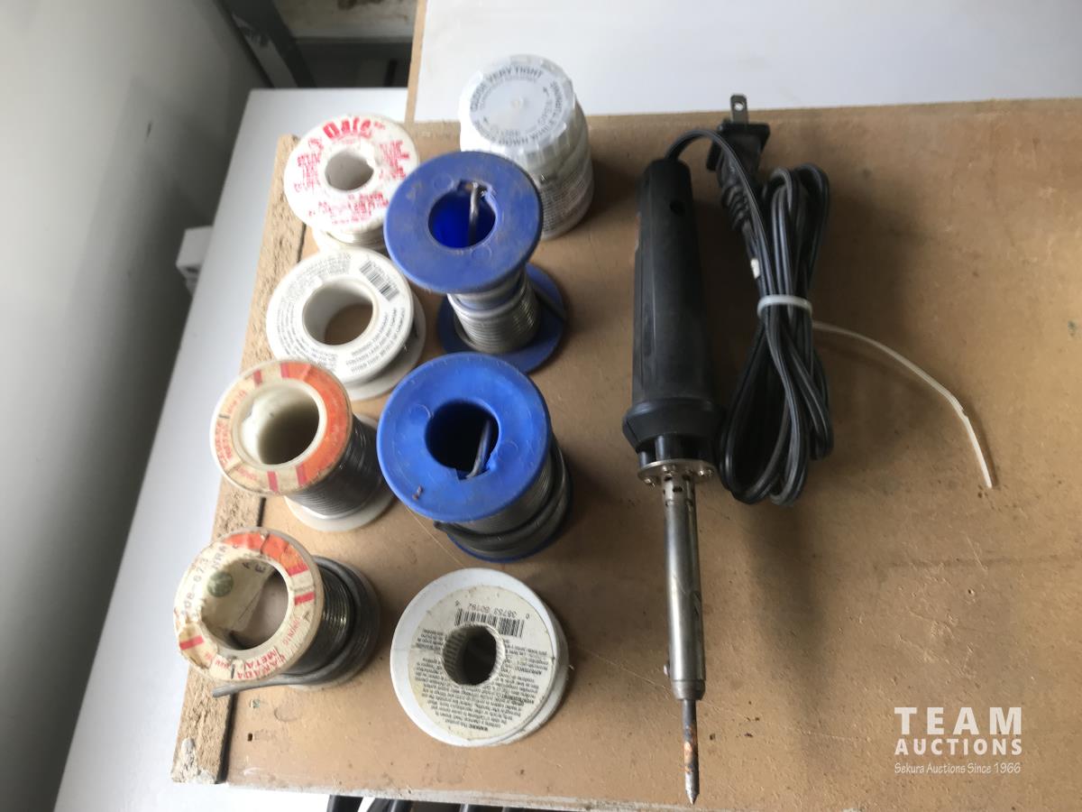 Wood cabinet, window inserts, Teflon tape, soldering iron, 7 inch window panes, locking gas caps, miscellaneous hooks, scraper blades, cable & crimps