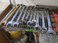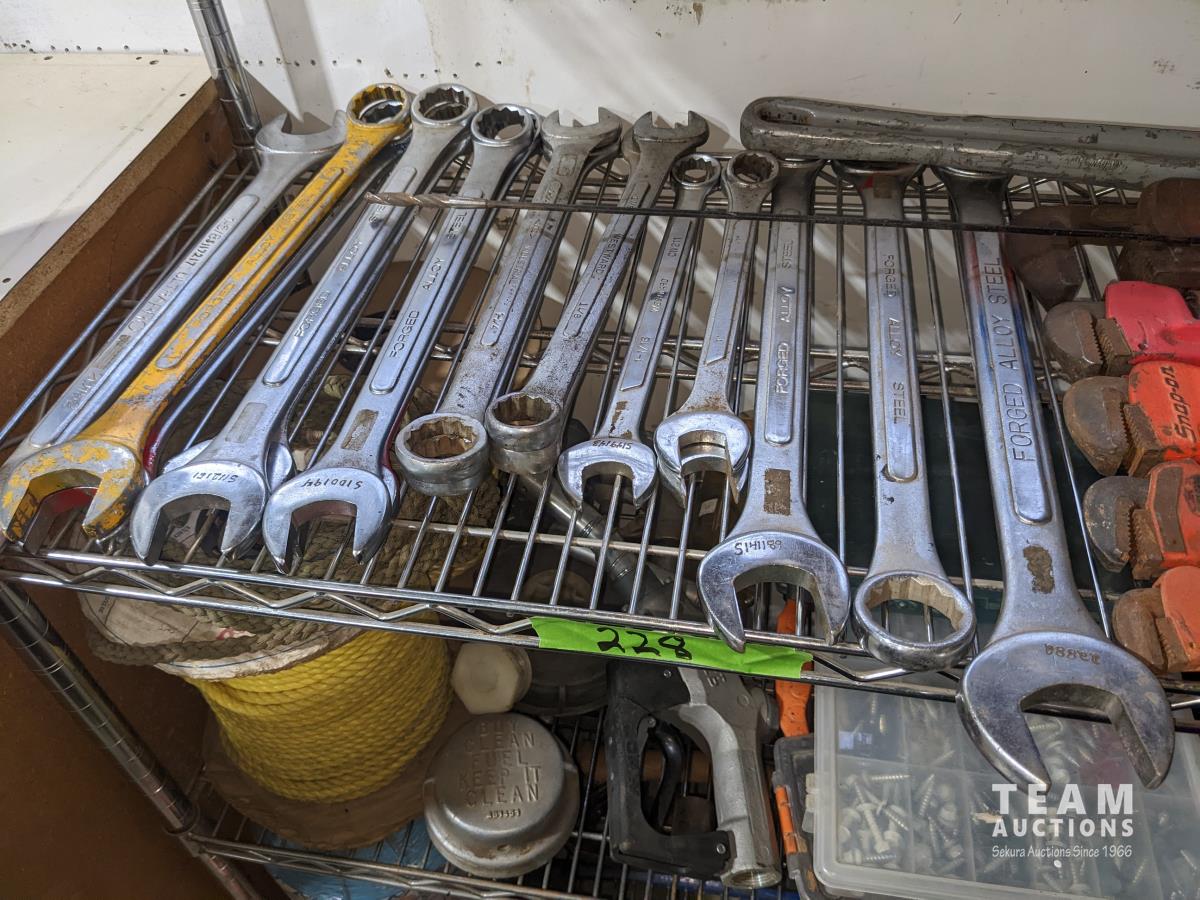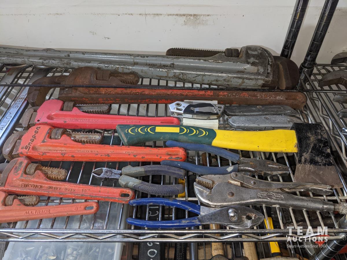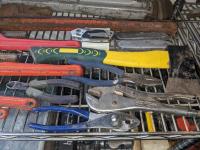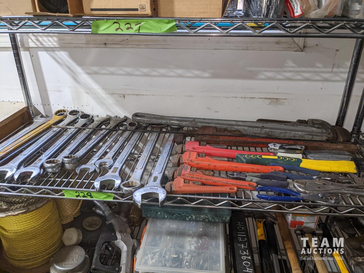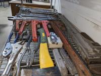 Combination wrenches, pipe wrenches, vise grips, pliers, hatchet, box cutter