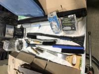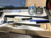(4) hand saws, tree pruning saw, wire & nylon mesh screen, window scrapper, chicken waterer, coffee pot