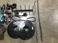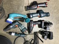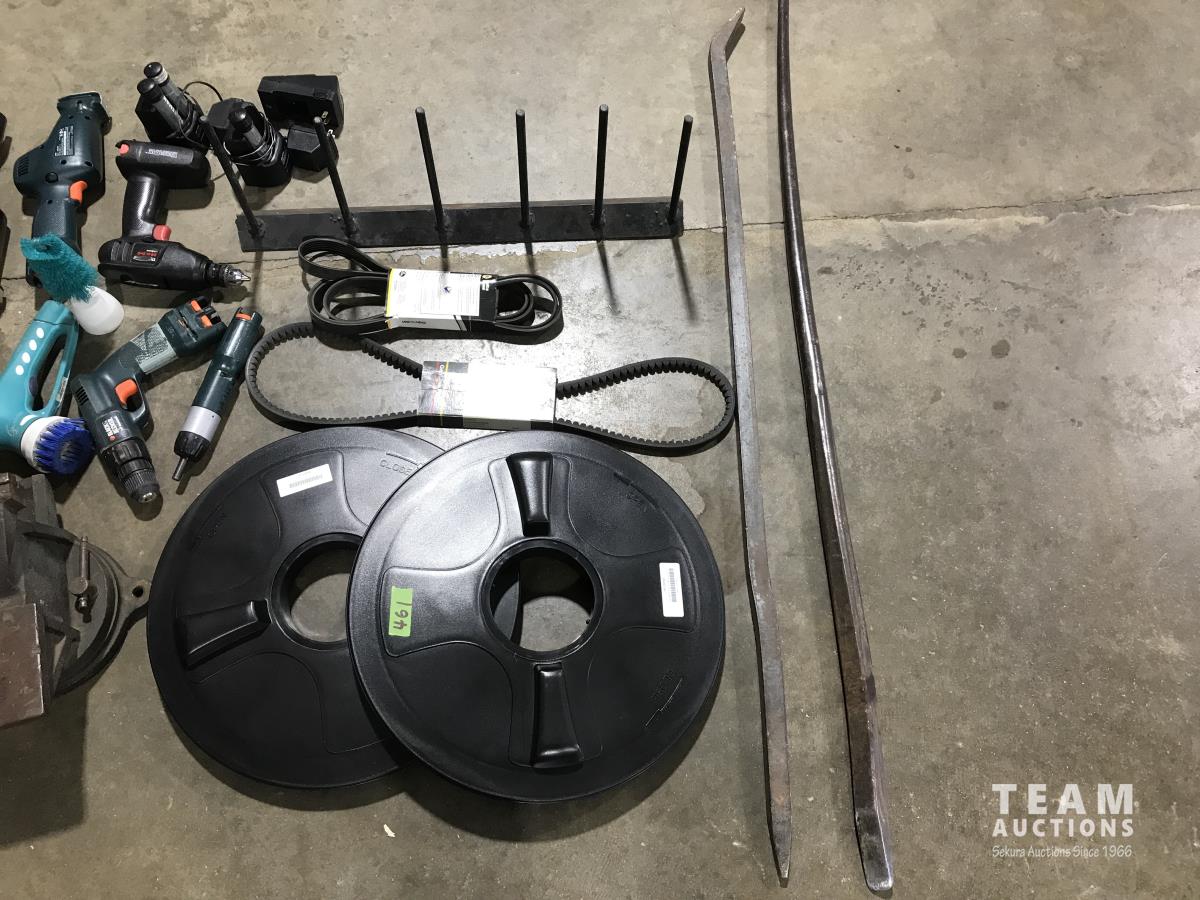 (2) Tank lids, miscellaneous tools, belts, cordless drills, cordless jig saws, crowbars, steel hanging rack