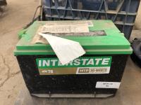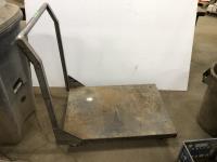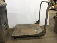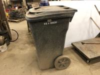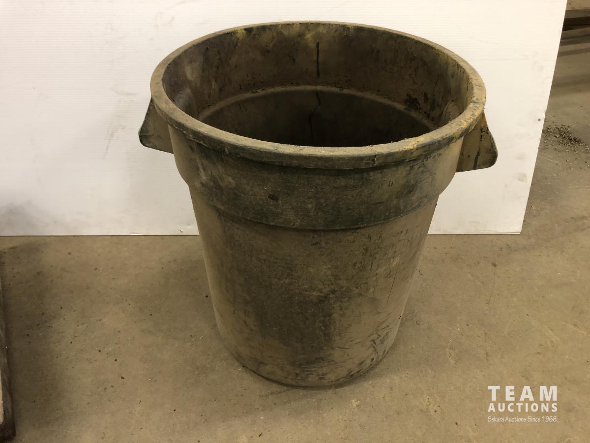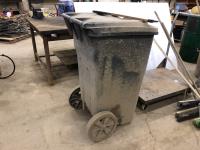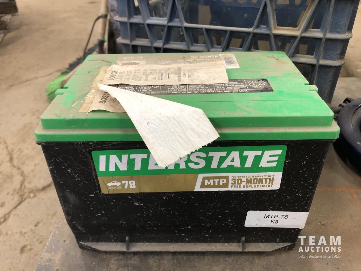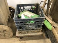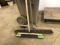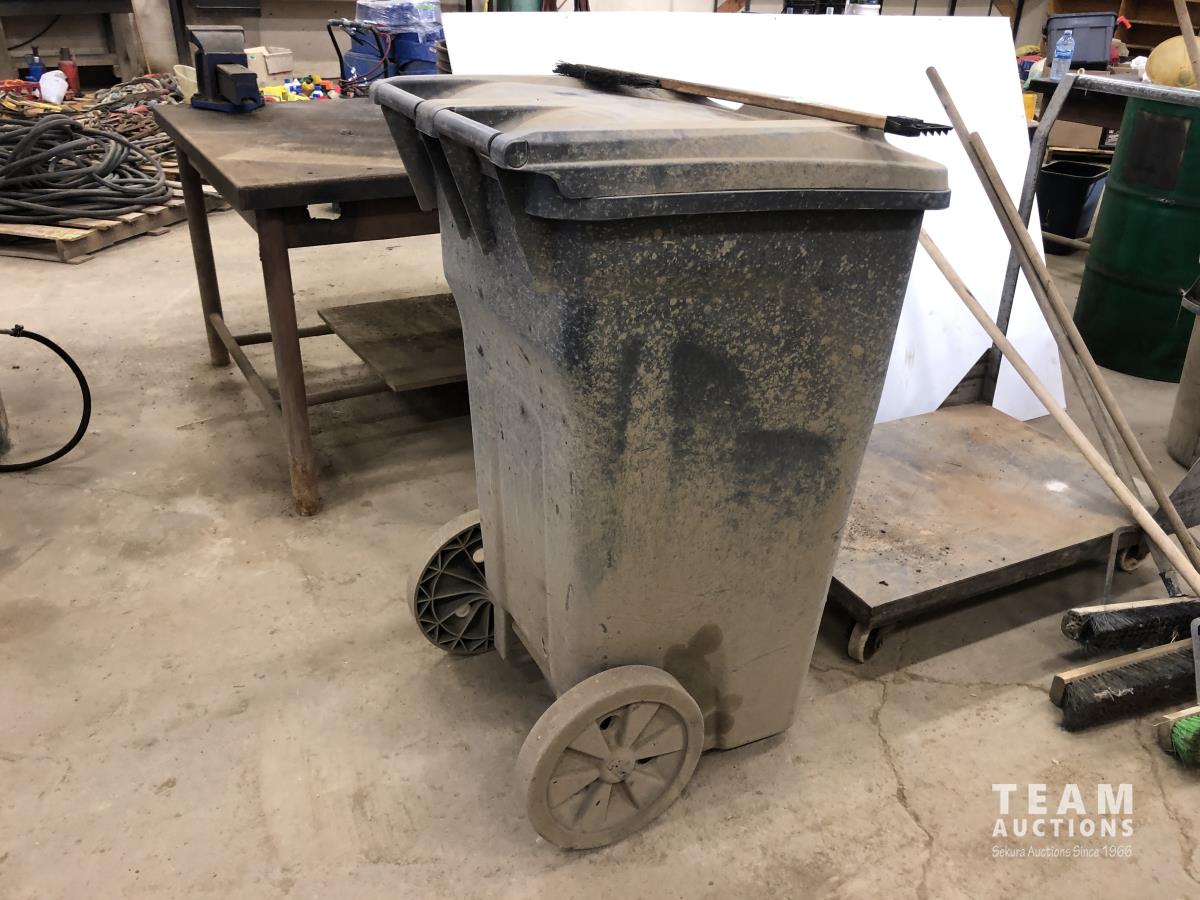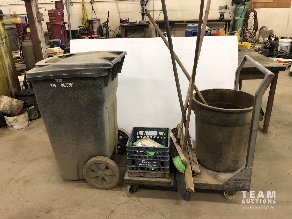 (2) Poly garbage cans, (3) brooms, steel shop trolly, Interstate 12V battery, milk crate
