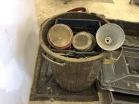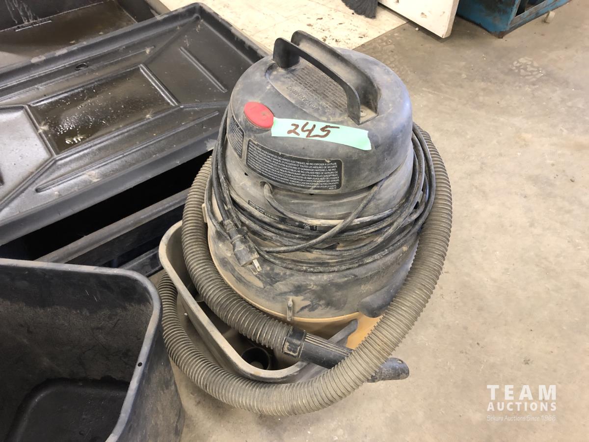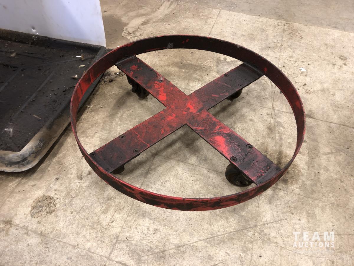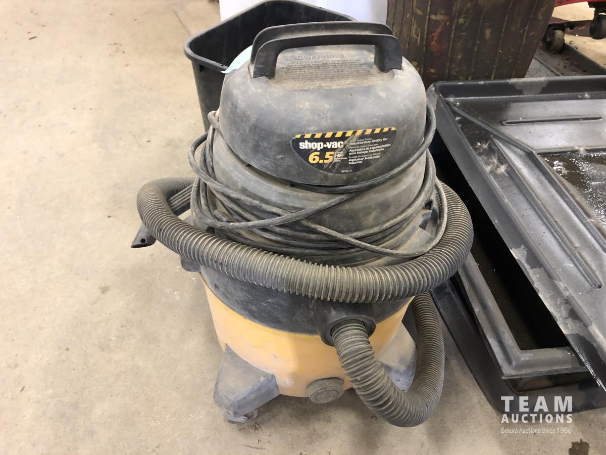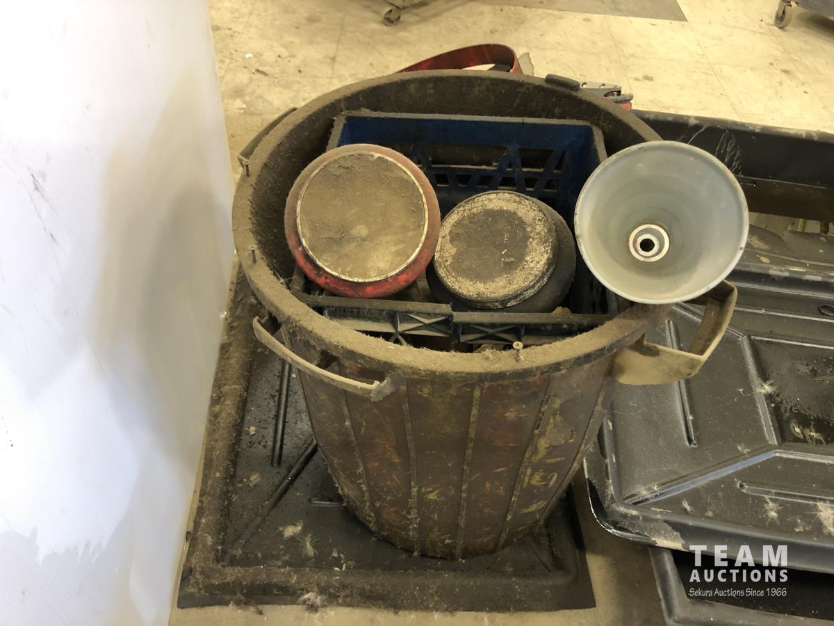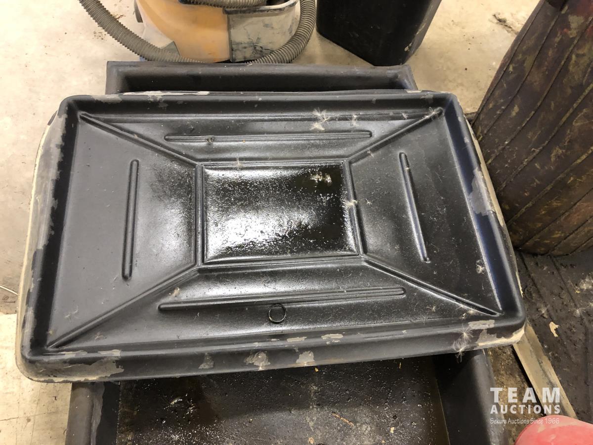 (4) containment trays, oil funnels, 6.5 HP shop vac, mop bucket, garbage can, barrel dolly