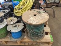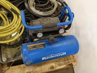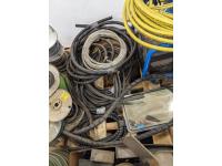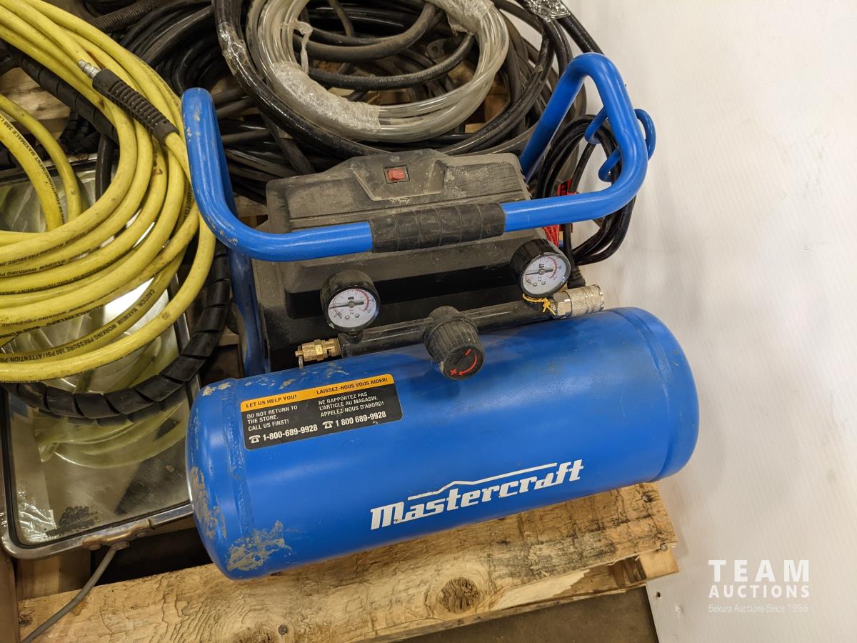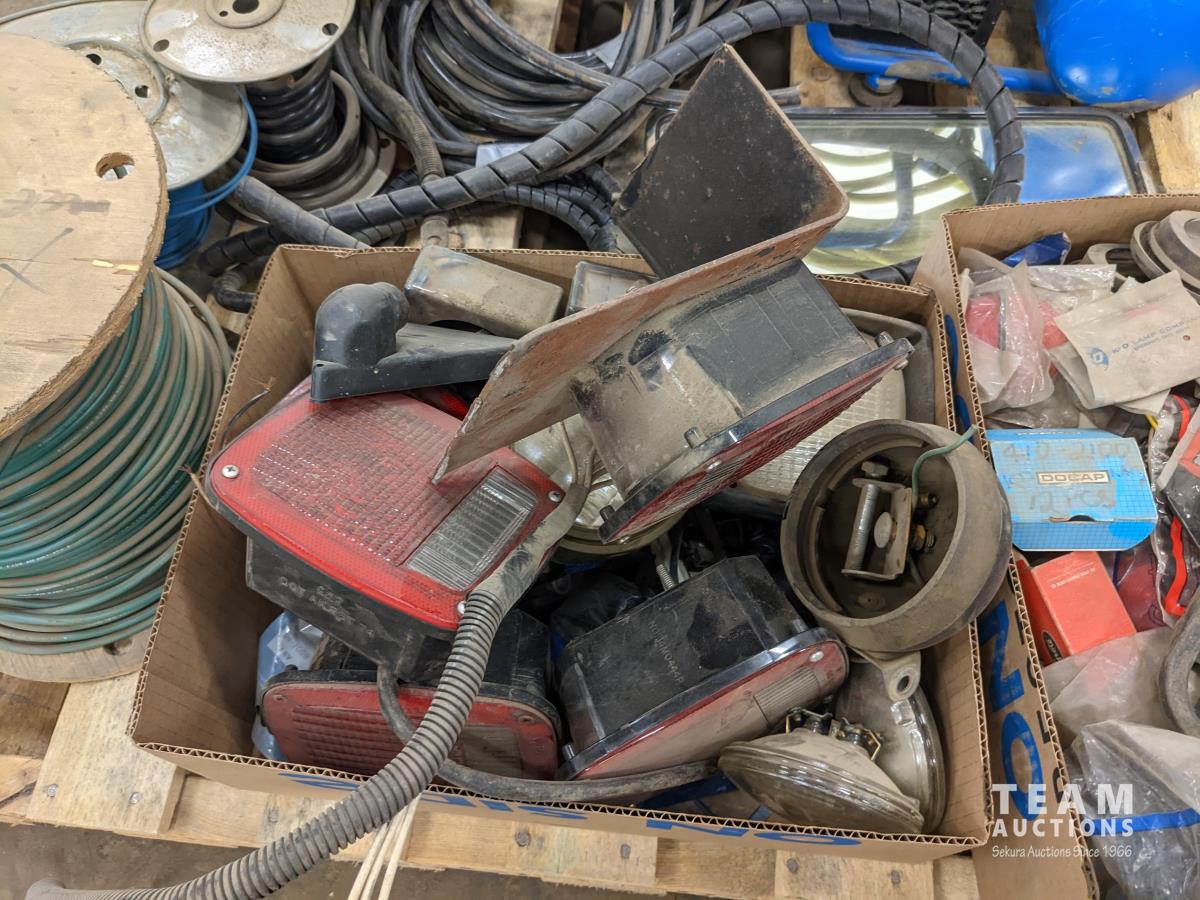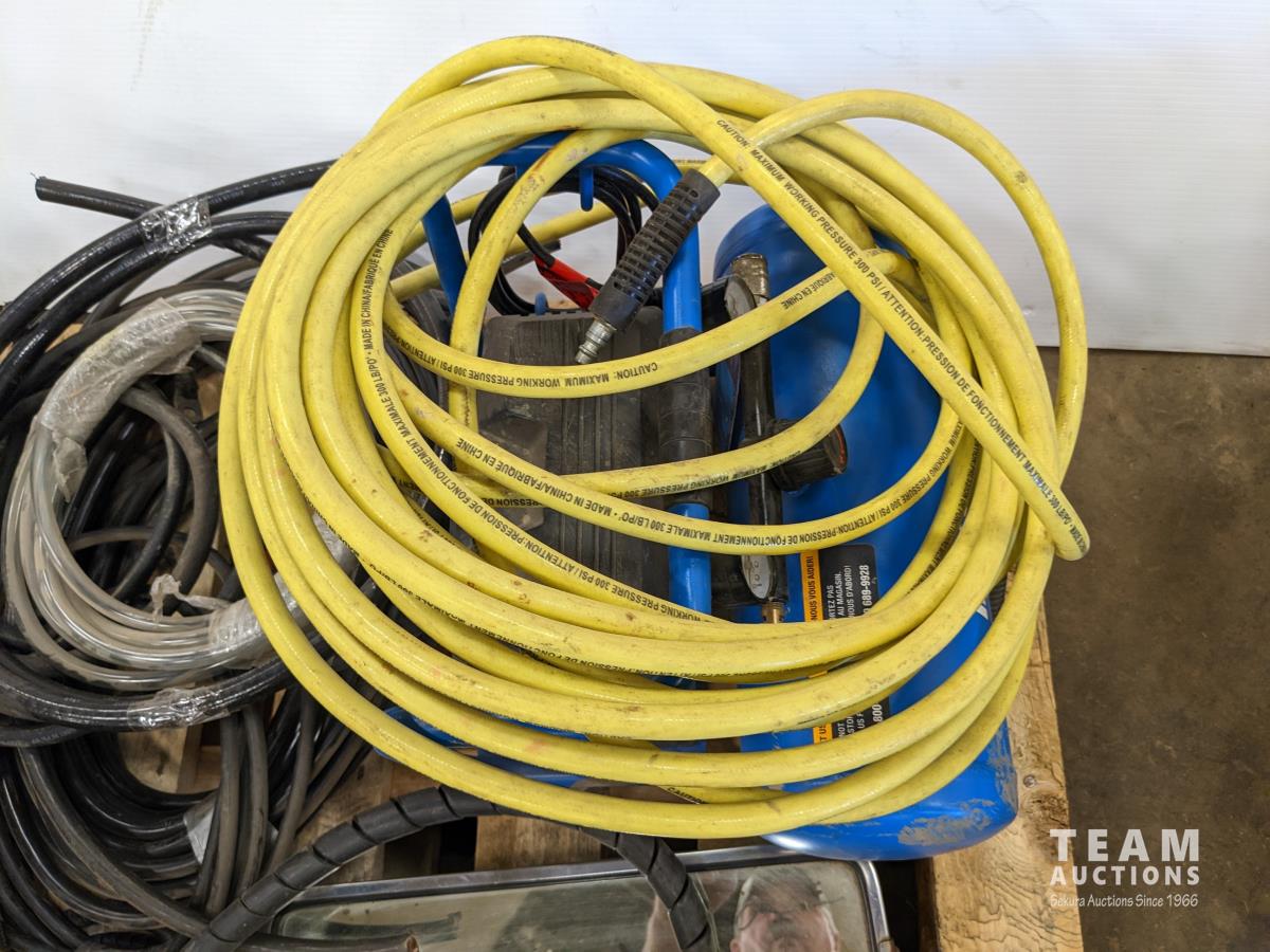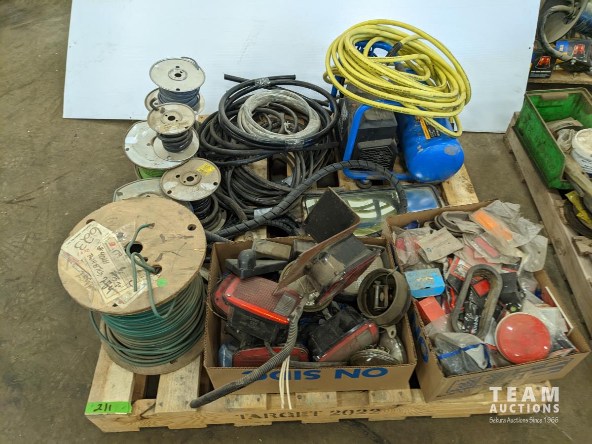 Assorted automotive lights, electrical wire, small air compressor with hose, loom, truck mirror
