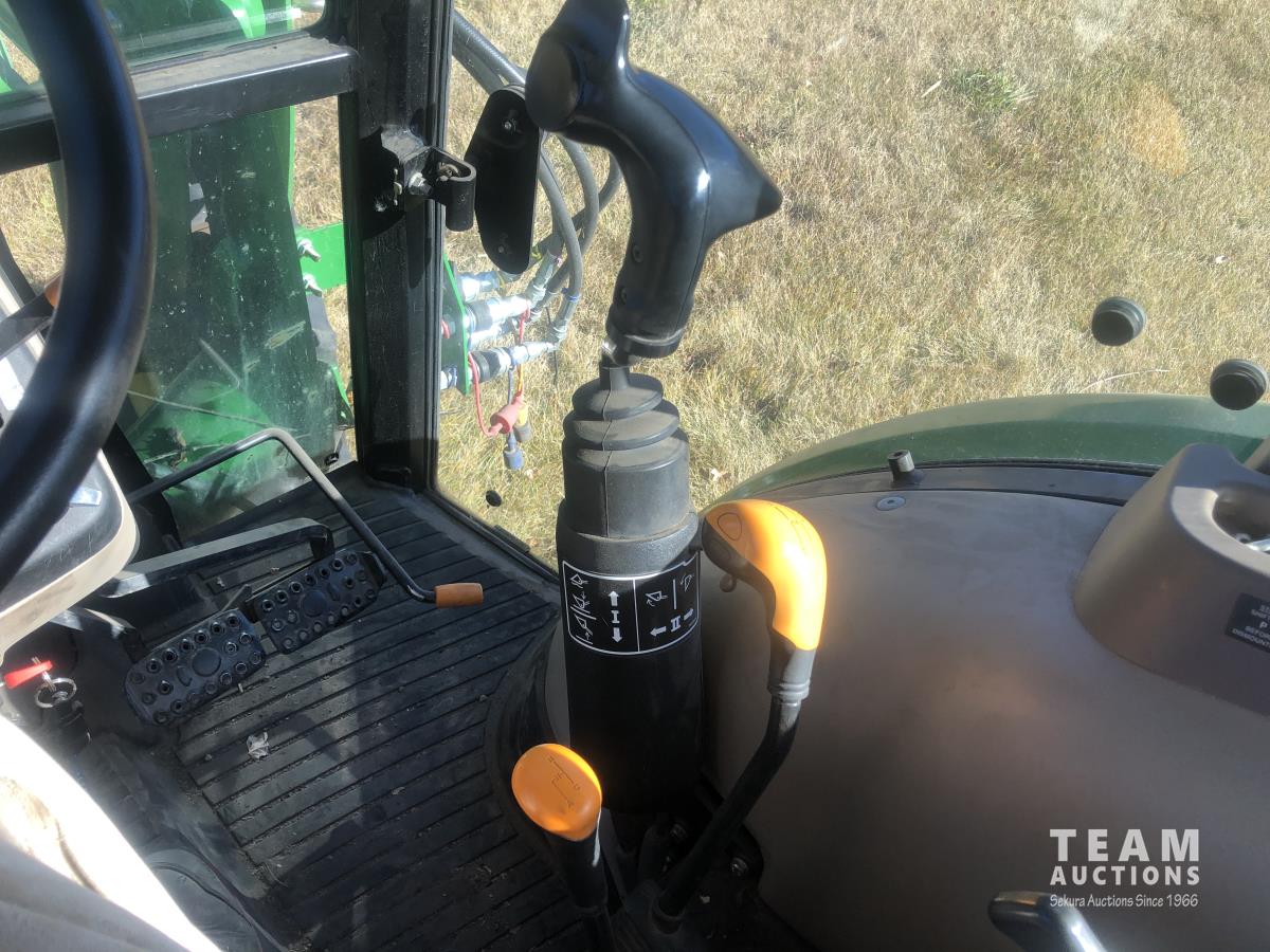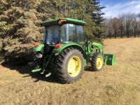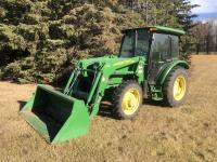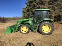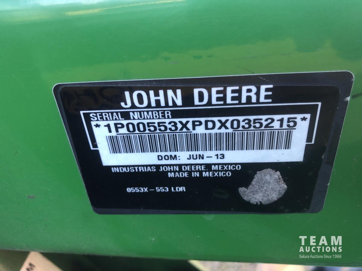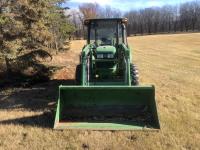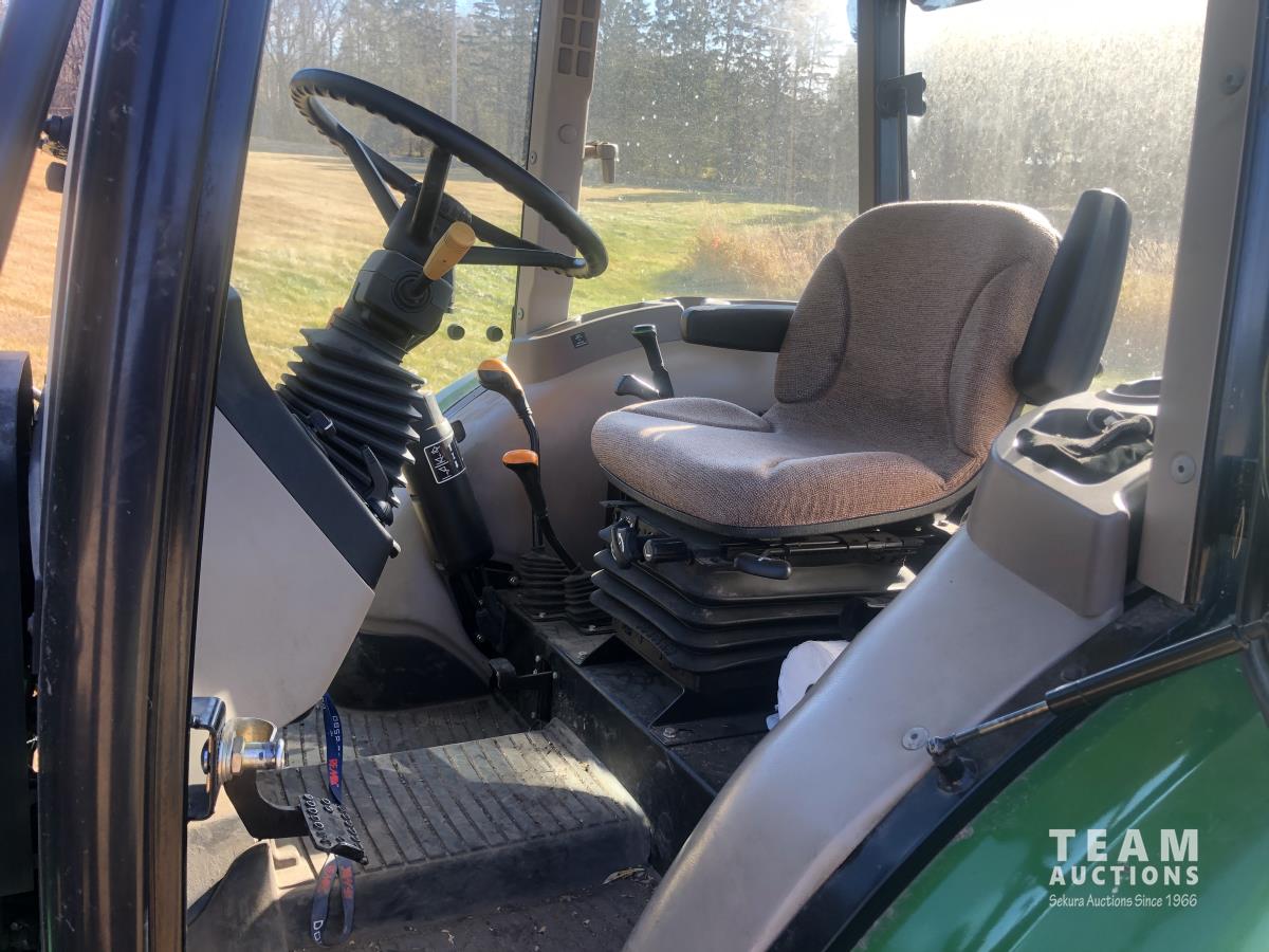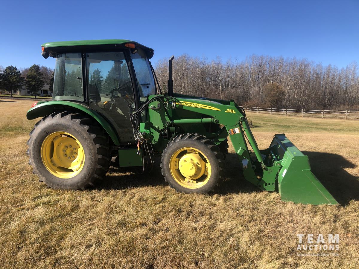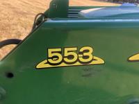 John Deere 553 loader, 72 inch Q/A bucket, pallet forks, joystick, 2.9 L 3 cylinder diesel engine, 12 speed partially synchronized transmission with left hand power shuttle, differential lock, cab, AC, 3 PT hitch, 540 PTO, (1) rear hydraulic outlet, 9.5-24 front & 16.9-28 rear tires