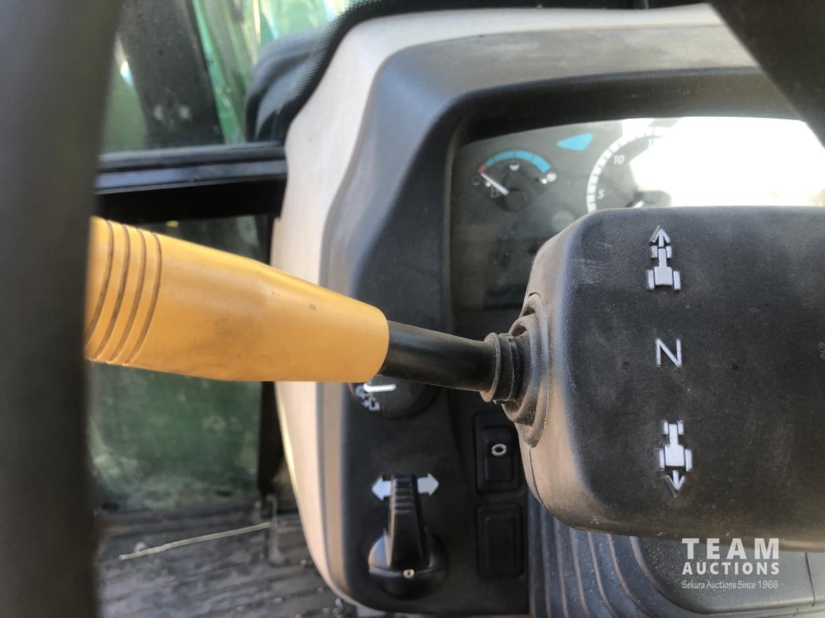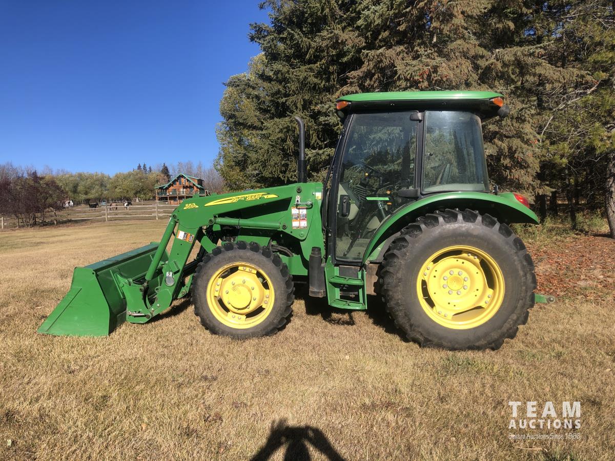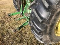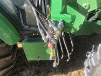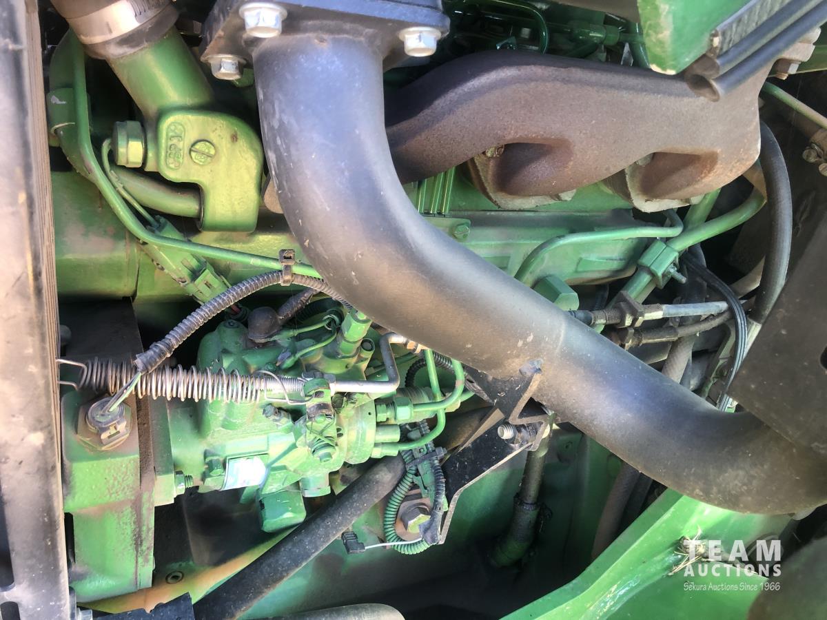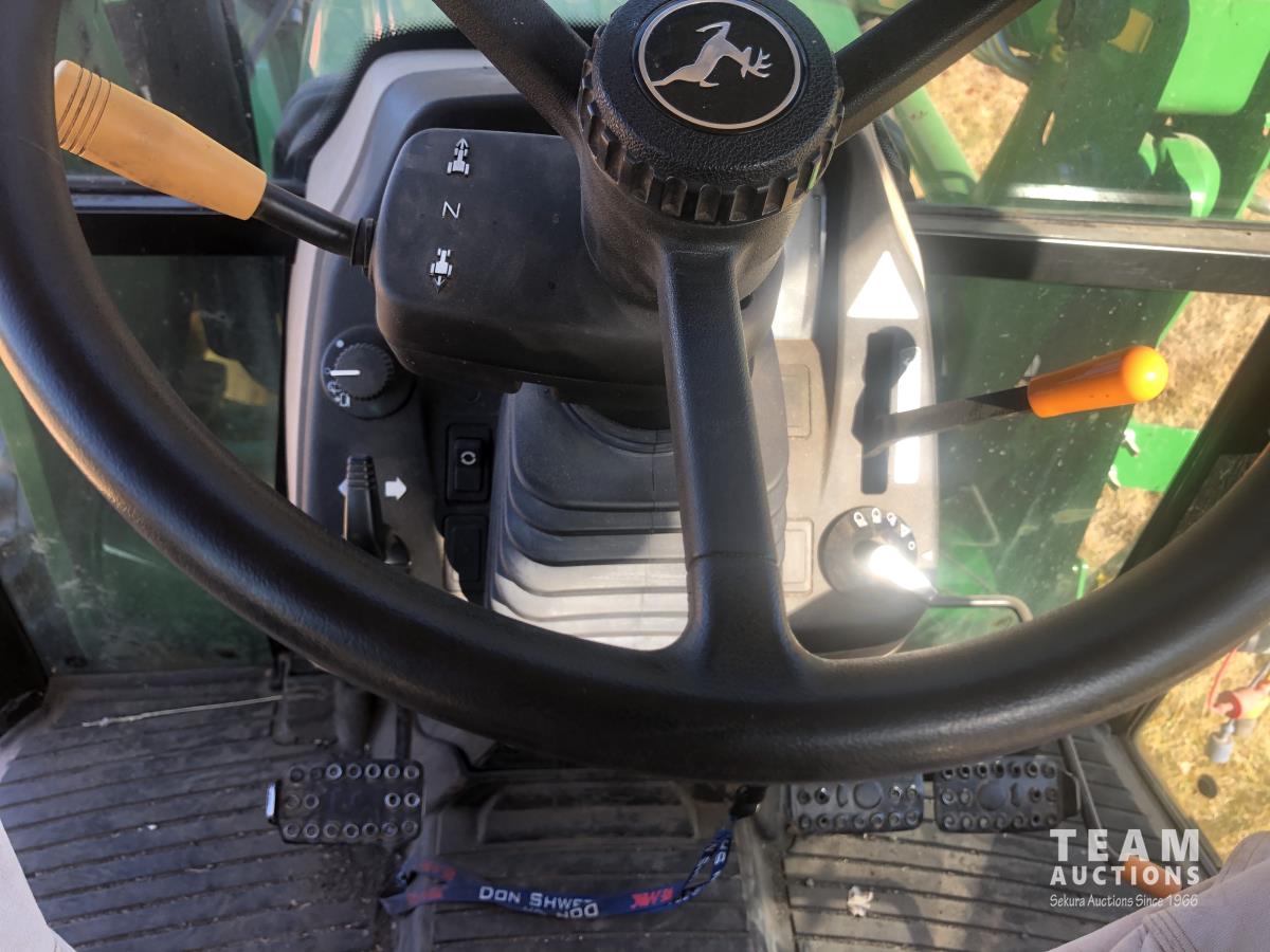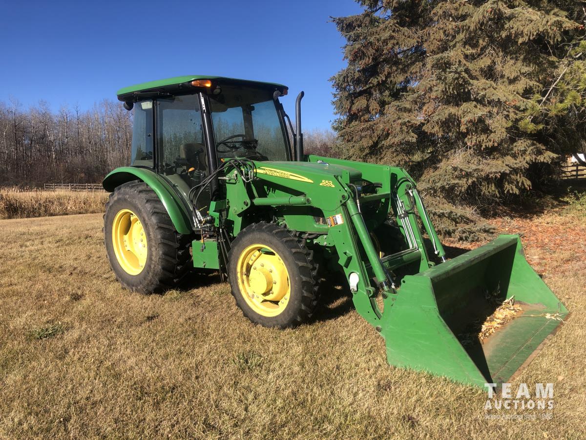 John Deere 553 loader, 72 inch Q/A bucket, pallet forks, joystick, 2.9 L 3 cylinder diesel engine, 12 speed partially synchronized transmission with left hand power shuttle, differential lock, cab, AC, 3 PT hitch, 540 PTO, (1) rear hydraulic outlet, 9.5-24 front & 16.9-28 rear tires