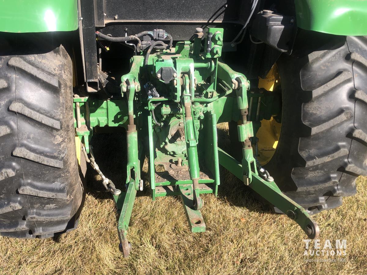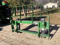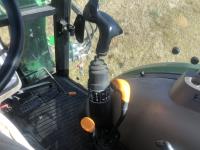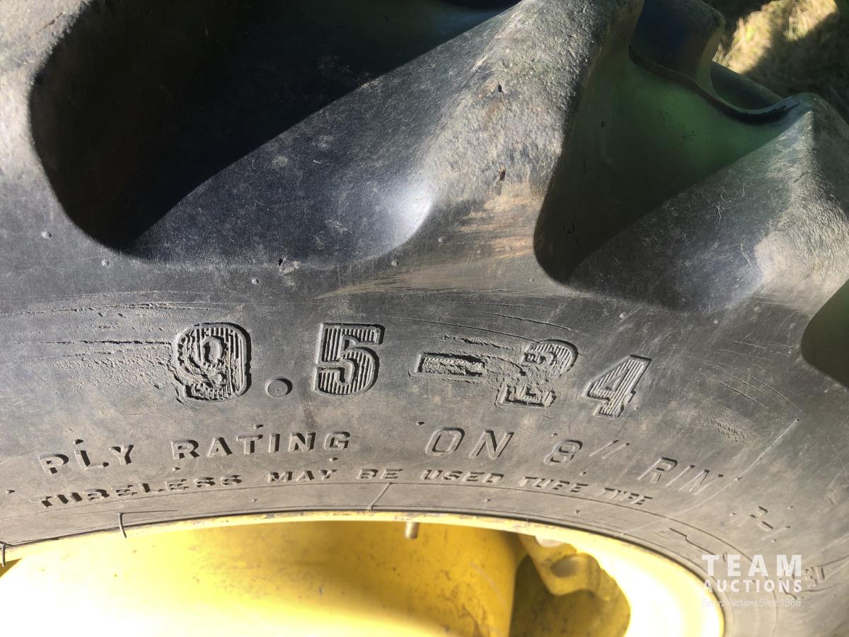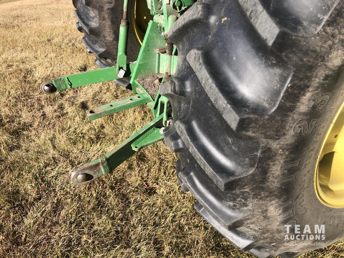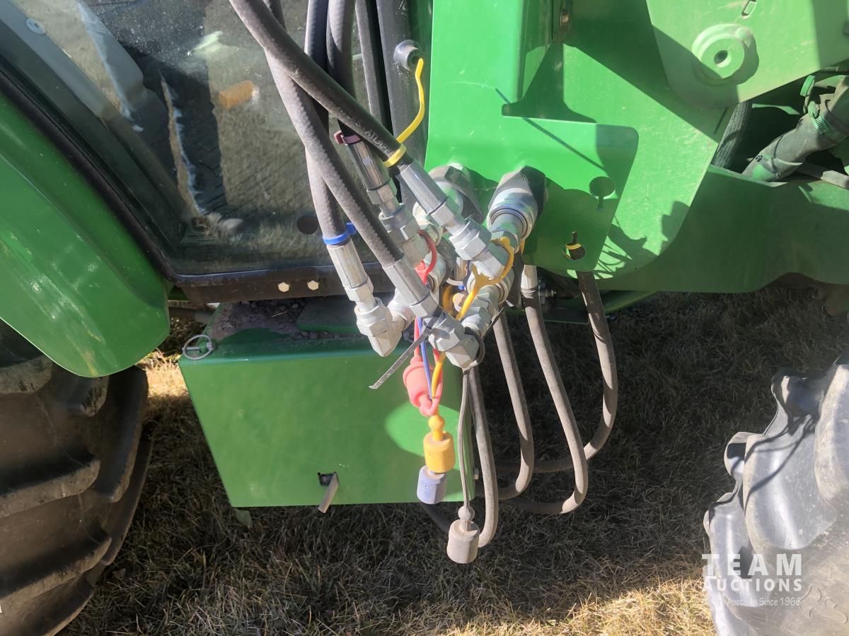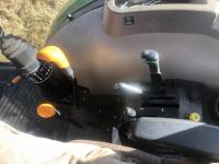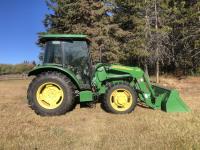 John Deere 553 loader, 72 inch Q/A bucket, pallet forks, joystick, 2.9 L 3 cylinder diesel engine, 12 speed partially synchronized transmission with left hand power shuttle, differential lock, cab, AC, 3 PT hitch, 540 PTO, (1) rear hydraulic outlet, 9.5-24 front & 16.9-28 rear tires