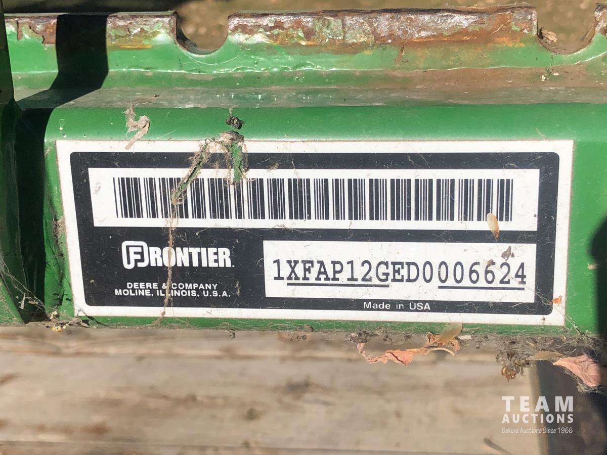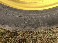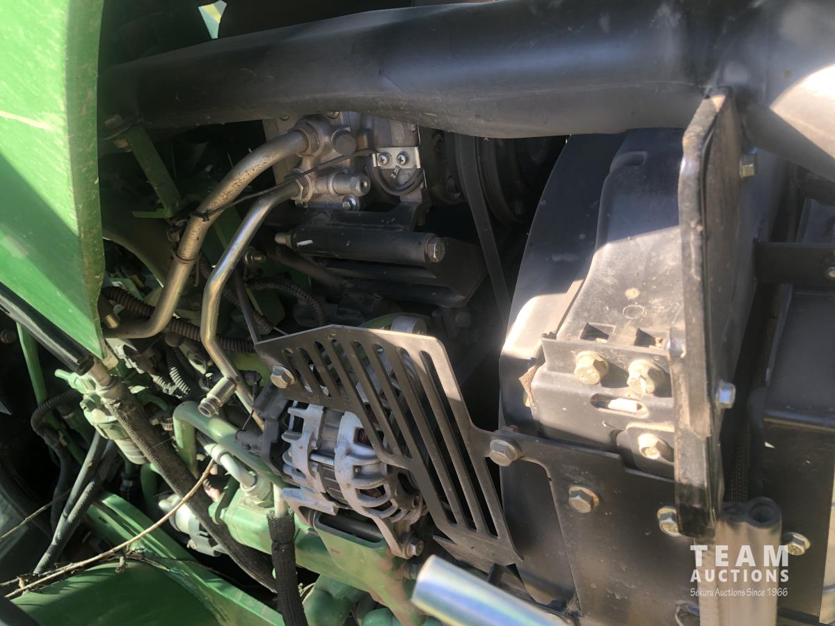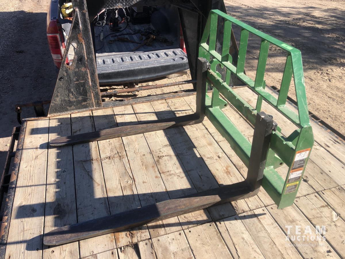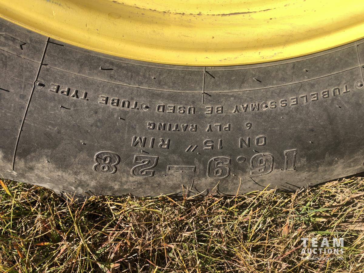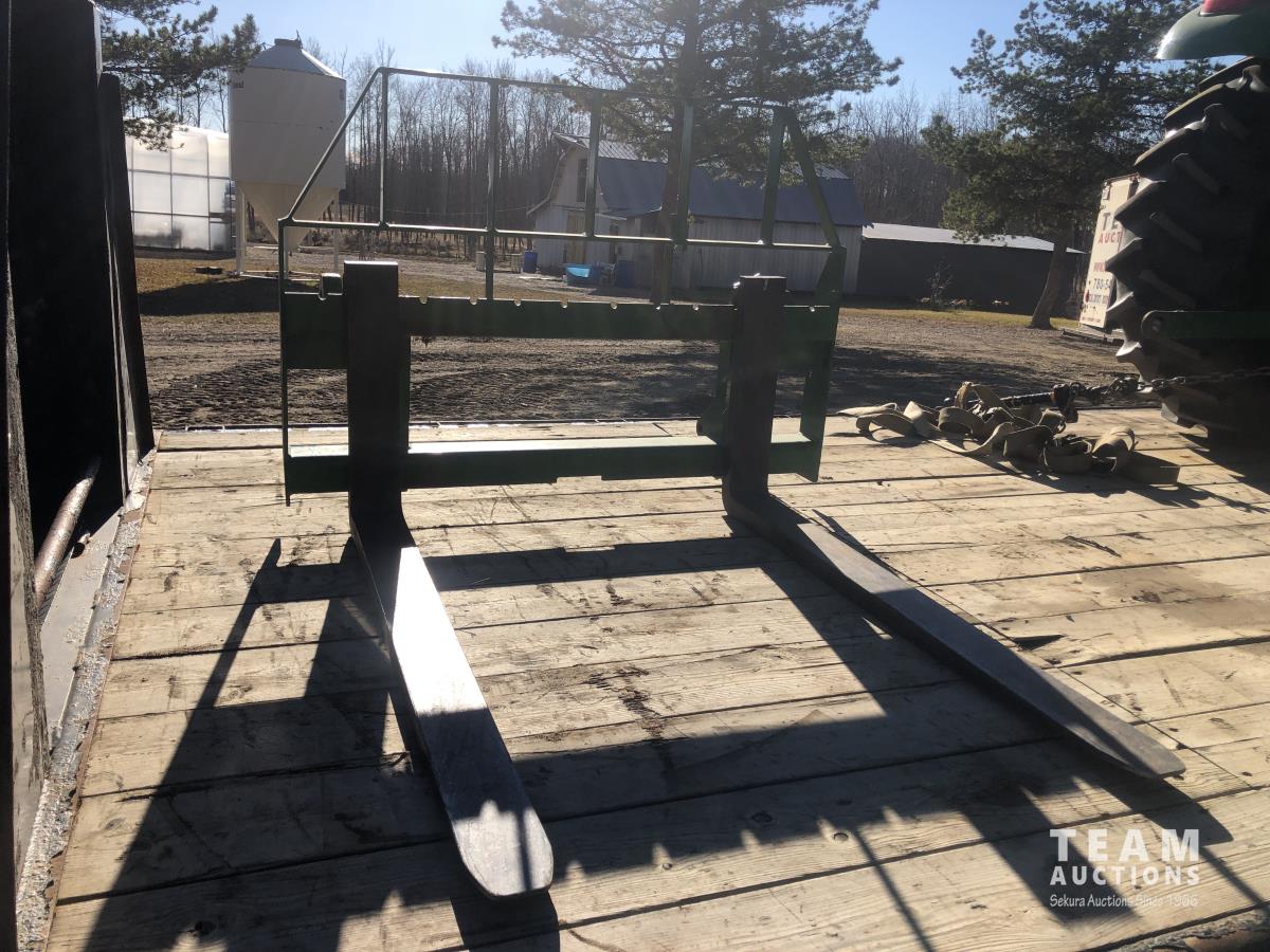 John Deere 553 loader, 72 inch Q/A bucket, pallet forks, joystick, 2.9 L 3 cylinder diesel engine, 12 speed partially synchronized transmission with left hand power shuttle, differential lock, cab, AC, 3 PT hitch, 540 PTO, (1) rear hydraulic outlet, 9.5-24 front & 16.9-28 rear tires