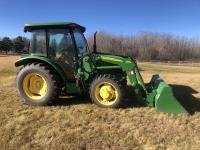 John Deere 553 loader, 72 inch Q/A bucket, pallet forks, joystick, 2.9 L 3 cylinder diesel engine, 12 speed partially synchronized transmission with left hand power shuttle, differential lock, cab, AC, 3 PT hitch, 540 PTO, (1) rear hydraulic outlet, 9.5-24 front & 16.9-28 rear tires