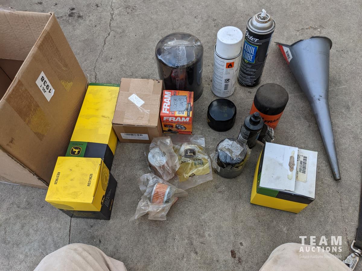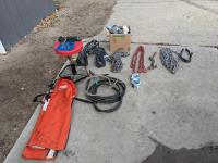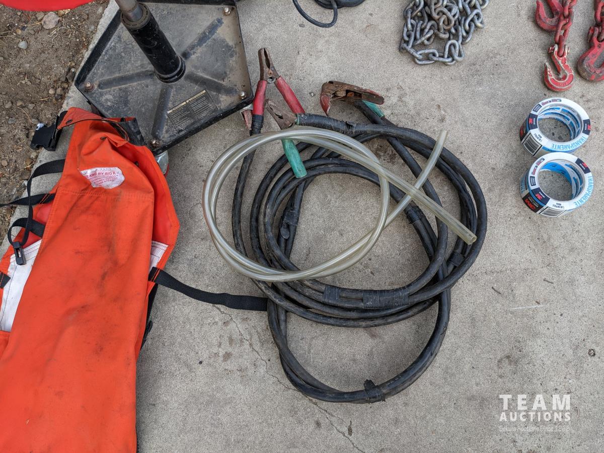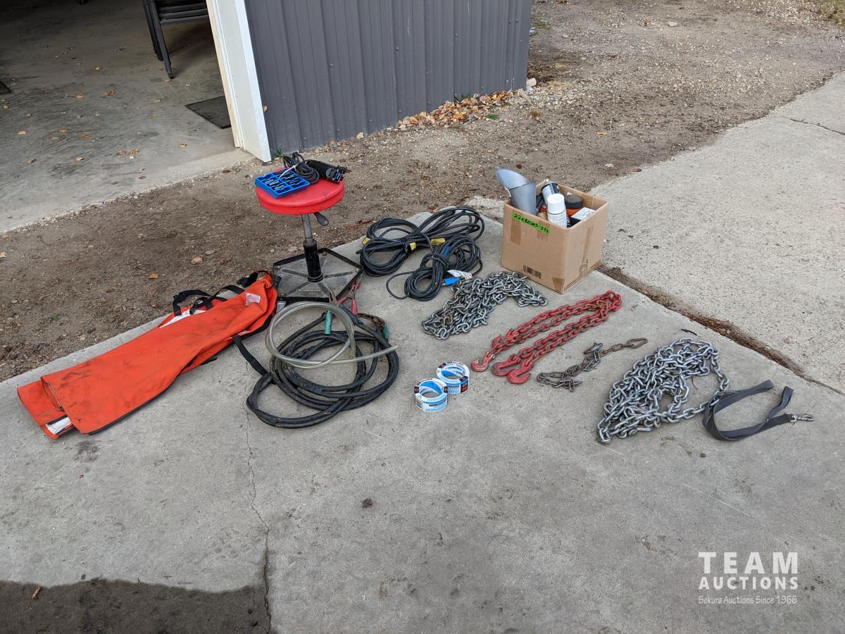 Oil and miscellaneous filters, shop stool, chain saw safety chaps, extension cords, (2) rolls of packing tape, Oster clippers, booster cables