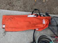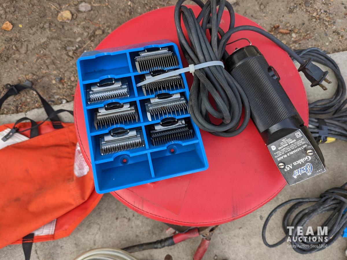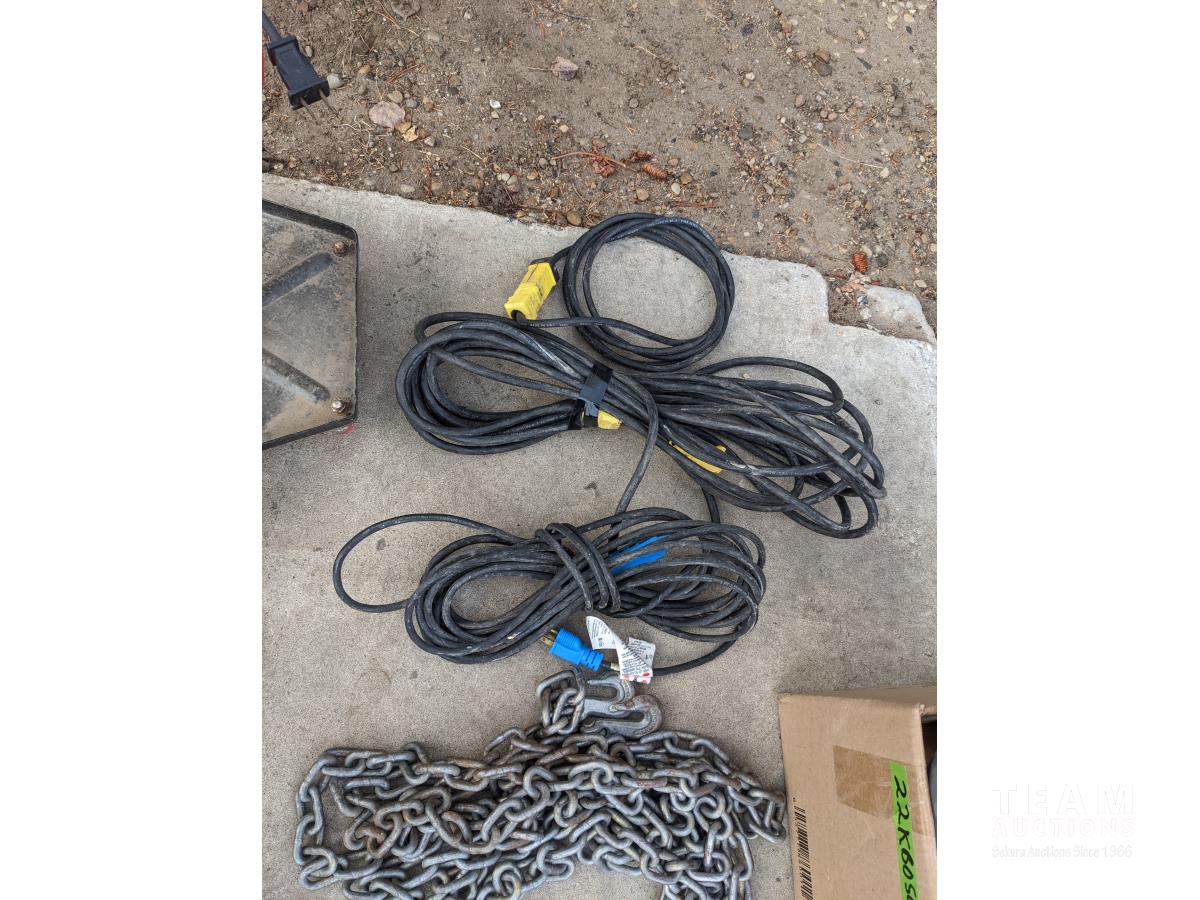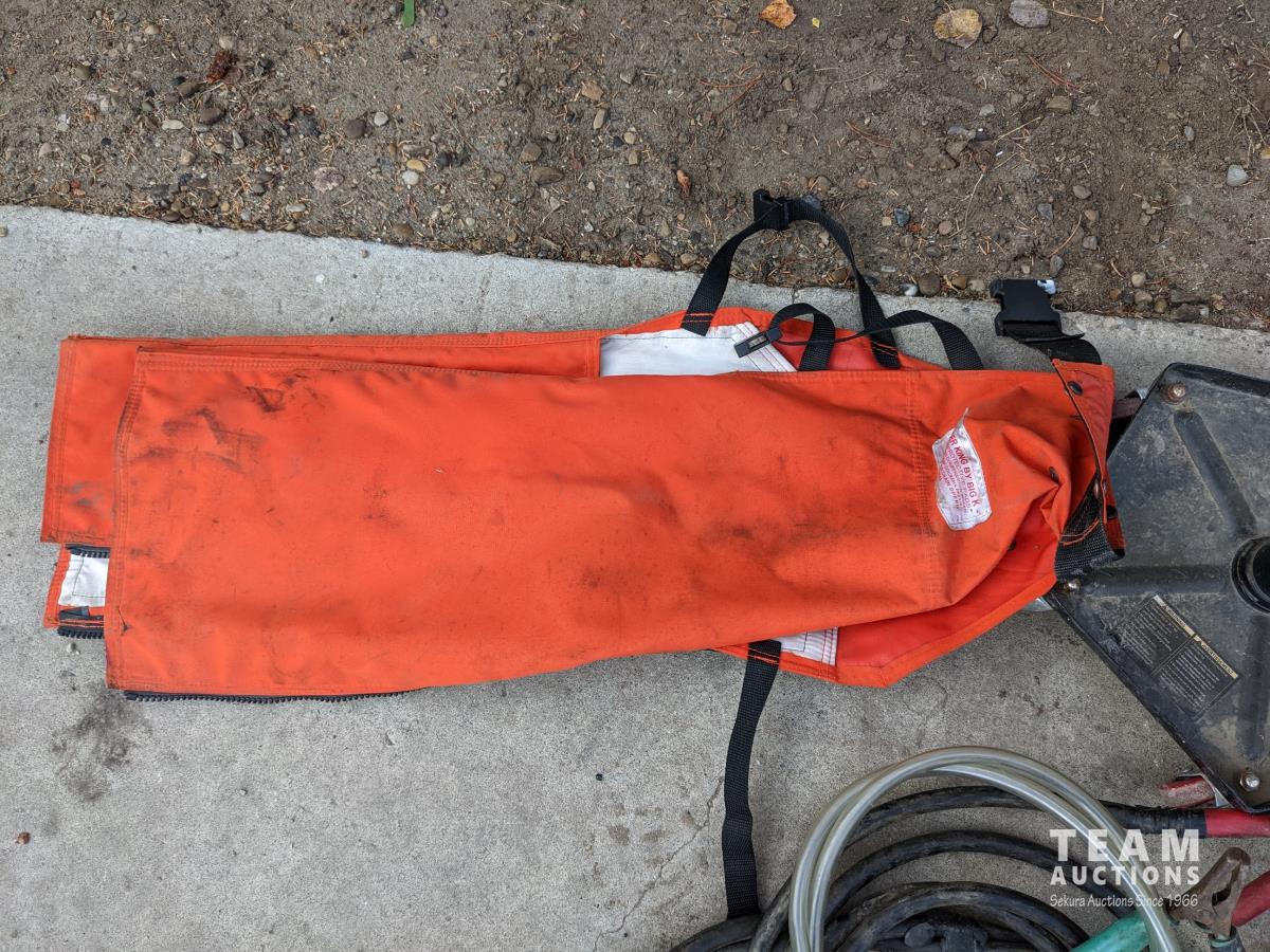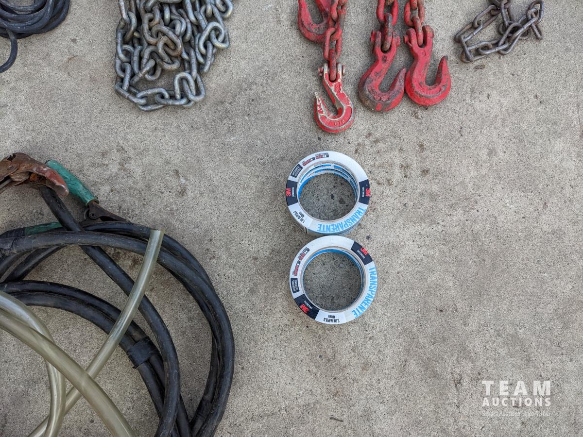 Oil and miscellaneous filters, shop stool, chain saw safety chaps, extension cords, (2) rolls of packing tape, Oster clippers, booster cables
