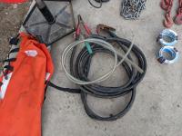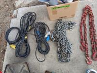 Oil and miscellaneous filters, shop stool, chain saw safety chaps, extension cords, (2) rolls of packing tape, Oster clippers, booster cables