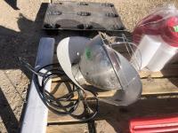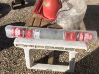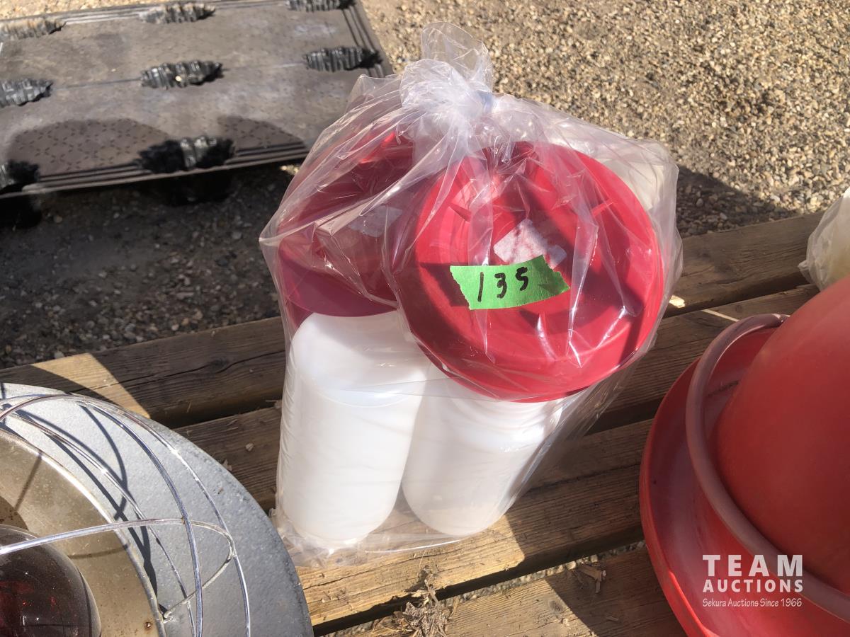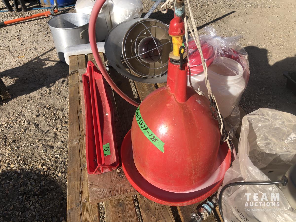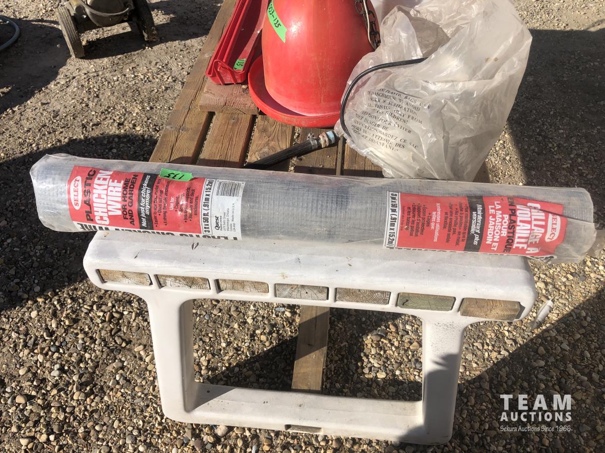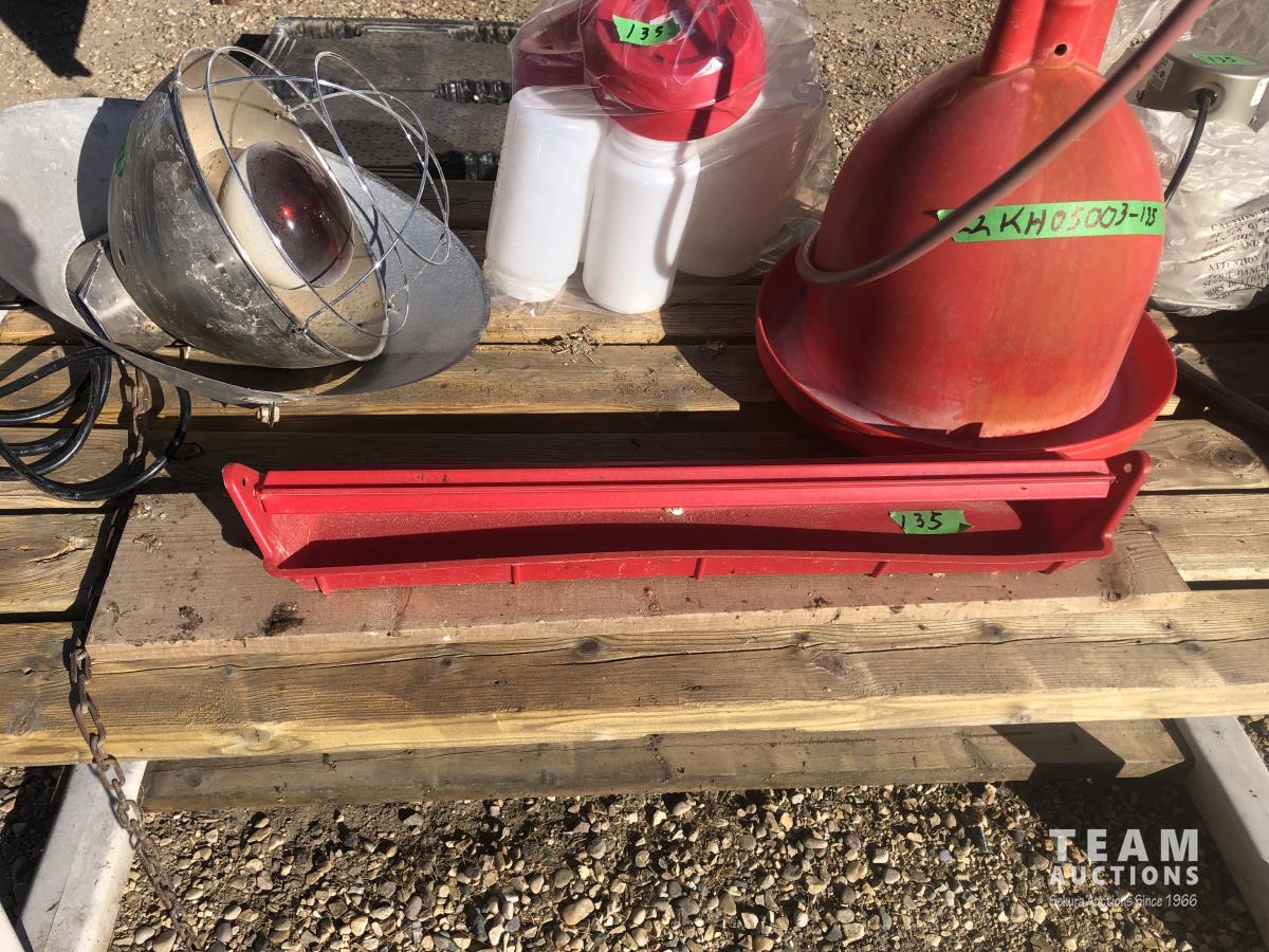 (2) Heat lamps, (1) unused, qty of chicken waterers, feed tray, poly 3 ft X 50 ft chicken wire