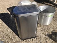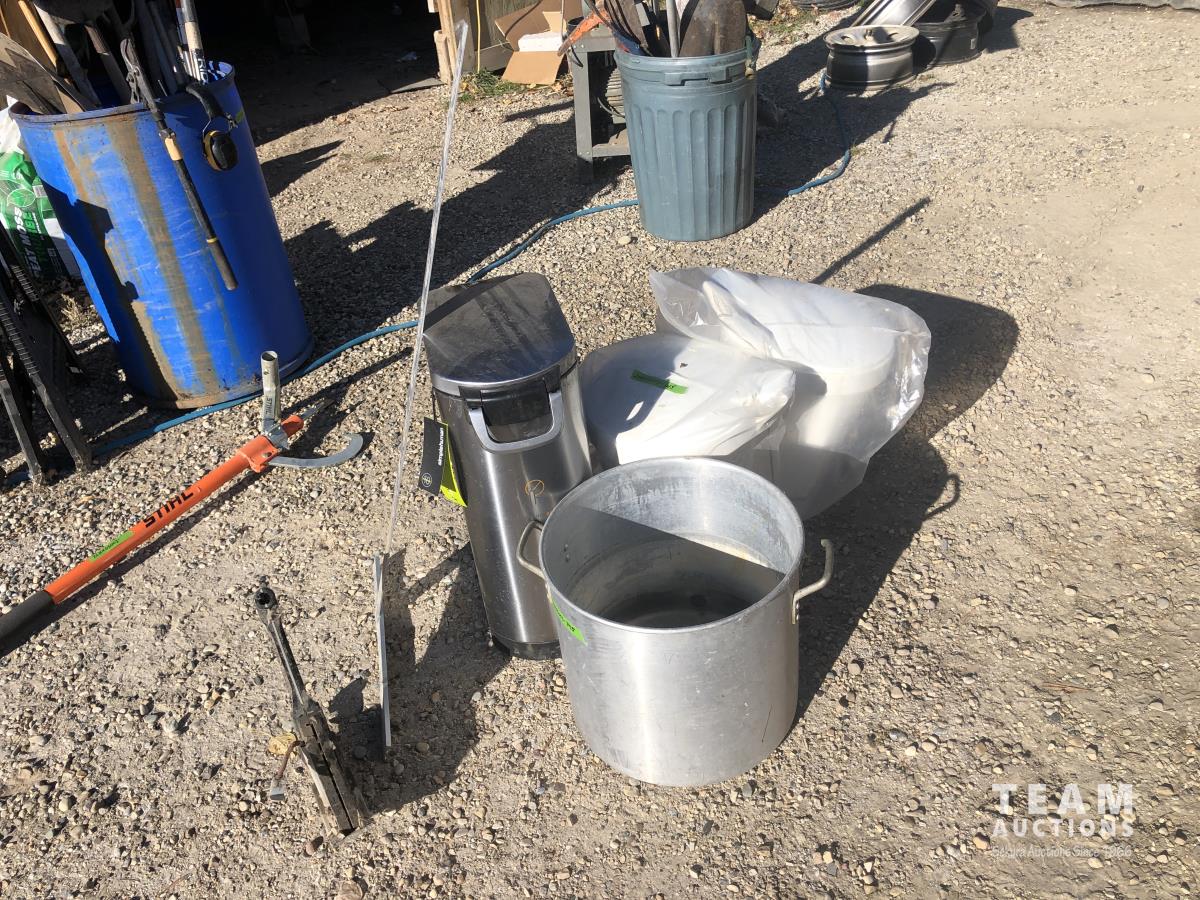 Flooring nailer, (2) Poly garbage cans, stainless steel garbage can, 48 inch T square, turkey cook pot