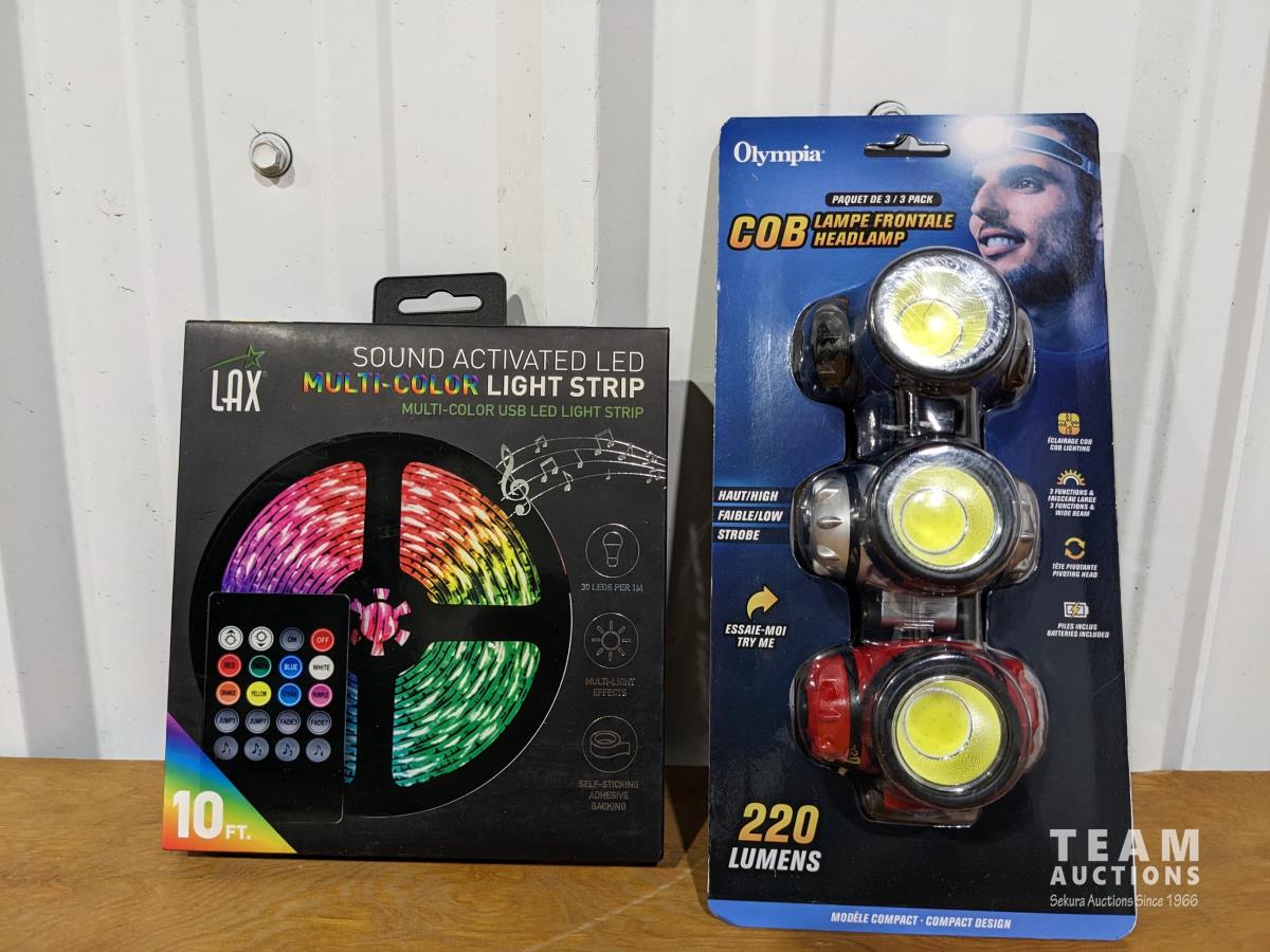 1028 (3) Pack of Cob Headlamp & 10 Ft LED Sound Activated Light Strip (Unused)