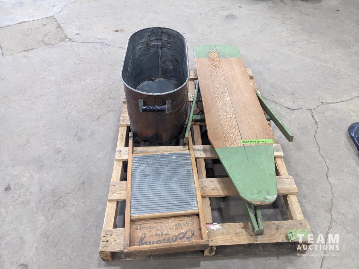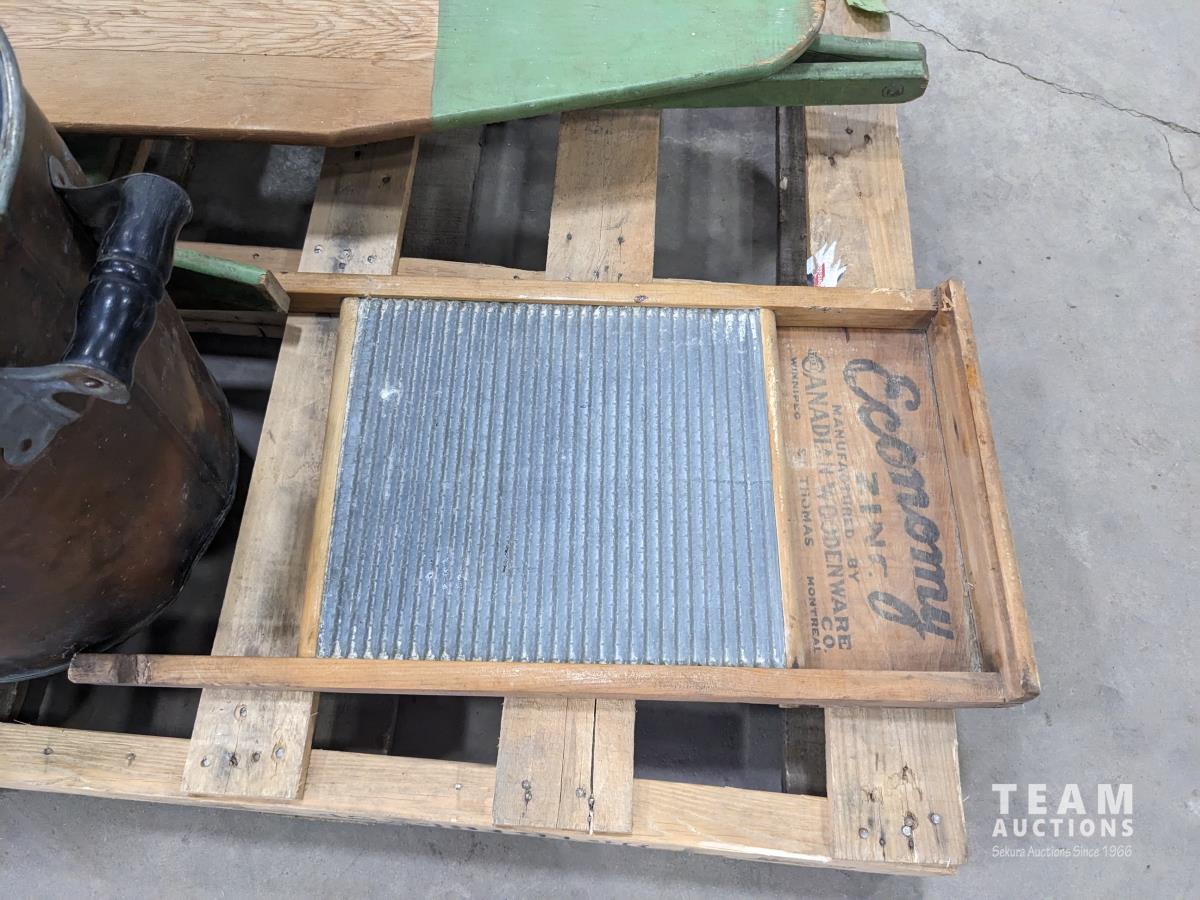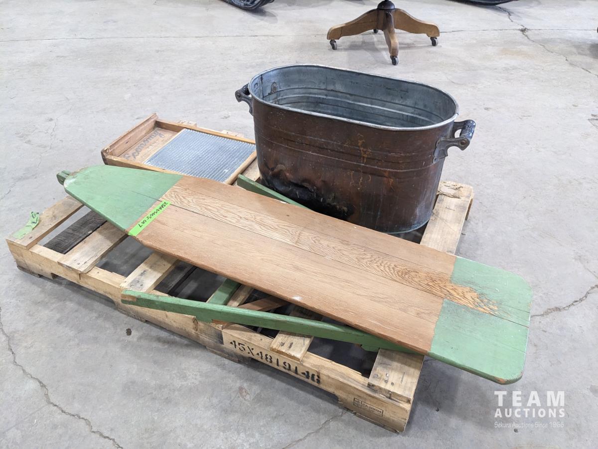 1501 Antique Ironing Board, Copper Boiler, Wash Board