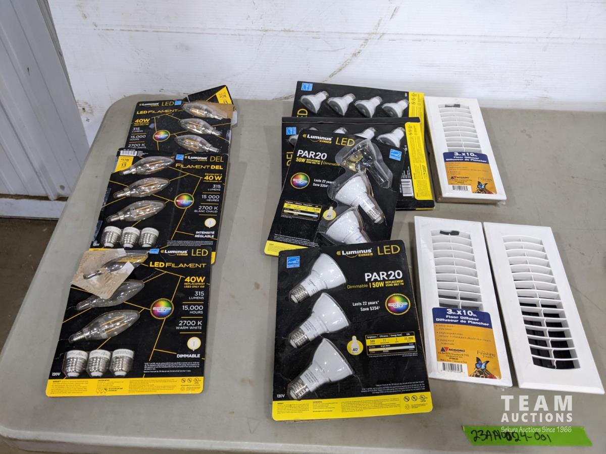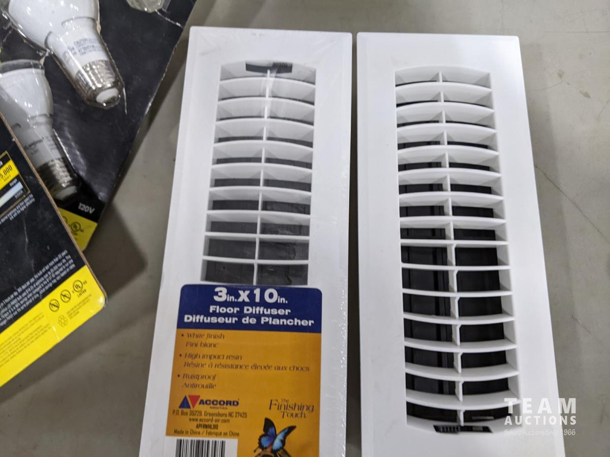 1040 Assorted Light Bulbs, (3) 3 Inch X 10 Inch Floor Diffuser Registers