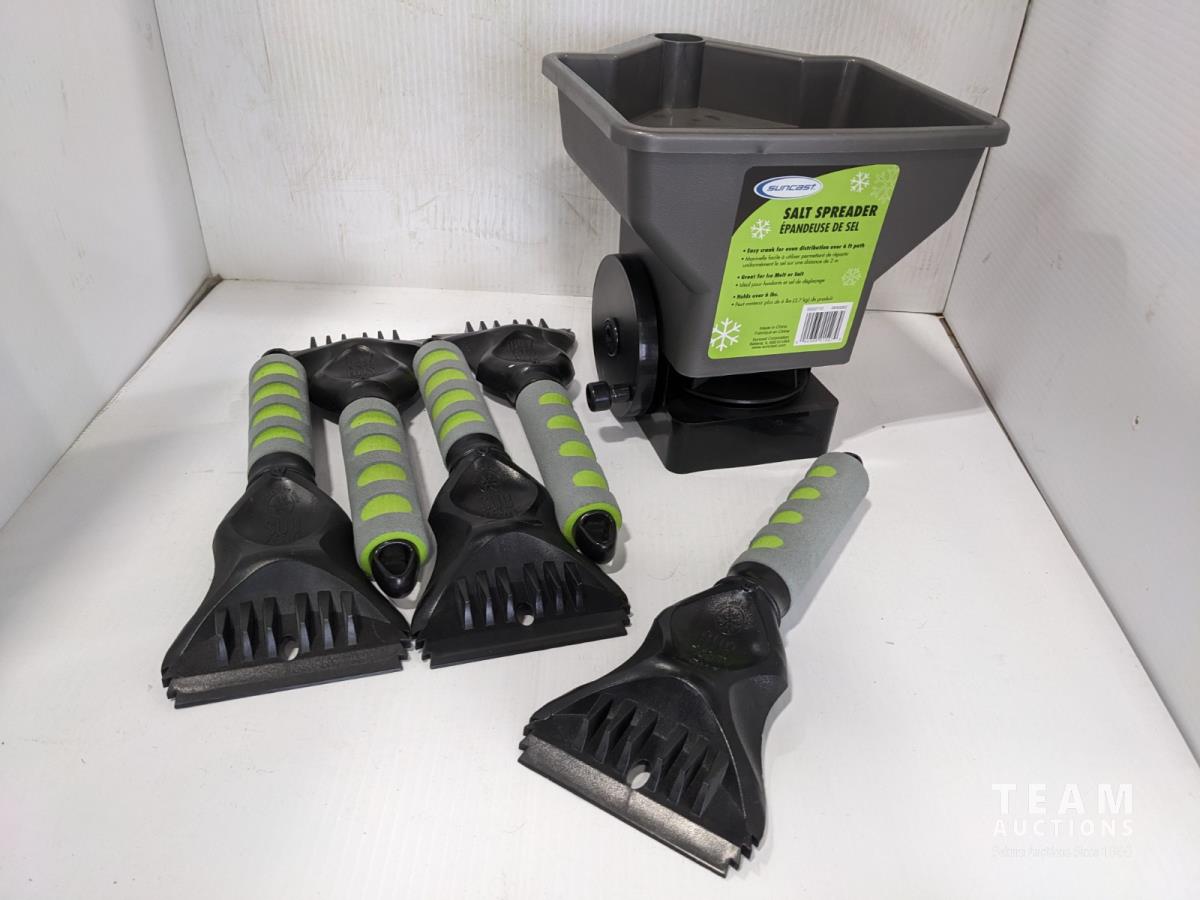 1643 Handheld Salt Spreader, (5) Hand Ice Scrapers (Unused)