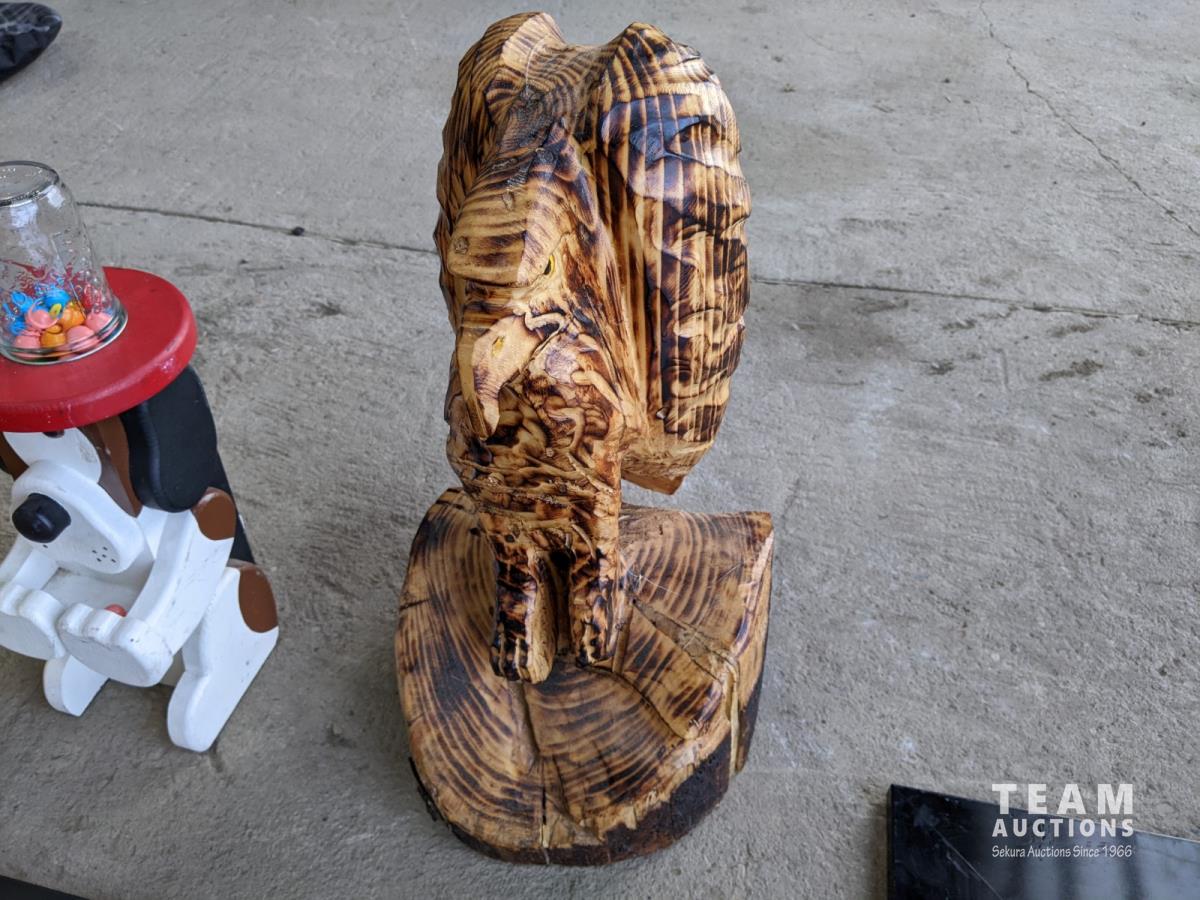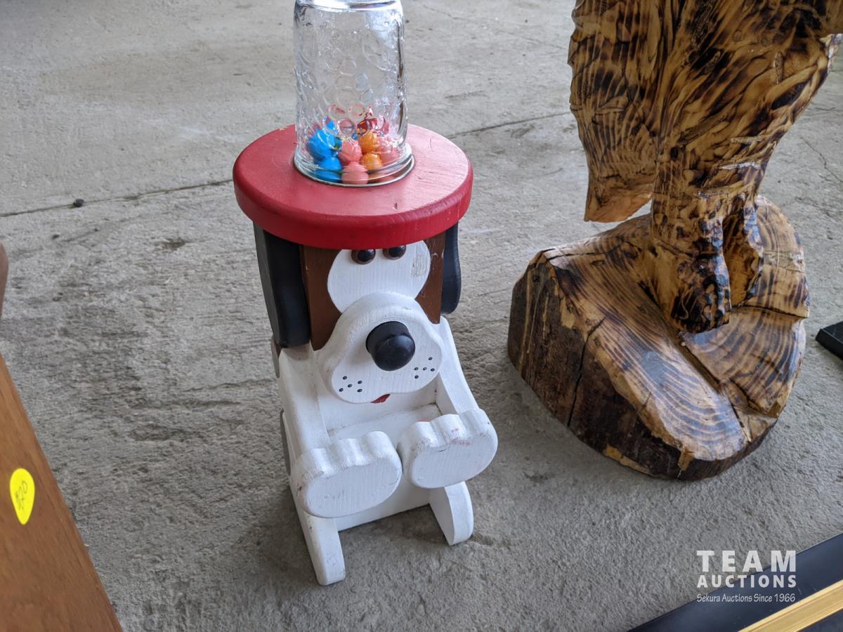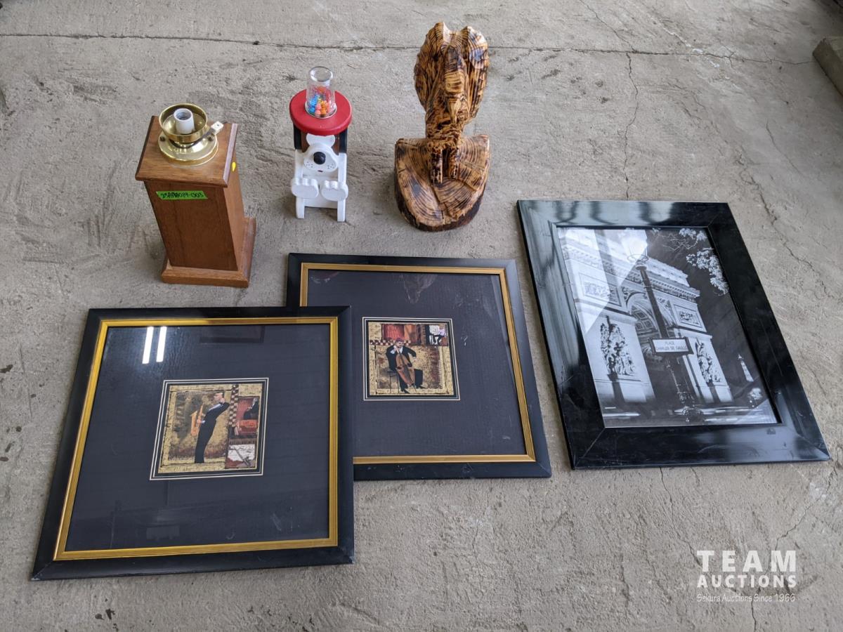 3 pictures, wooden eagle, gumball dispenser, lamp