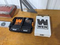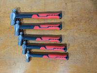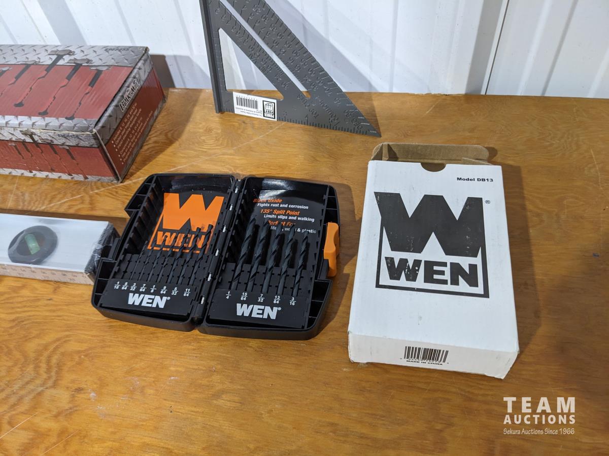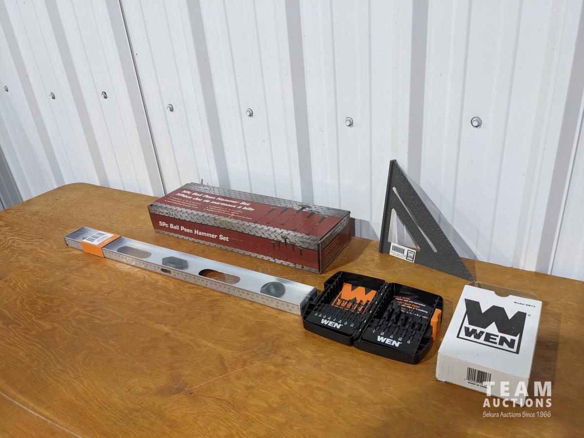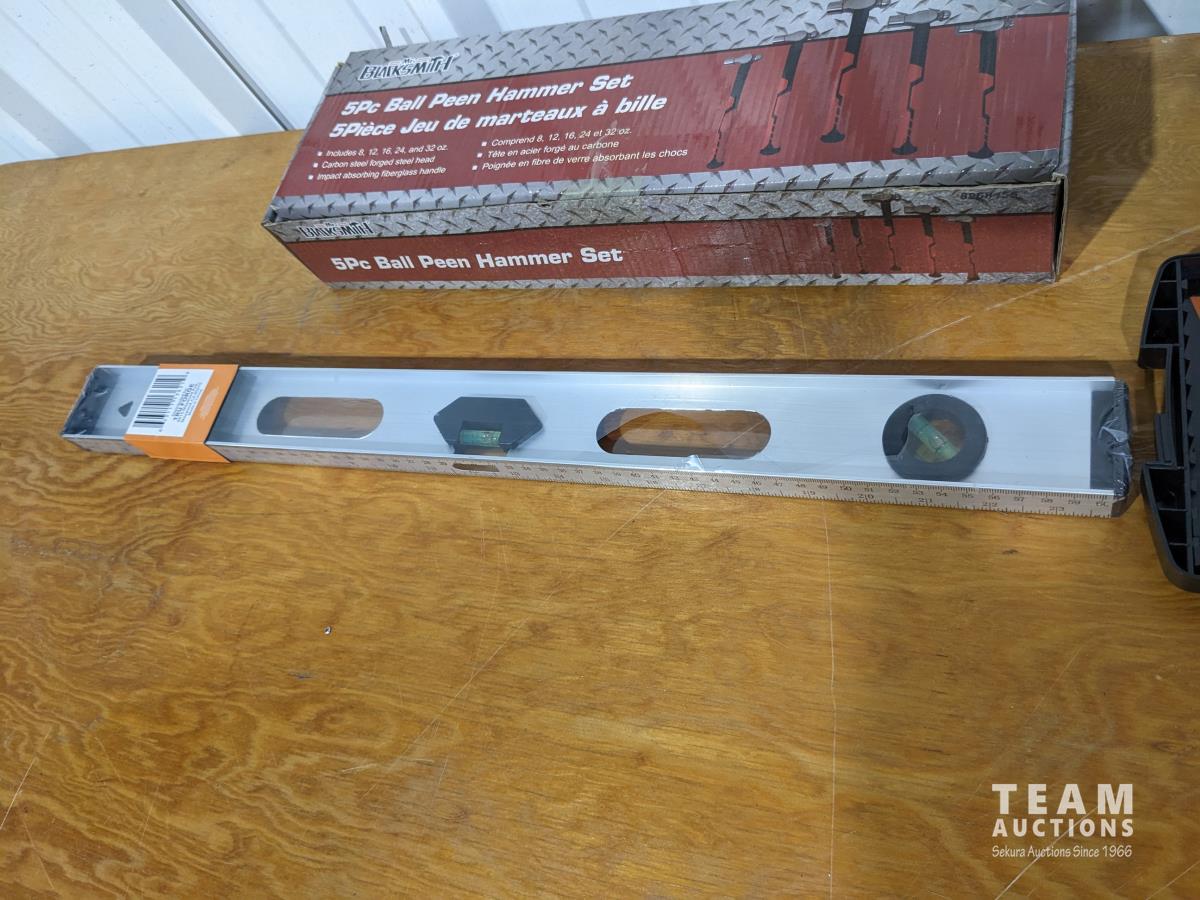 (5) piece ball peen hammer set, (1) 2 ft level, (1) small speed square, (1) drill bit set