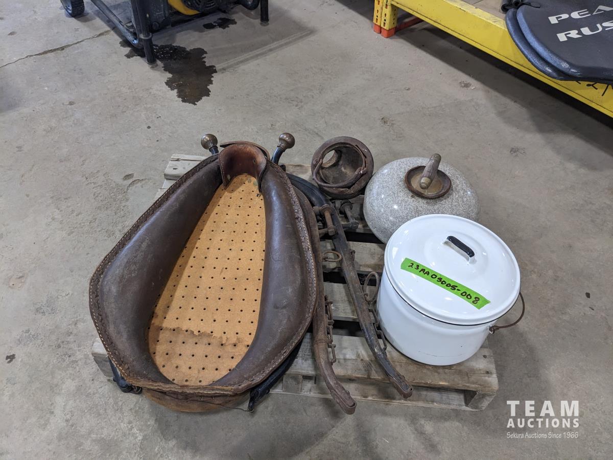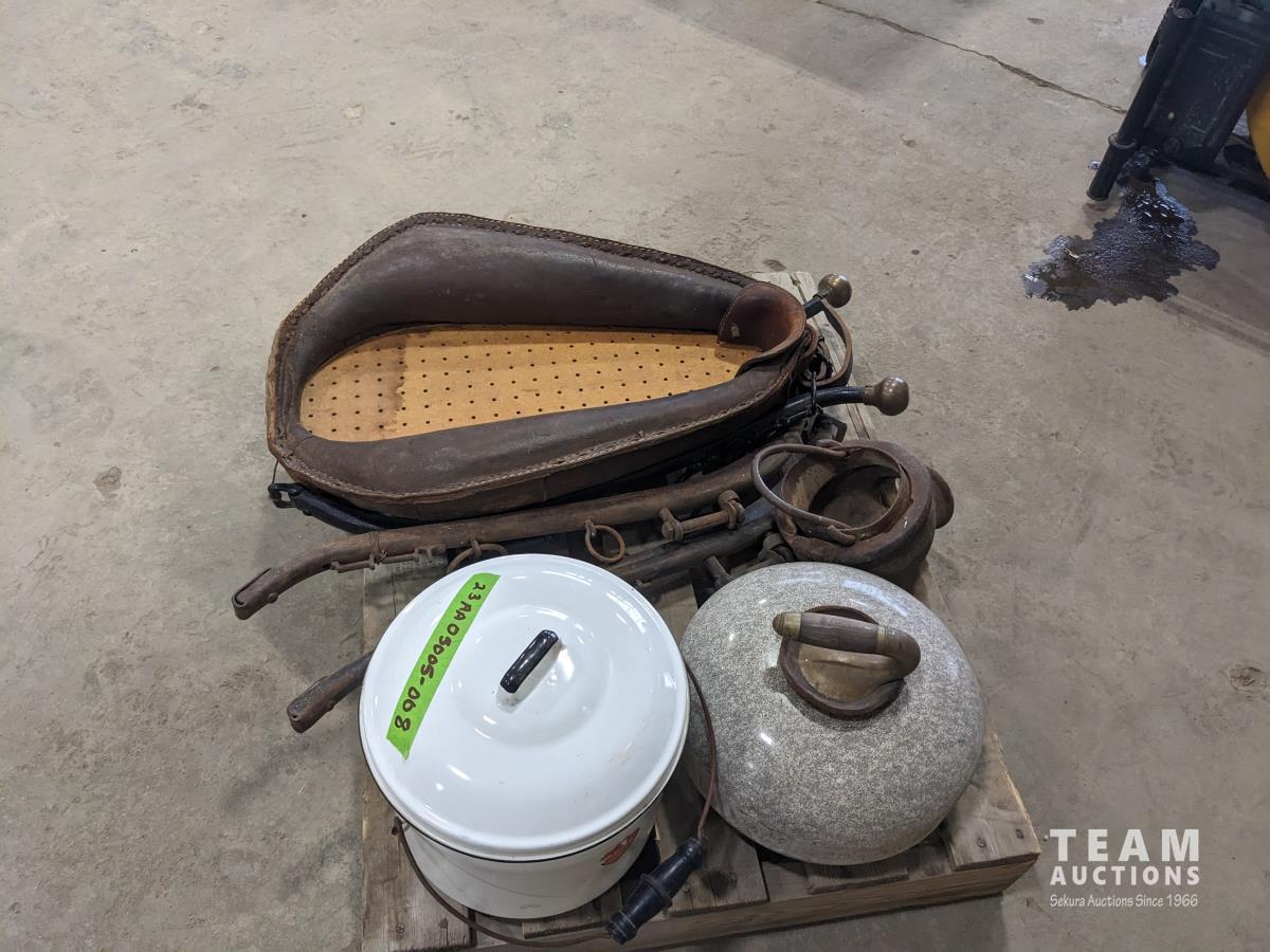 Chamber pot with lid, water diverter, set of hames, collar mirror frame with hames, curling rock