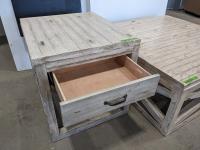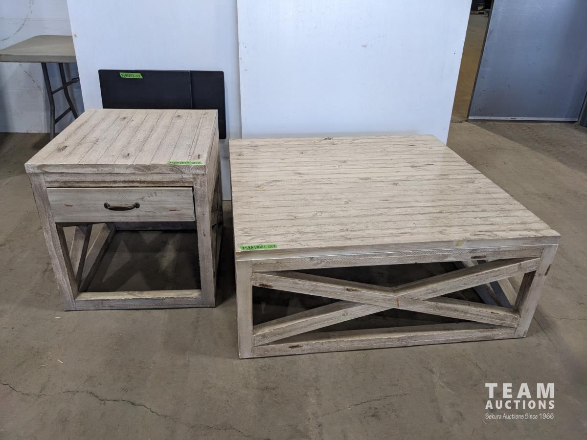 Coffee table 44 inch square x 18 inch H, end table 24 inch w x 28 inch d x 25 inch h