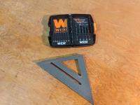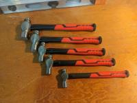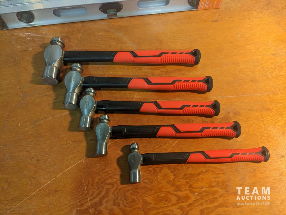(2) 2 ft levels, (5) piece ball peen hammer set, rubber mallet, 1/16 to 1/4 inch drill bit set, small speed square