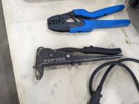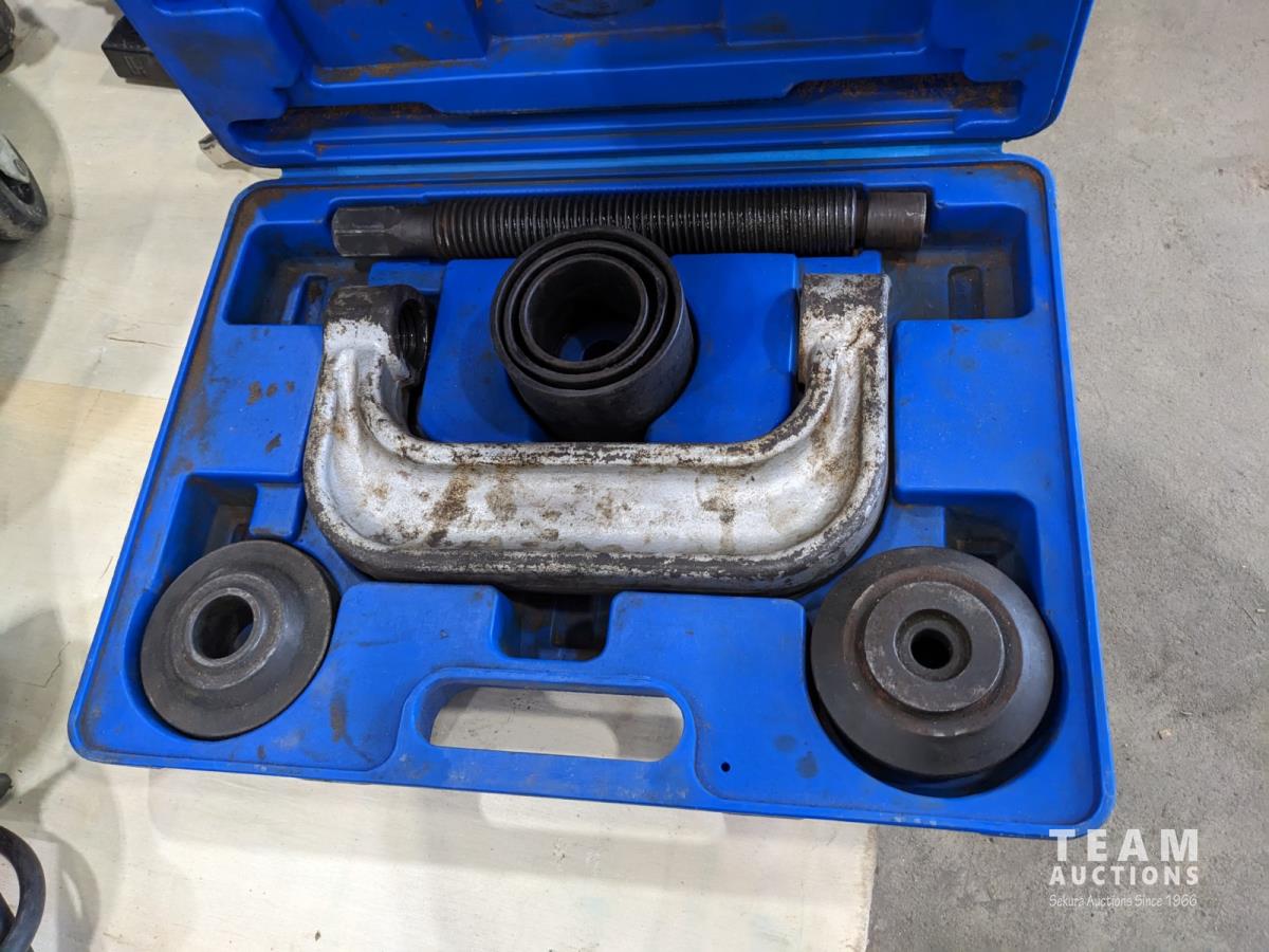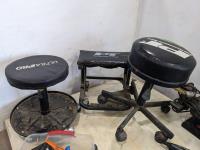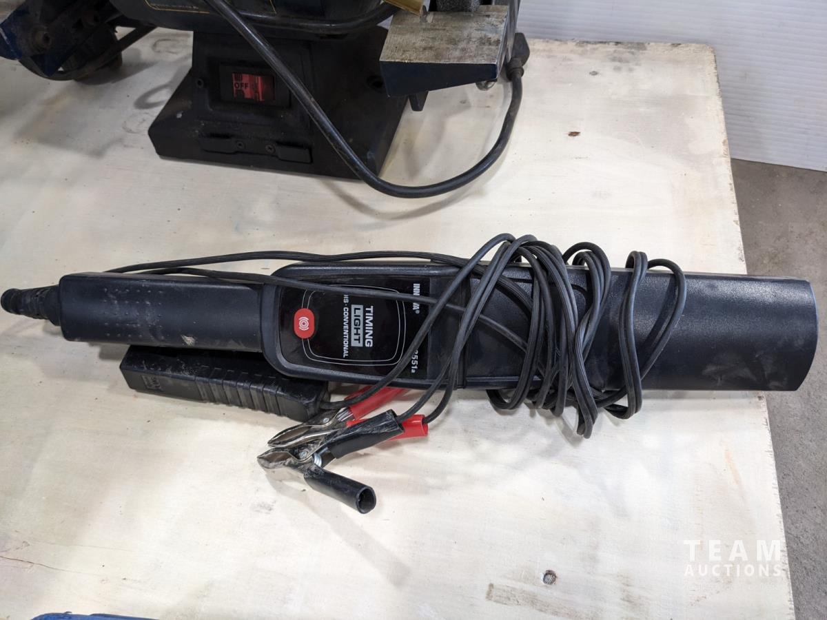(3) mechanic's wheeled stools, rivet setter, Mastercraft 6 inch bench grinder, timing light, Makita 5 inch angle grinder, ball joint press