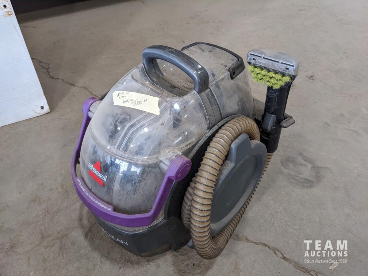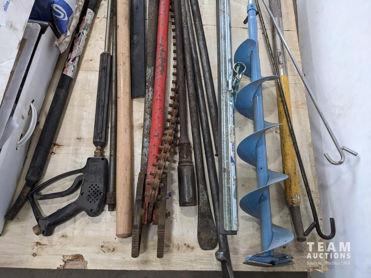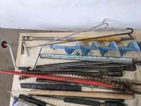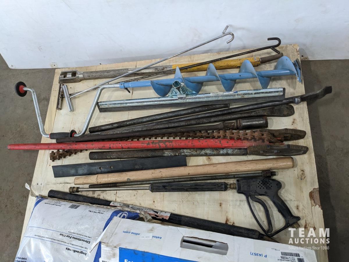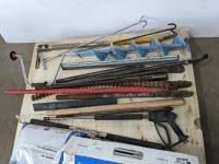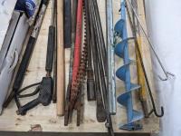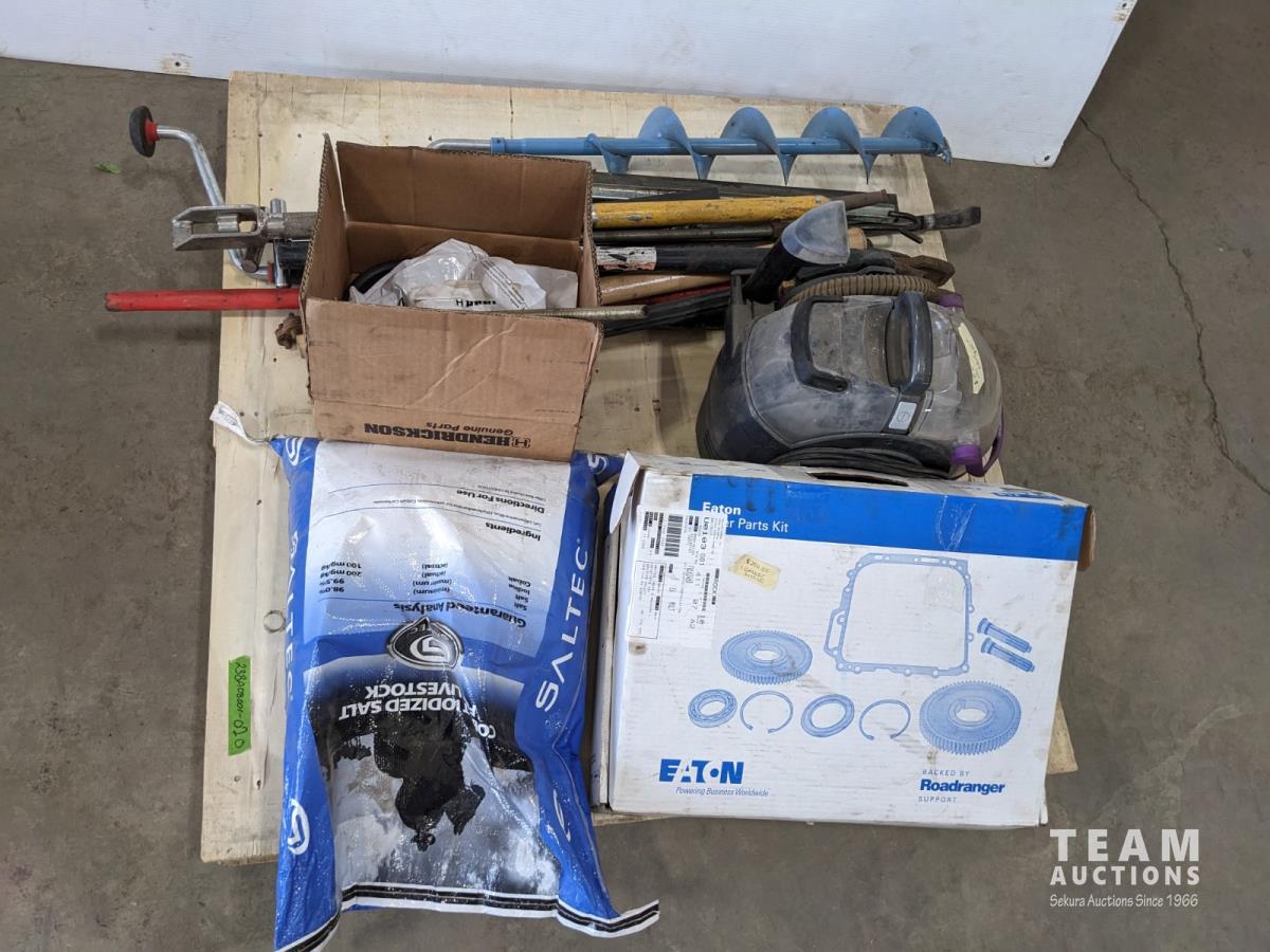 Bag of livestock mineral, Eaton fuller transmission parts, (2) fifth wheel pullers, (2) snipes, chain wrench, tire tools, Bissell carpet cleaner