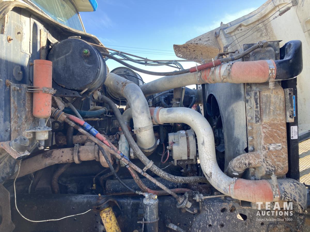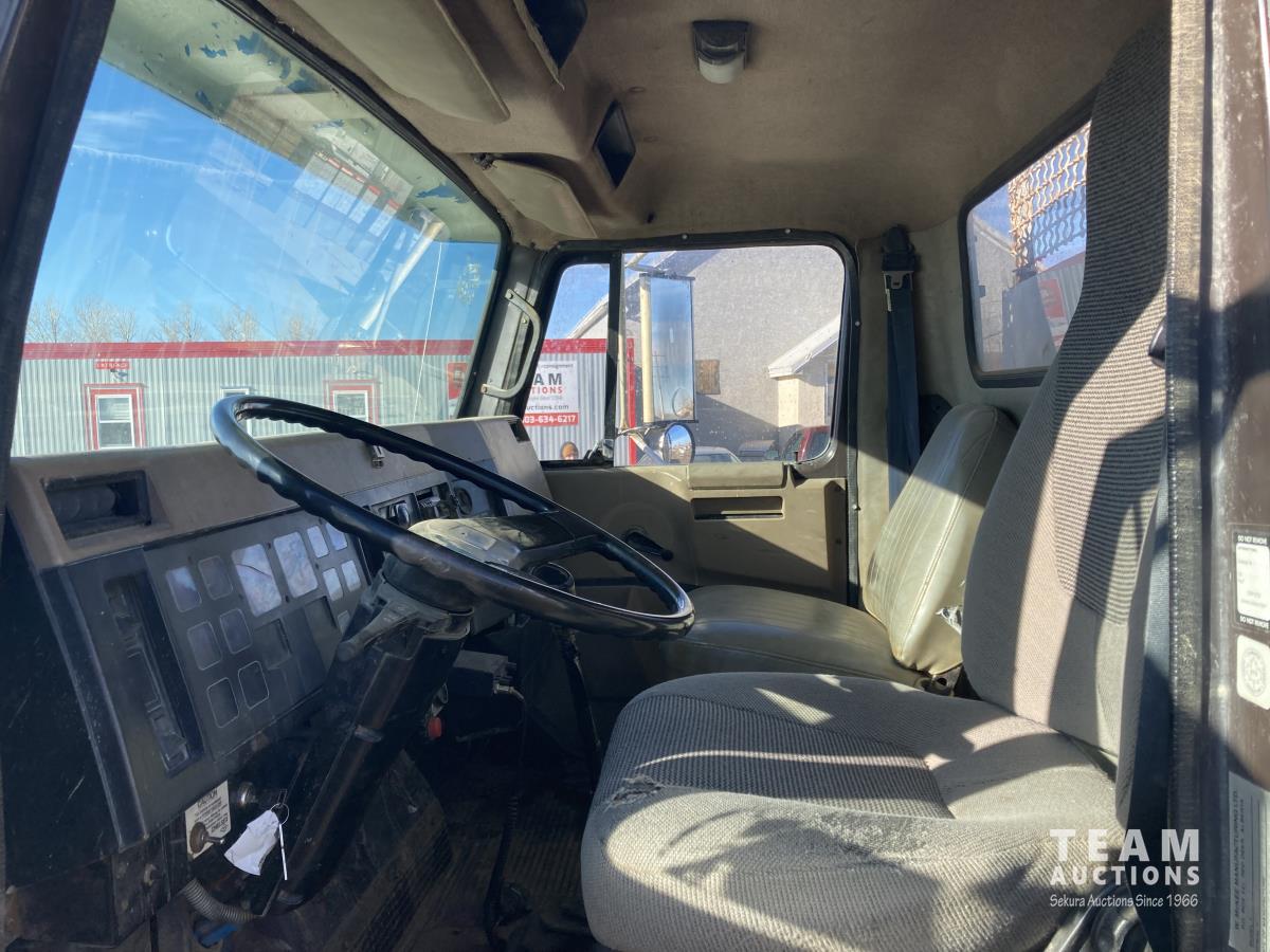 International 7.6 L L6 diesel engine, Eaton Fuller 10 speed manual transmission, stereo, spring suspension, 12,000 lb front axle, 20,000 lb rear axles, 240 inch WB, PTO, 16 ft long steel box, power divider lock, hoist, 385/65R22.5 front tires, 11R22.5 rear tires