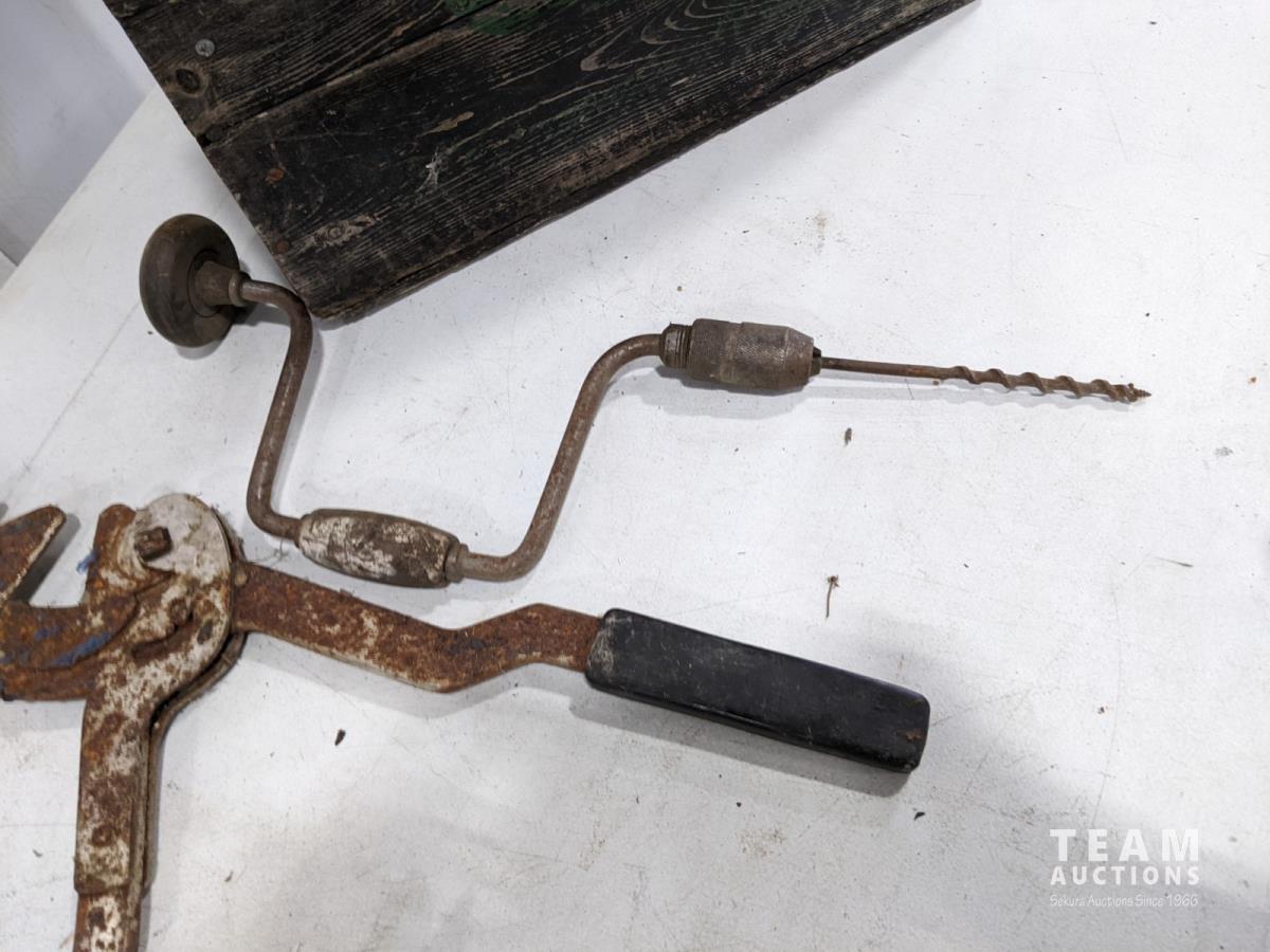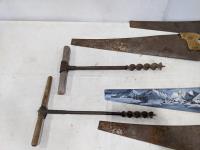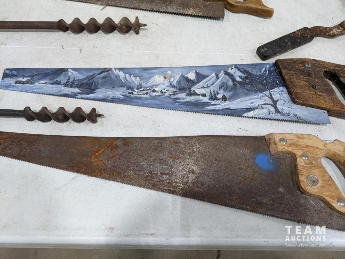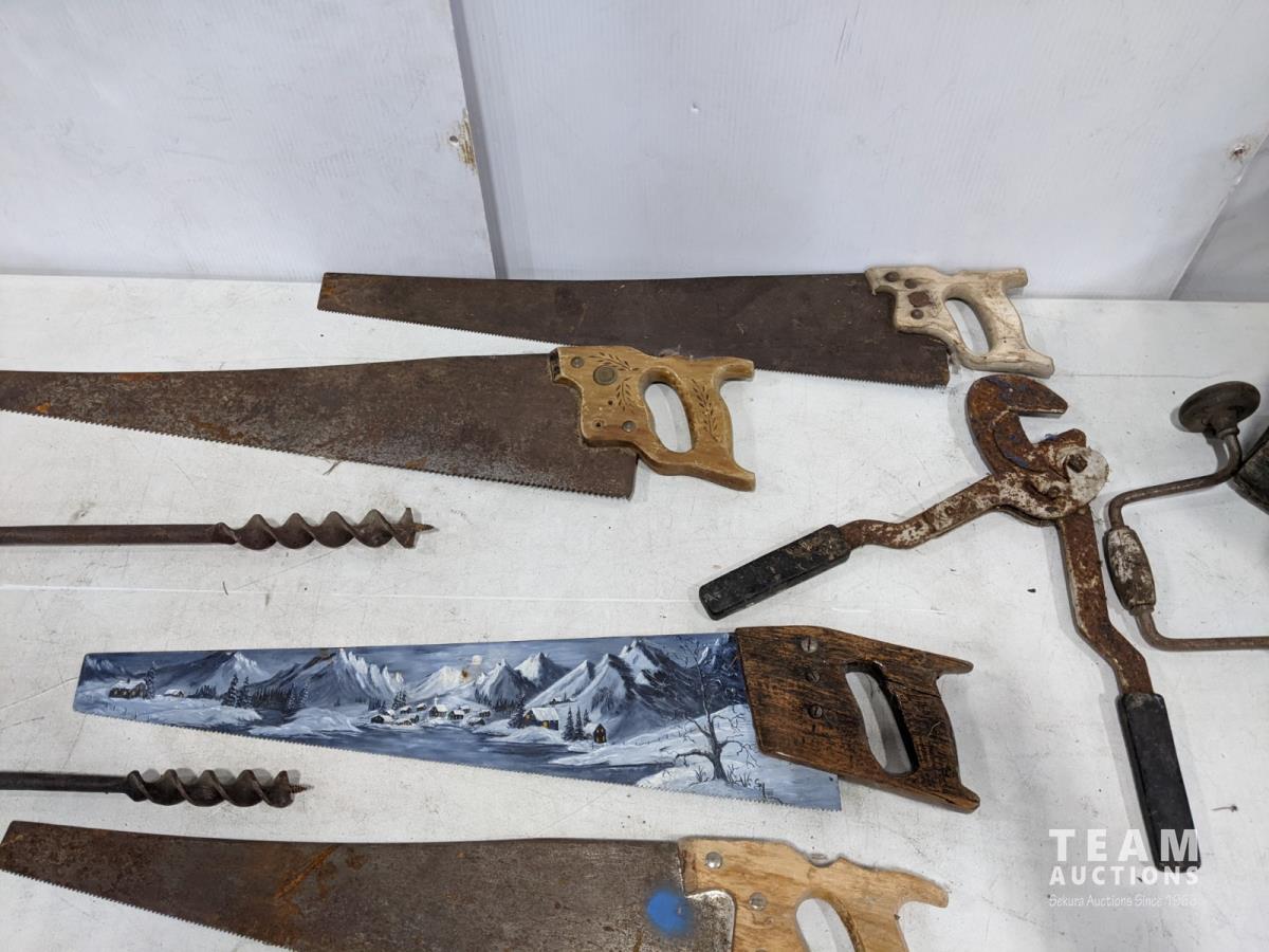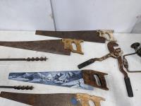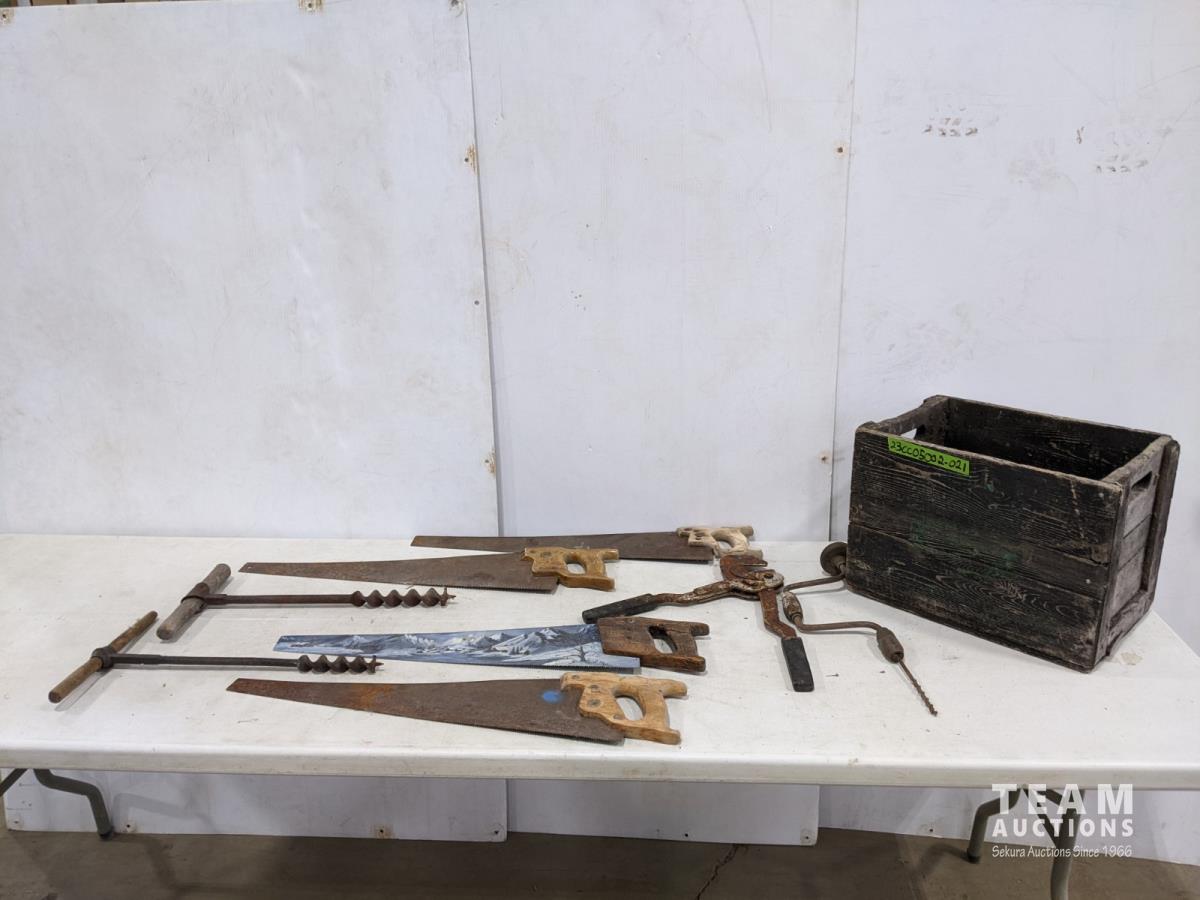 1429 (4) Hand Saws, (3) Hand Drills and Canada Dry Crate