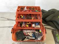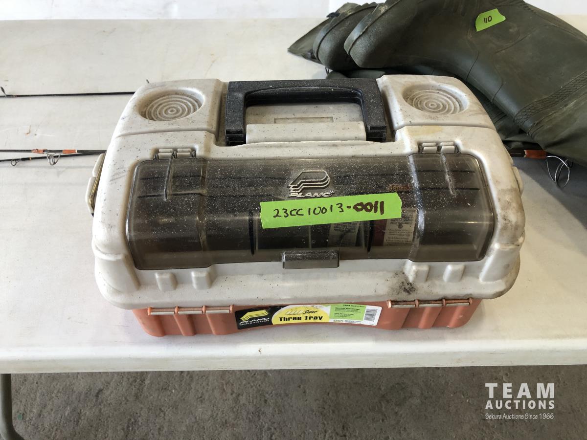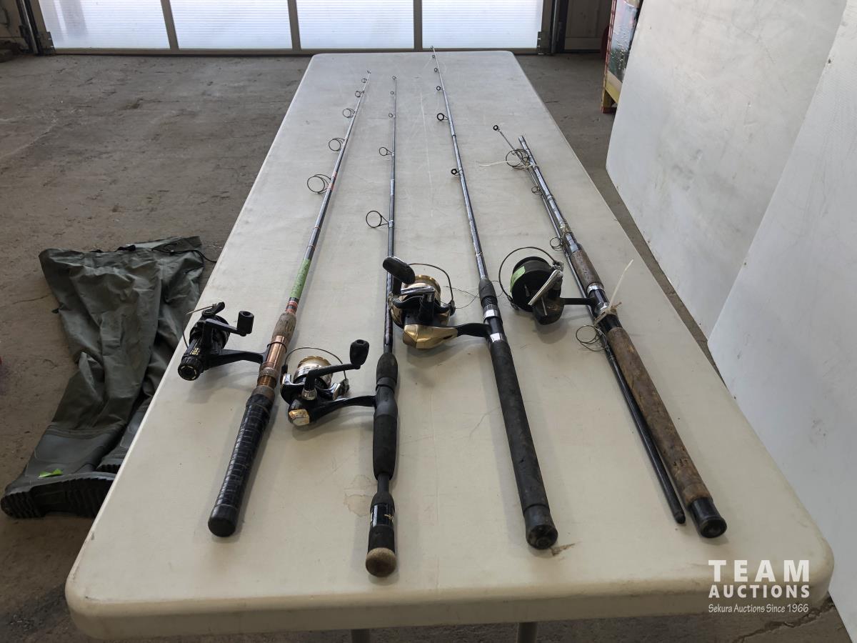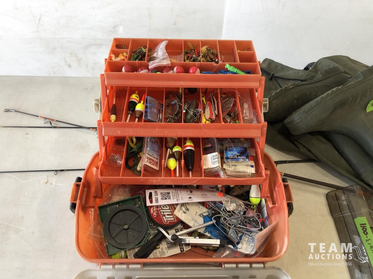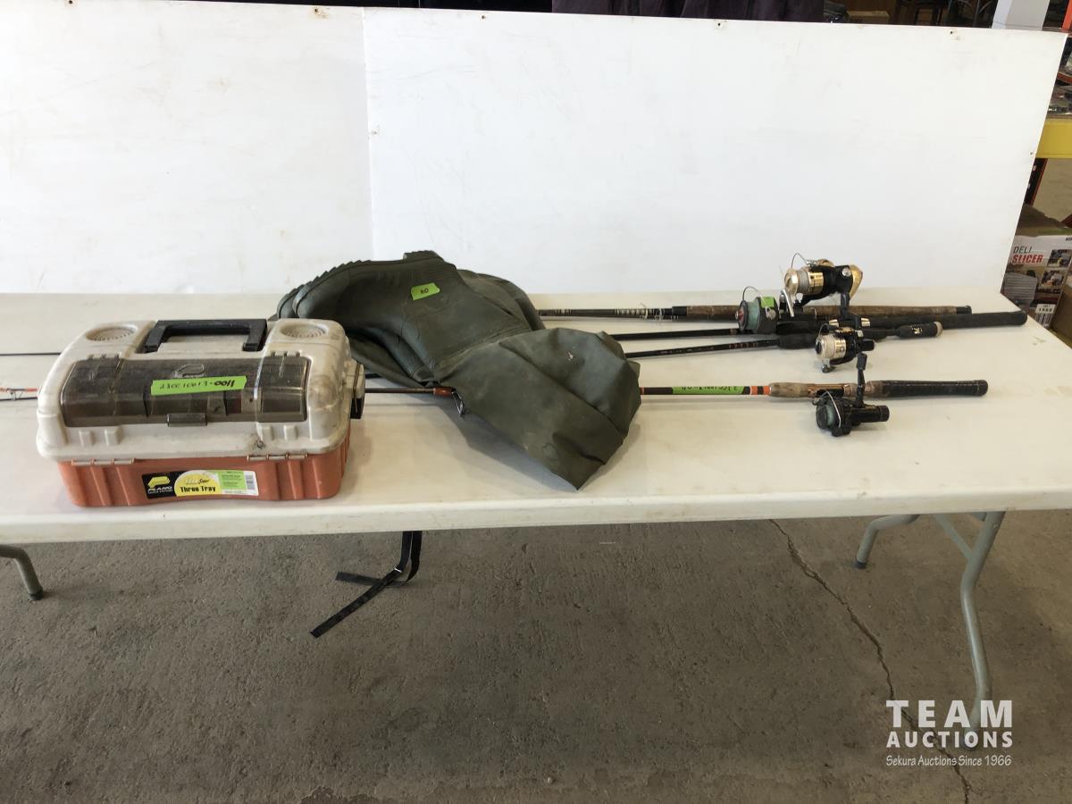 1023 (5) Casting Rods, Tackle Box with Tackle and Size 13 Hip Waders