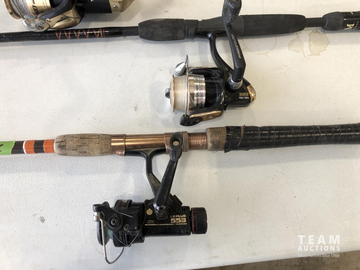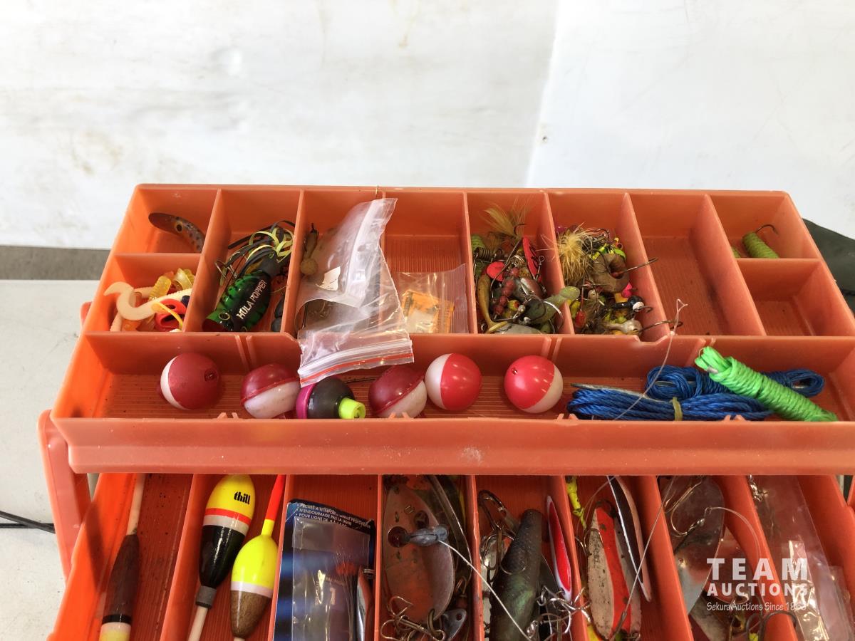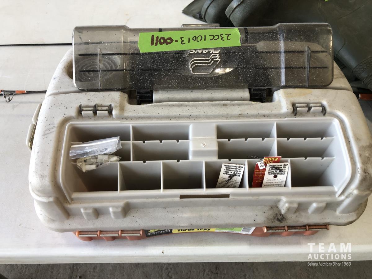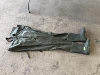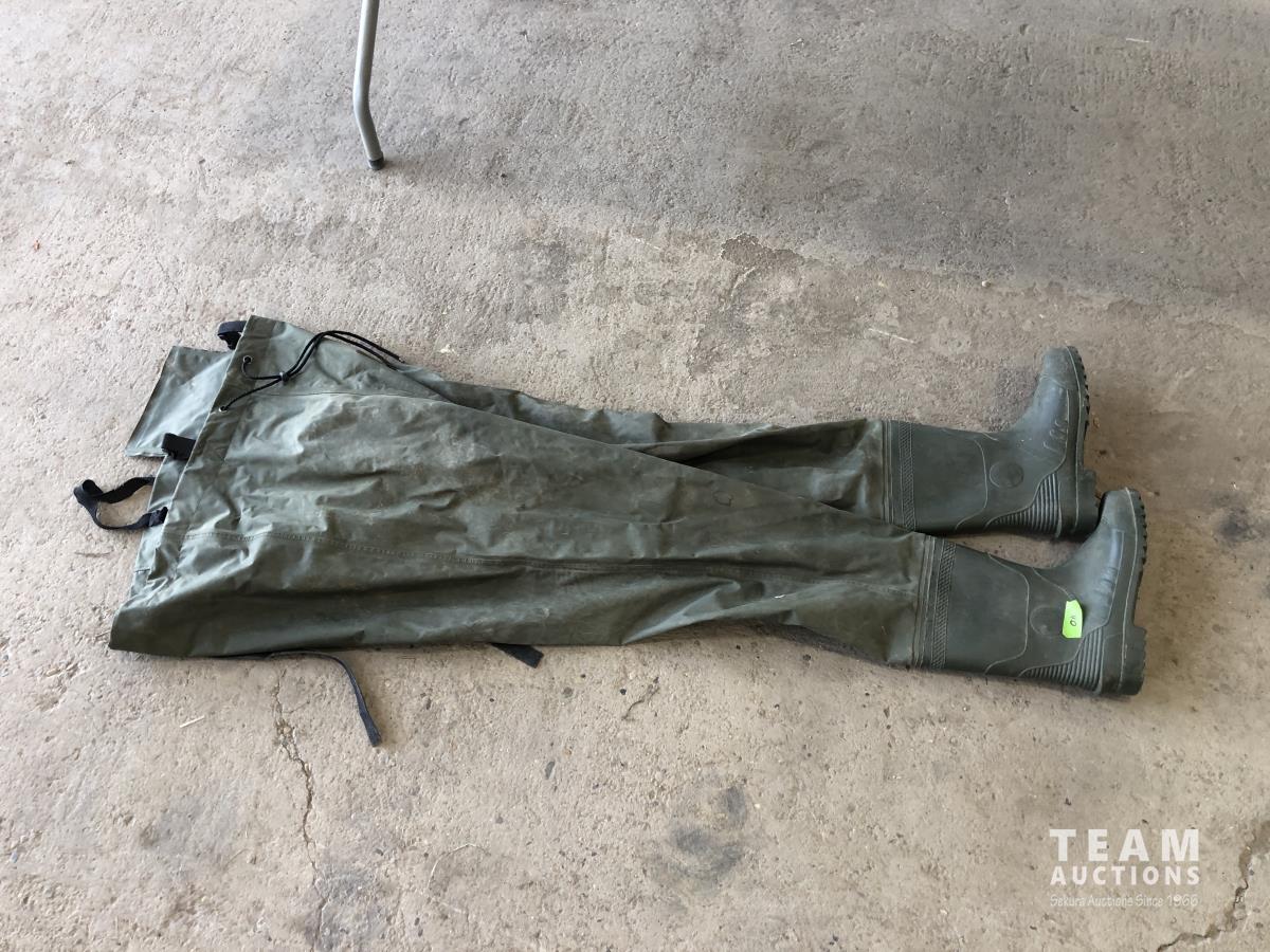 1023 (5) Casting Rods, Tackle Box with Tackle and Size 13 Hip Waders