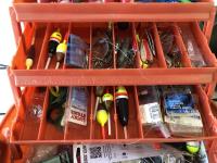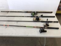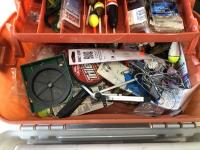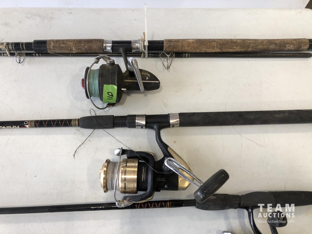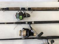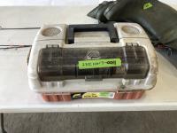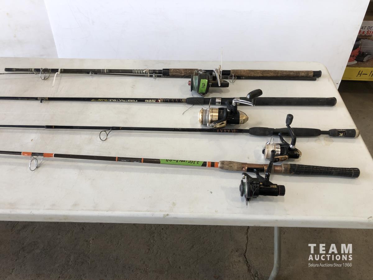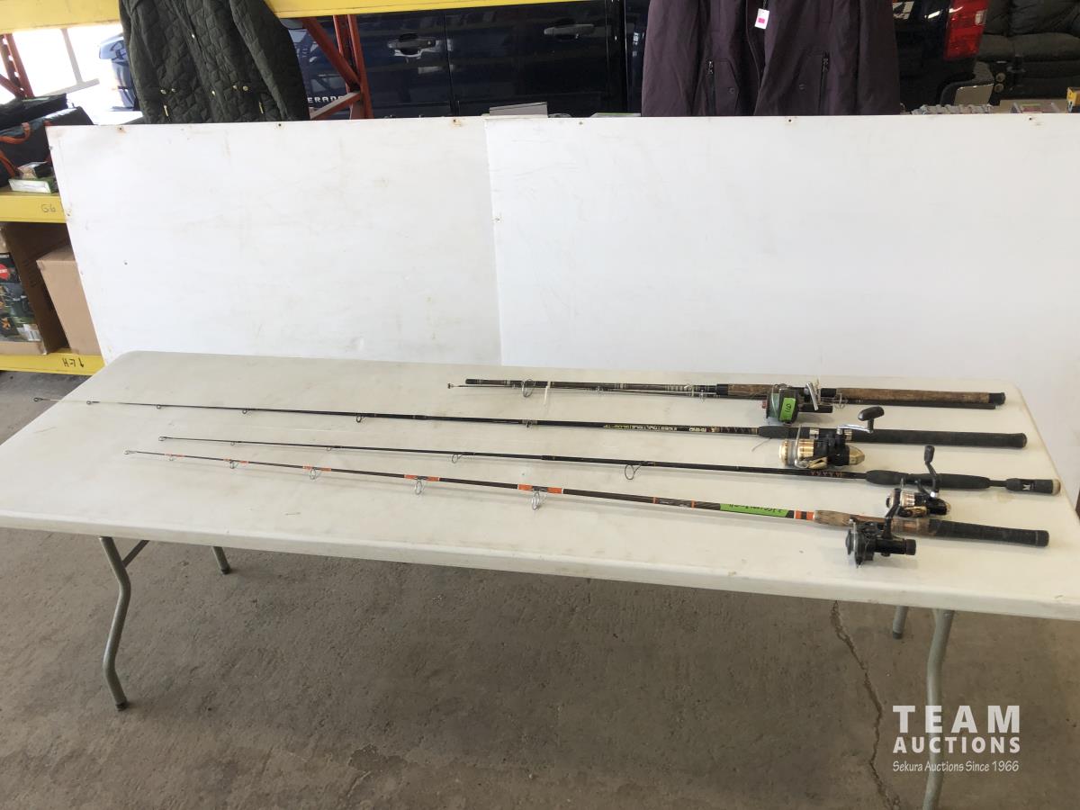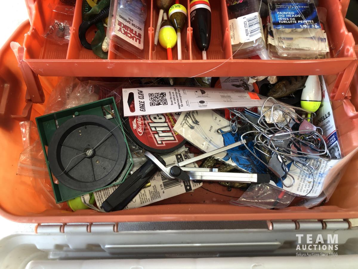 1023 (5) Casting Rods, Tackle Box with Tackle and Size 13 Hip Waders