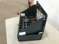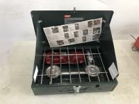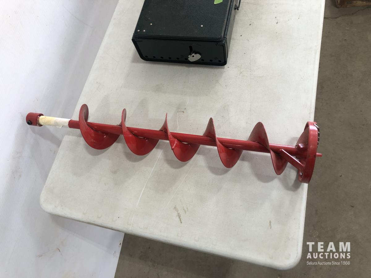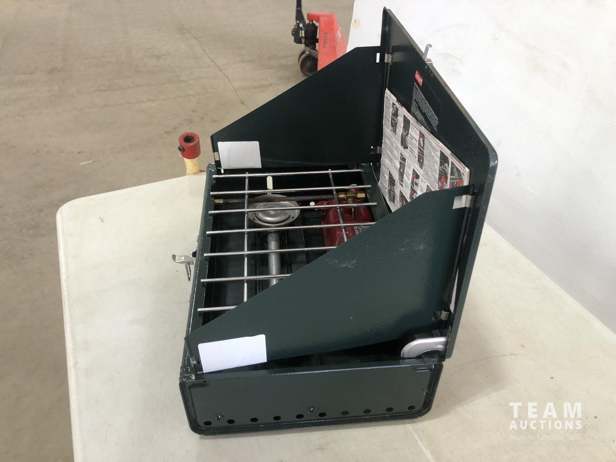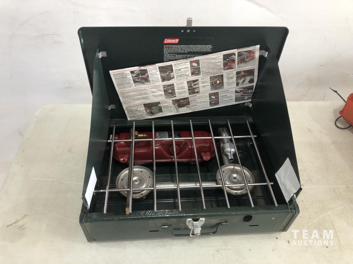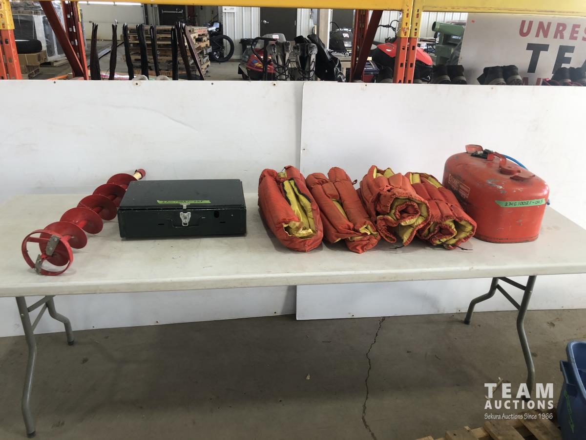 6 inch ice auger, coleman duel burner kerosene stove (new), (4) life jackets (sizes l-xl) and marine fuel tank