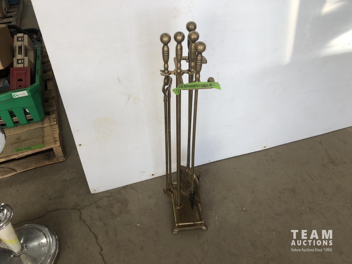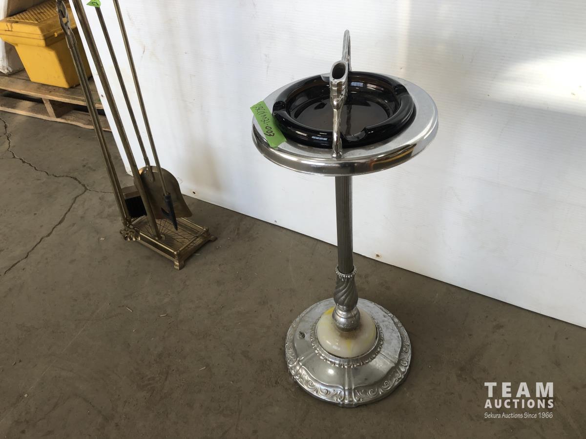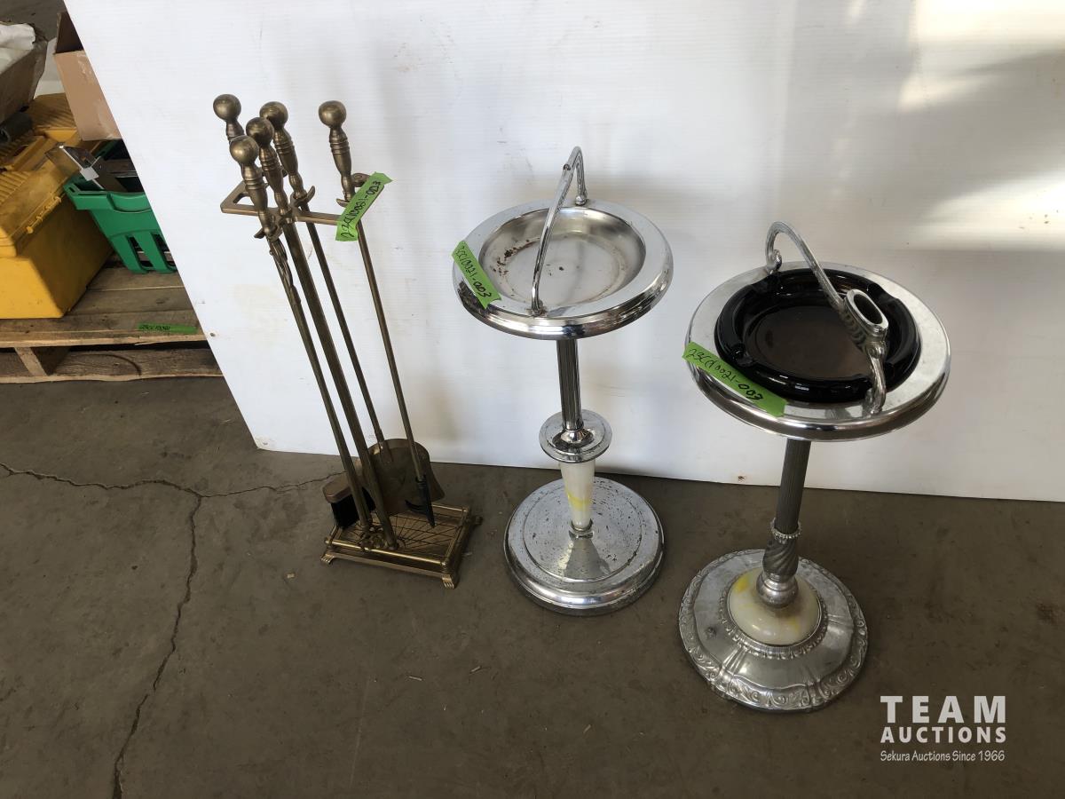 (2) Stand up vintage ashtrays and (1) bronze fire place poker kit and stand