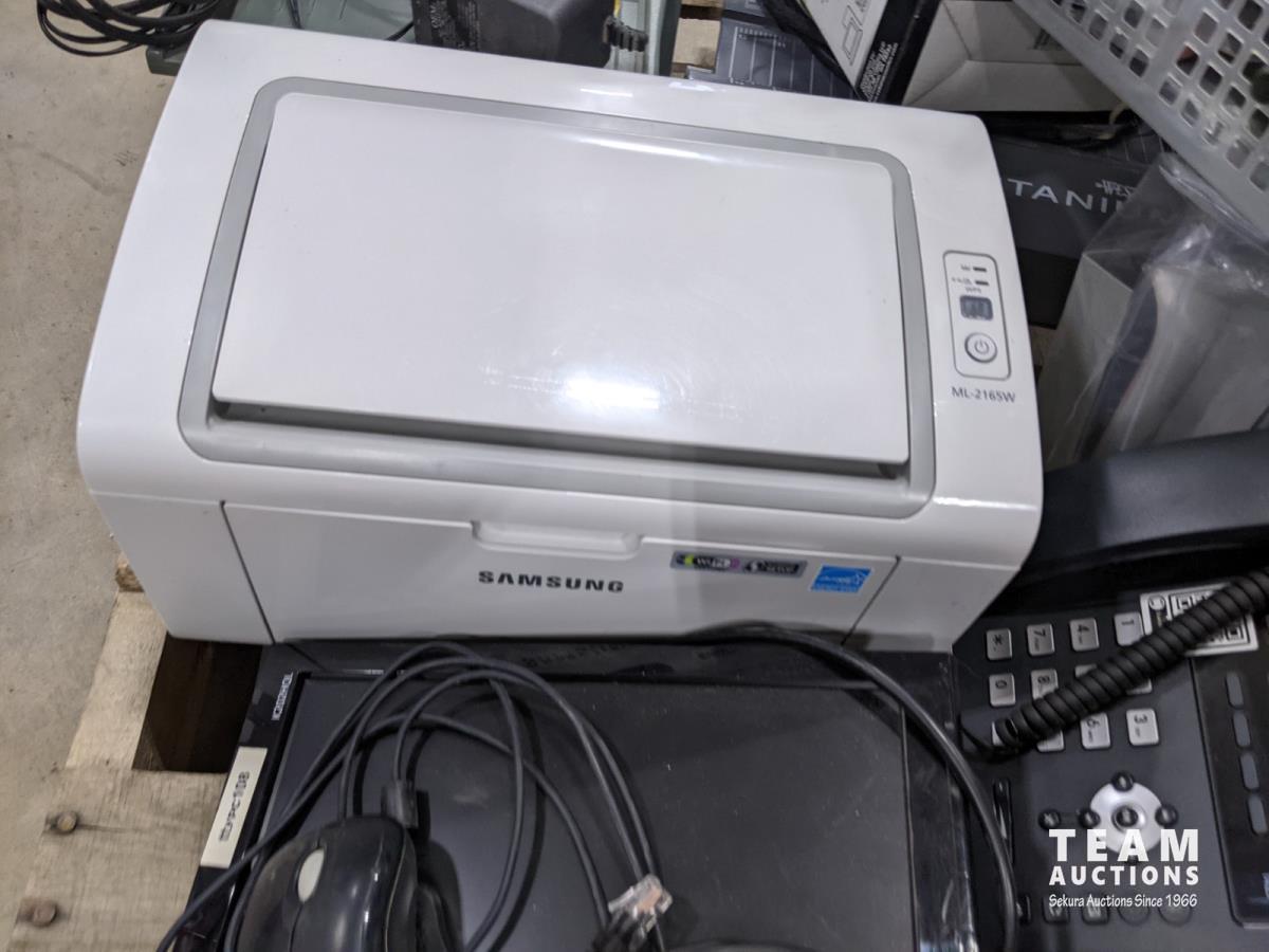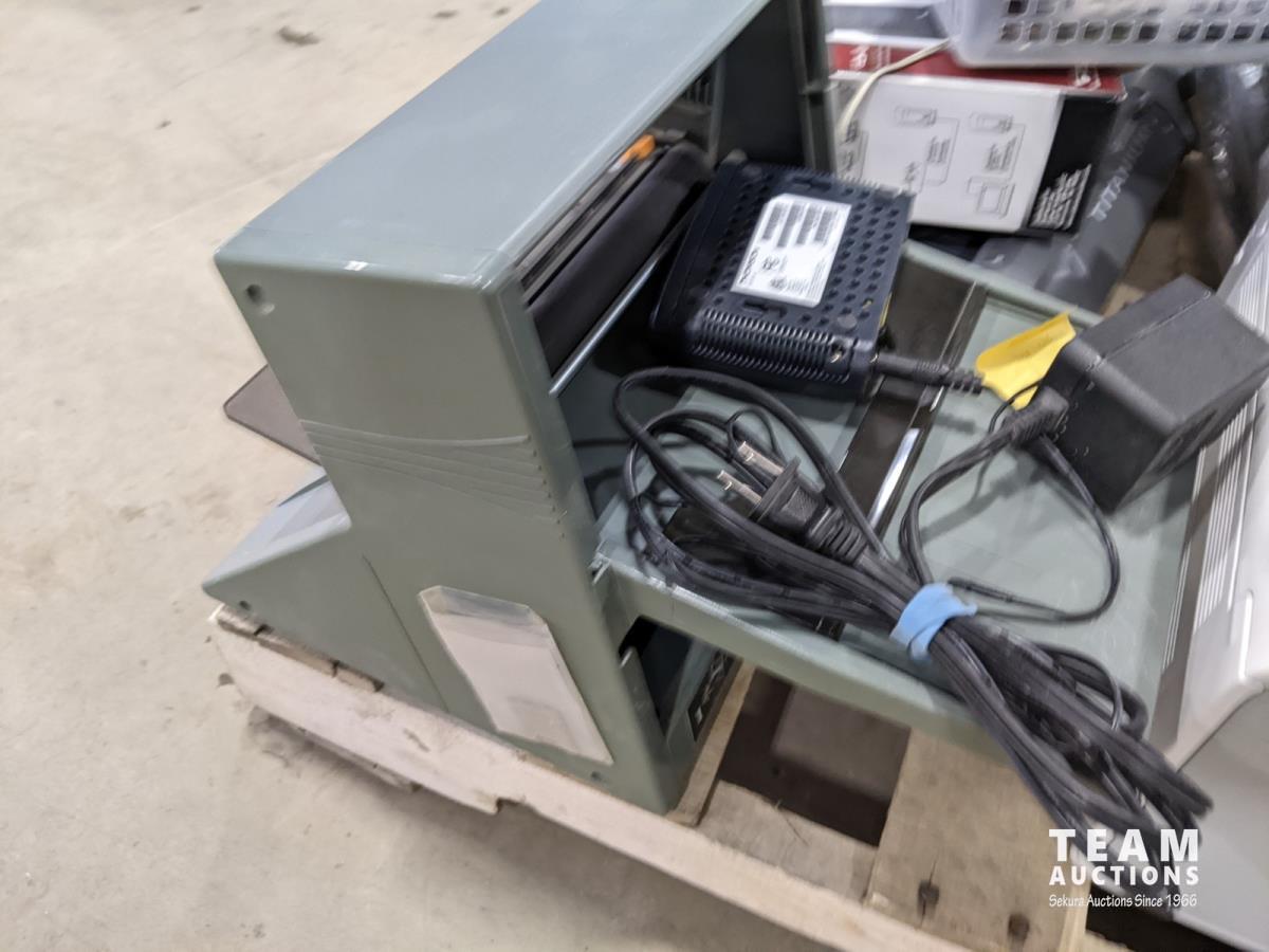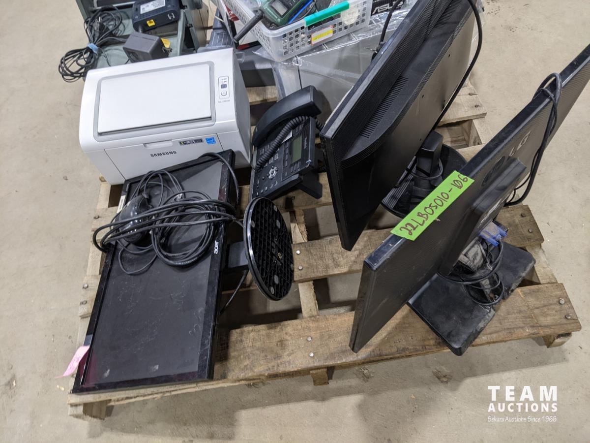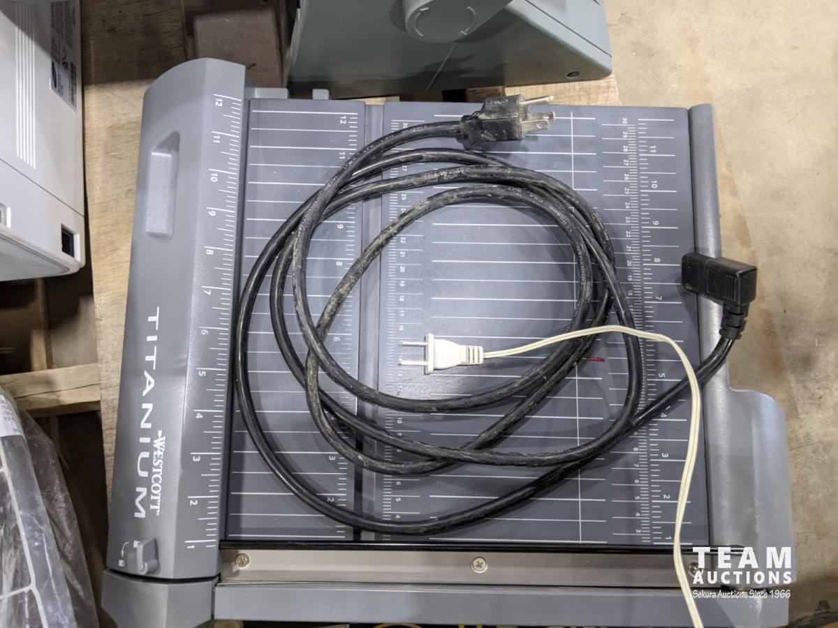 paper cutter, laminator, printer, (3) monitors, yealink phone