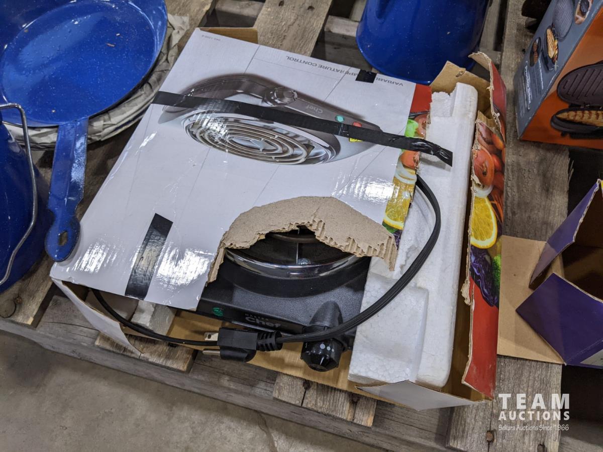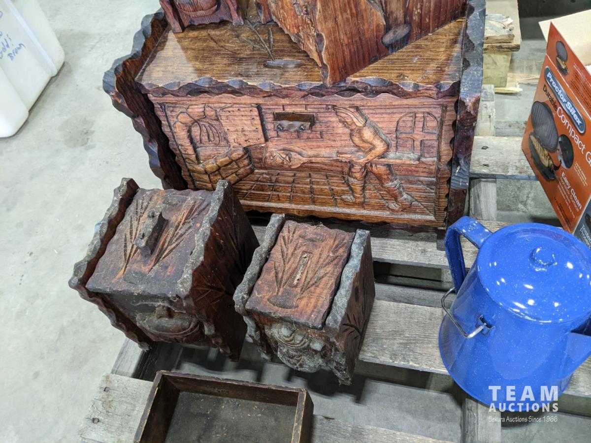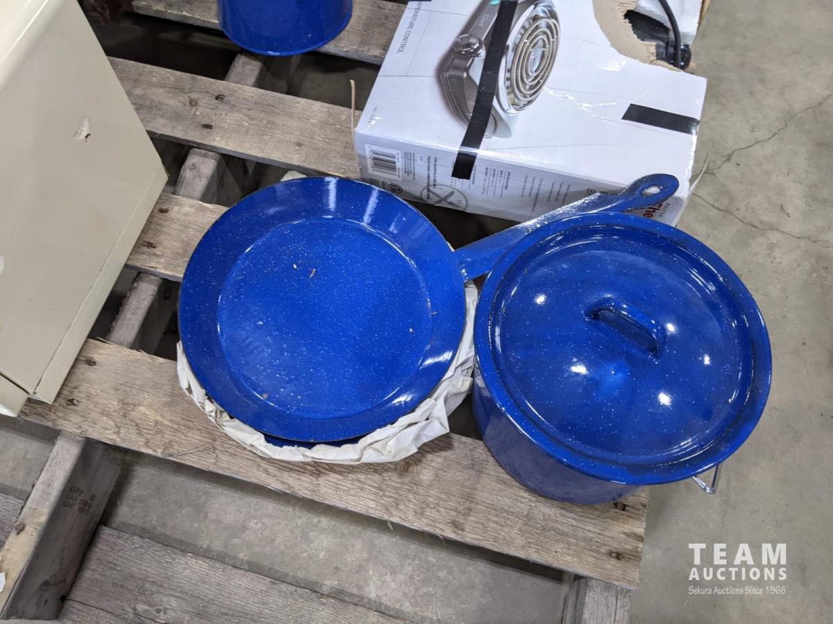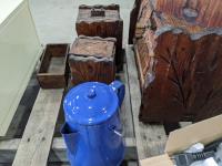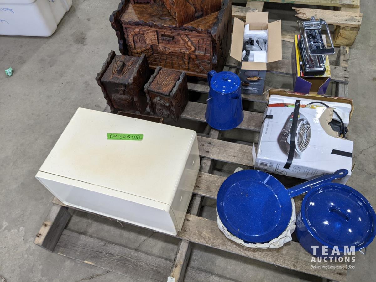 Burner, enamel dishes, wood boxes, bread box, fry maker