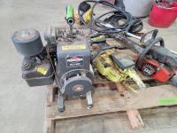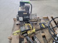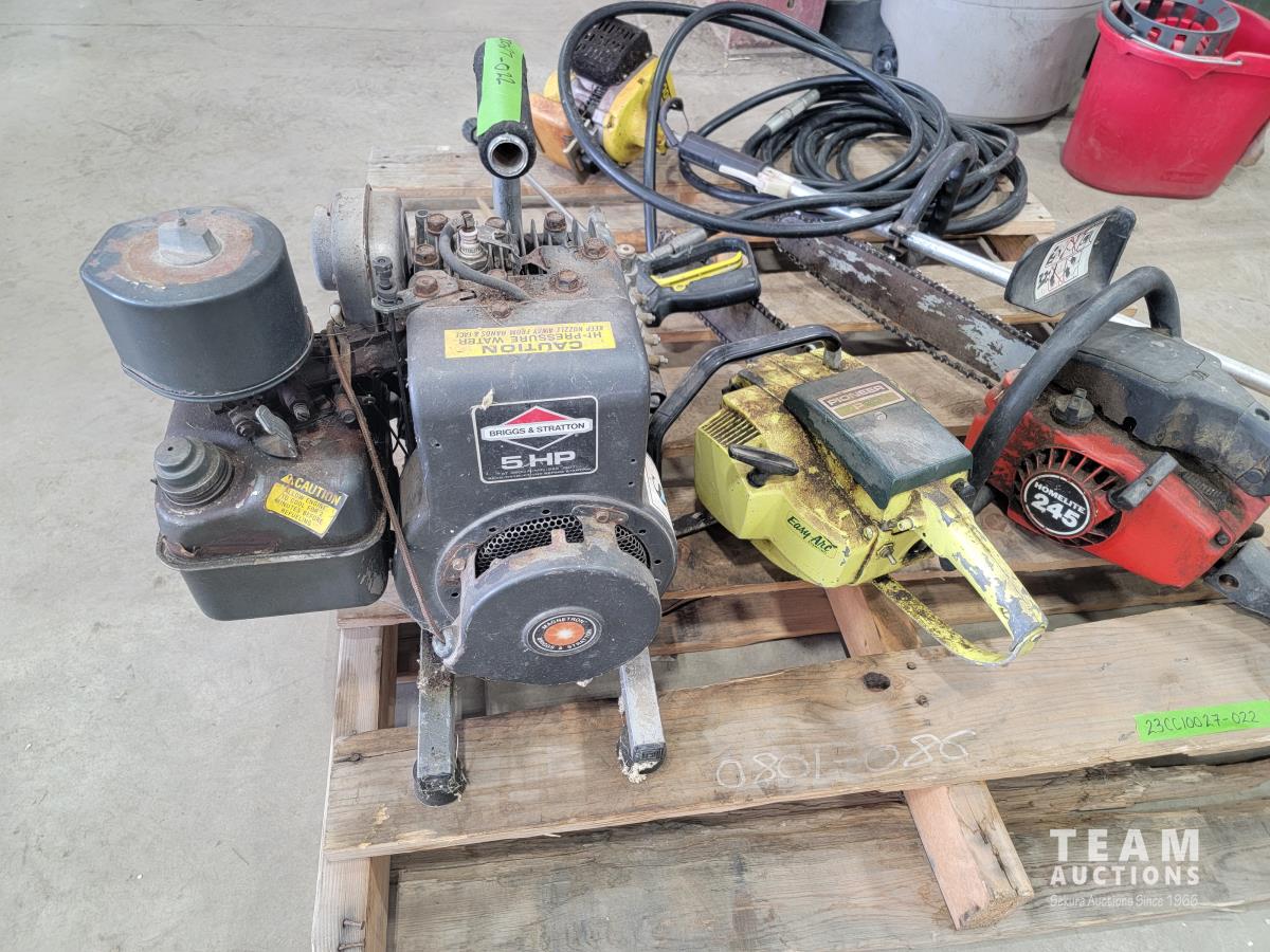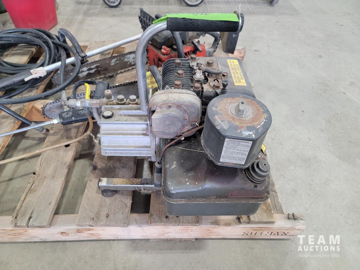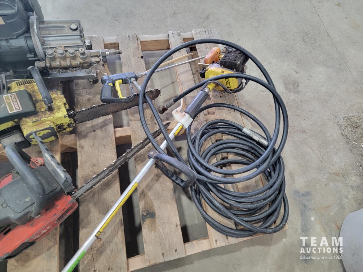 Pressure washer (untested) with hose wand, Pioneer P20 chainsaw, Homelite 245 chainsaw and John Deere 100G gas trimmer