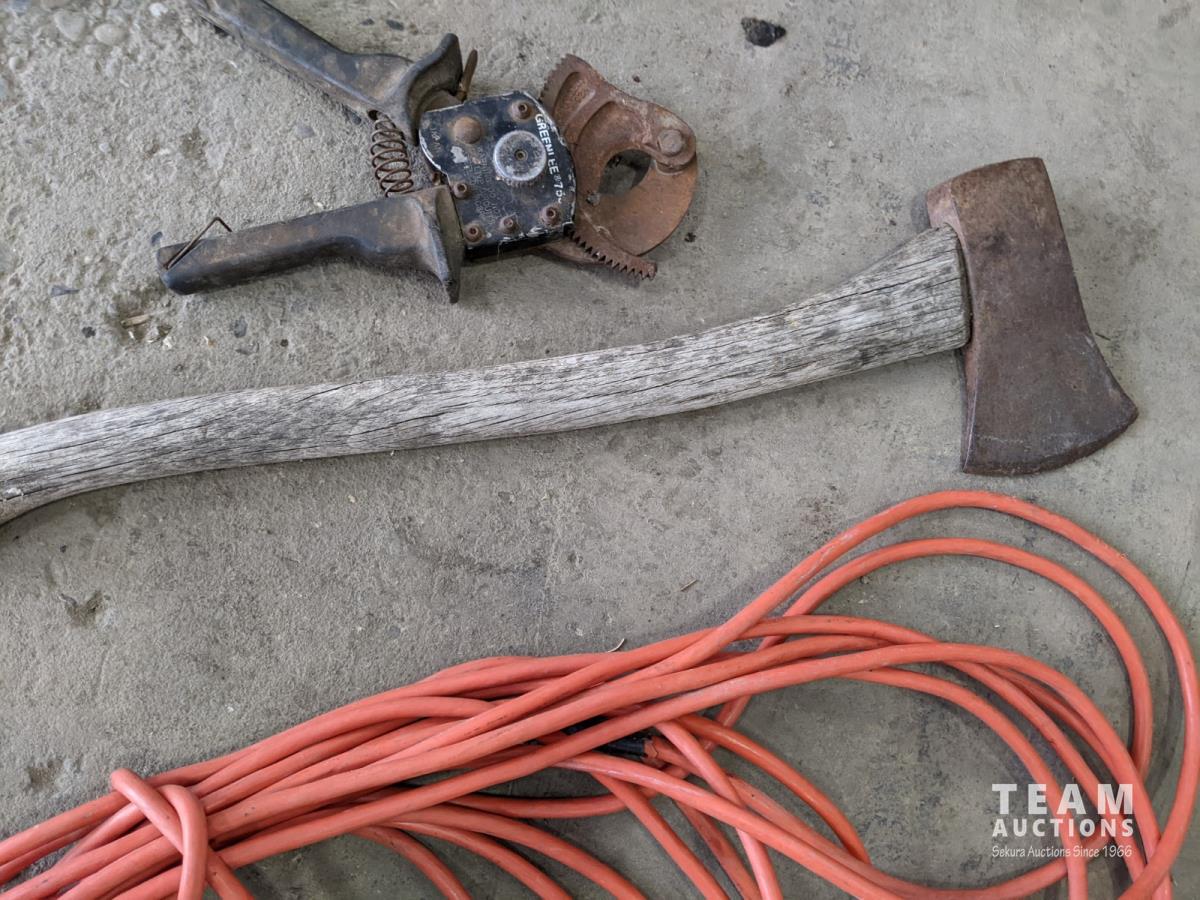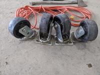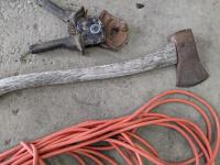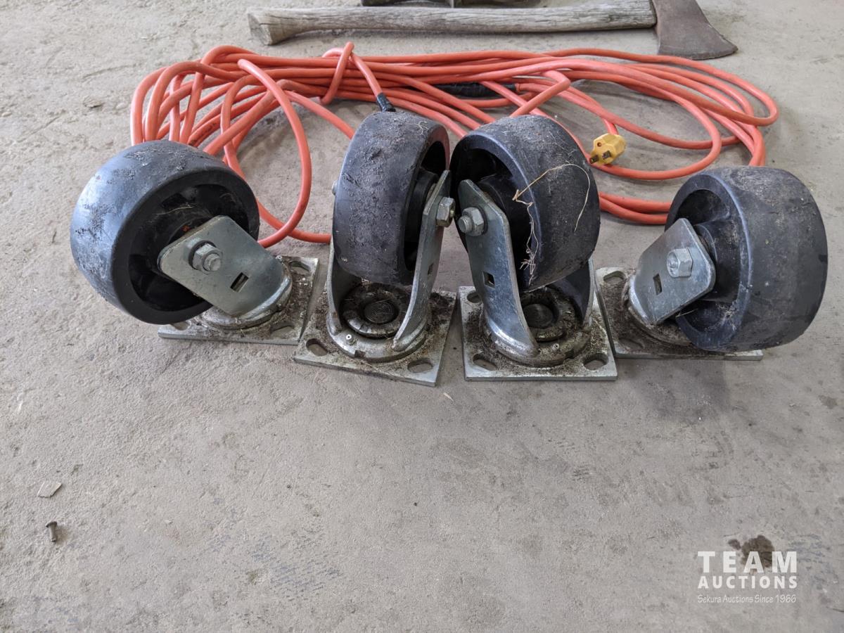 (4) castor wheels, extension cord, axe, hand saw, bottle jack and wire stripper