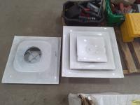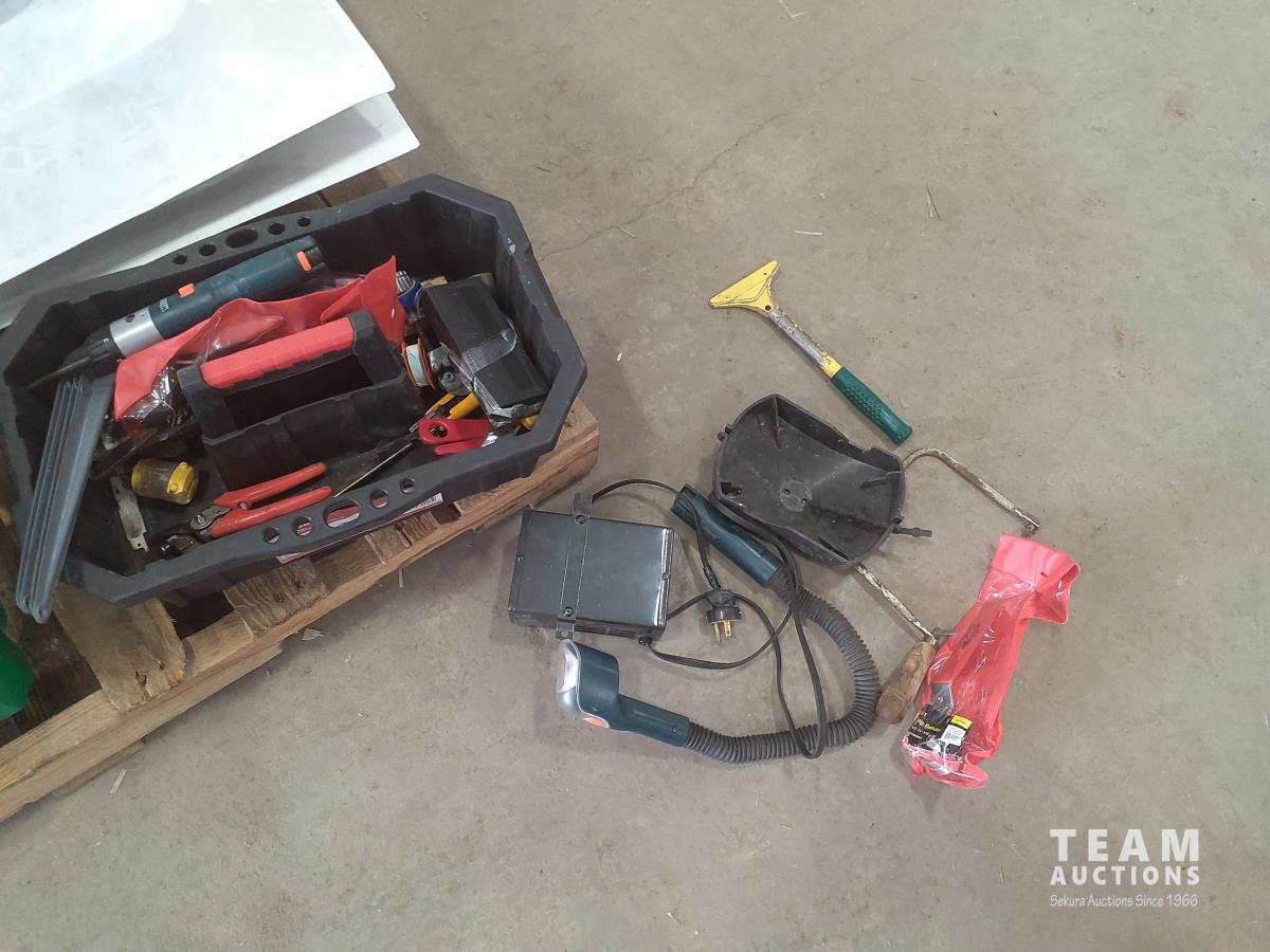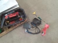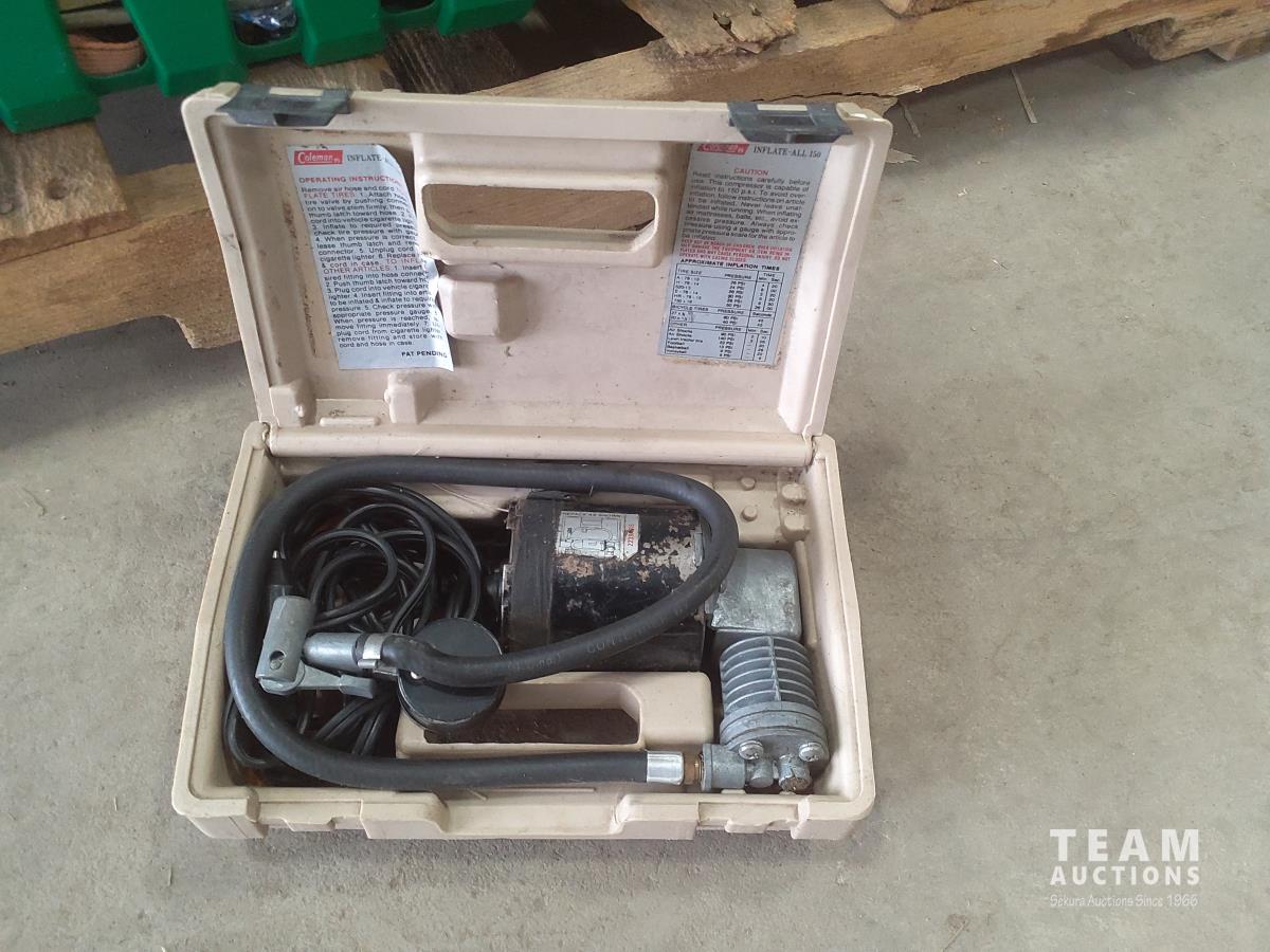 (2) ceiling vents, (1) roll brown rubber base, Coleman tire inflator, stripping/crimping tool, calking guns, wrench and miscellaneous items