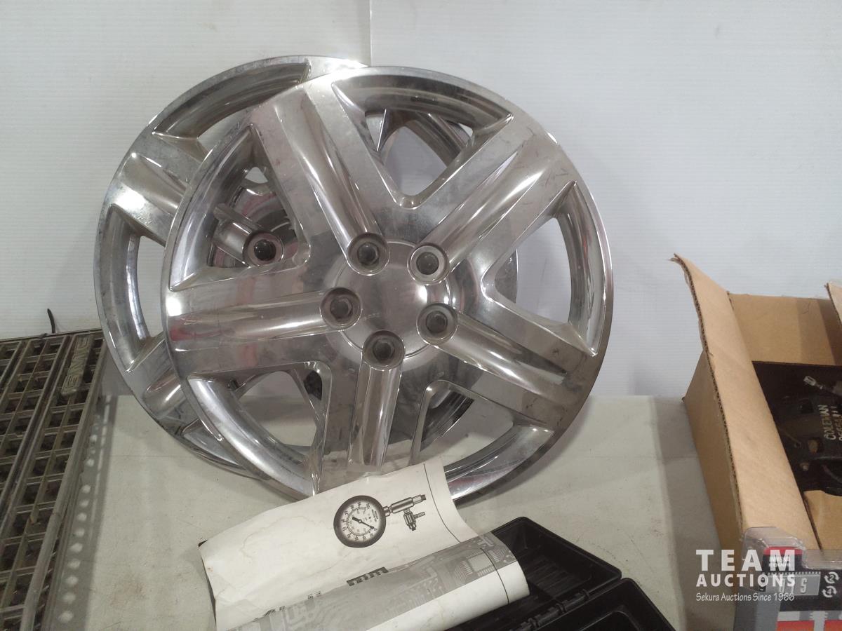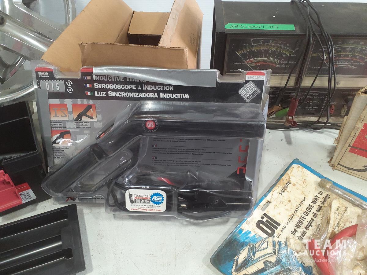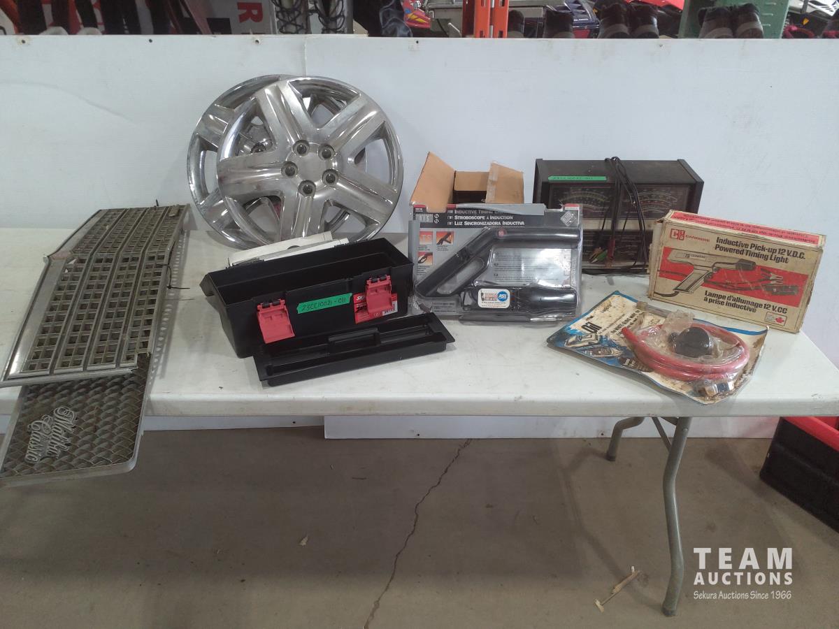 (2) Grills, (2) hub caps, fuel injection, (2) inductive timing lights, blower motor, oil and sludge extractor and automotive analyzer