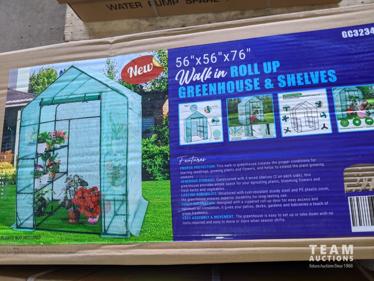 56 inch x 56 inch x76 inch, roll up door, shelves