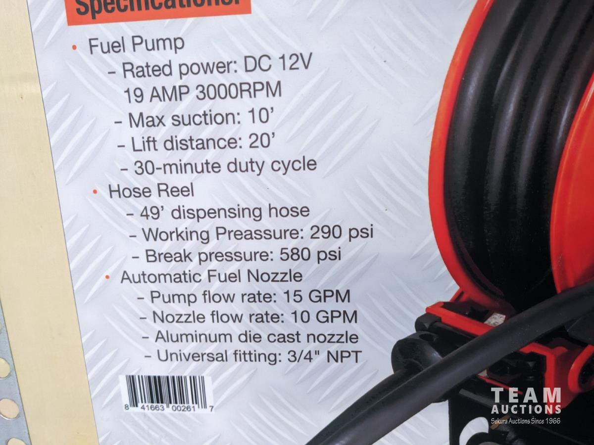 49 Ft hose, reel, auto shut off, DC 12 volt, 15 GPM