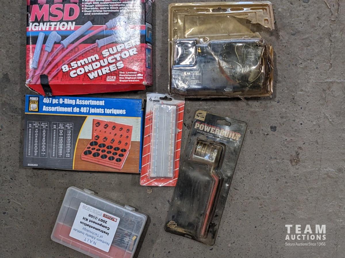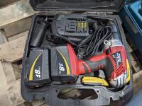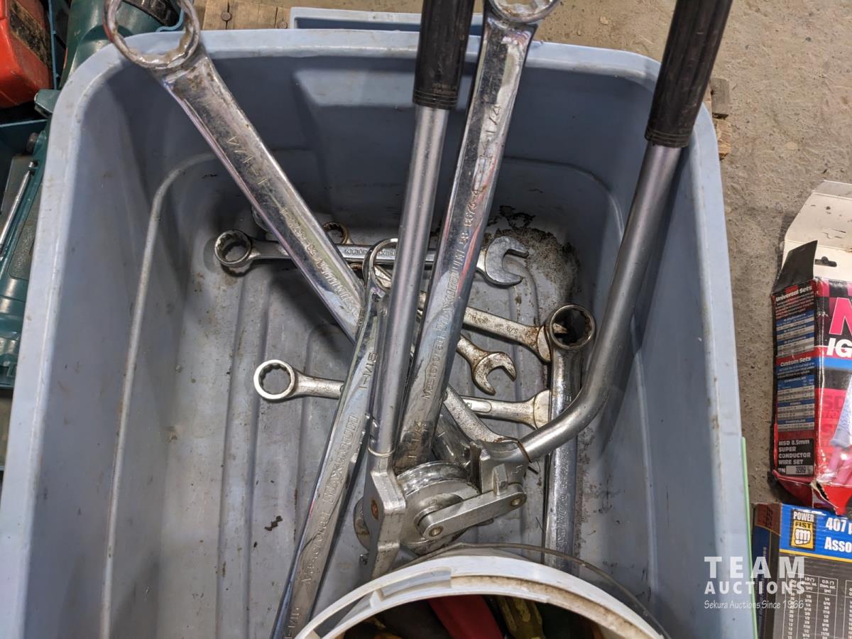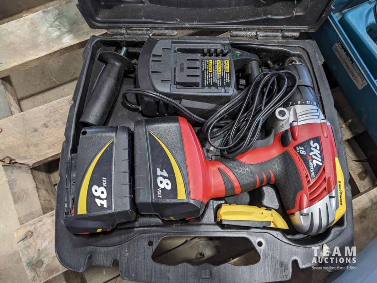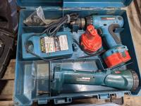 Makita 14.4v 1/2 inch cordless drill and flashlight, SKIL 18v cordless drill, tote of miscellaneous hand tools: wrenches, screwdrivers, pipe benders, 12v compressor, o-ring kit, spark plug kit
