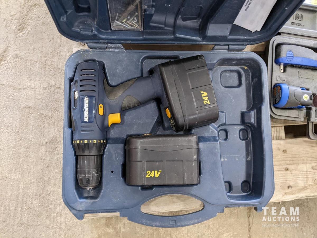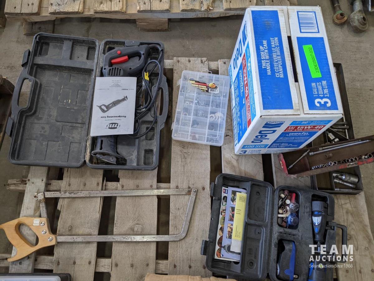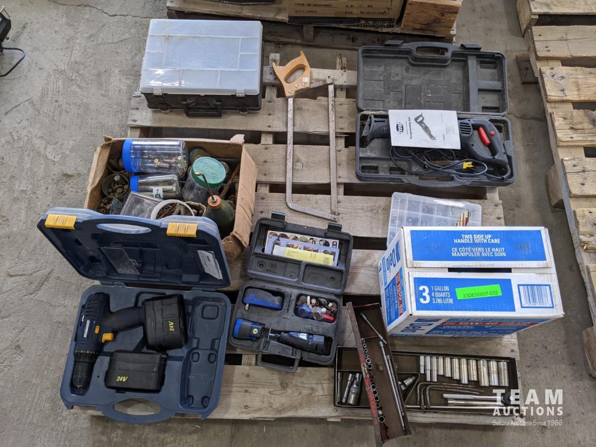Mastercraft 24v drill, Dremel, 15W-40 oil, miscellaneous nuts and bolts, hand saw, reciprocating saw, sockets