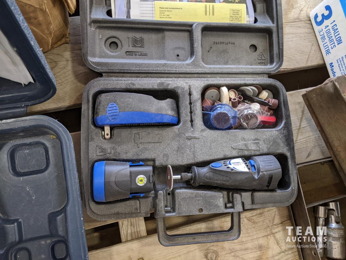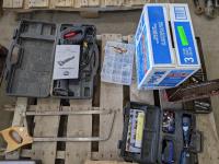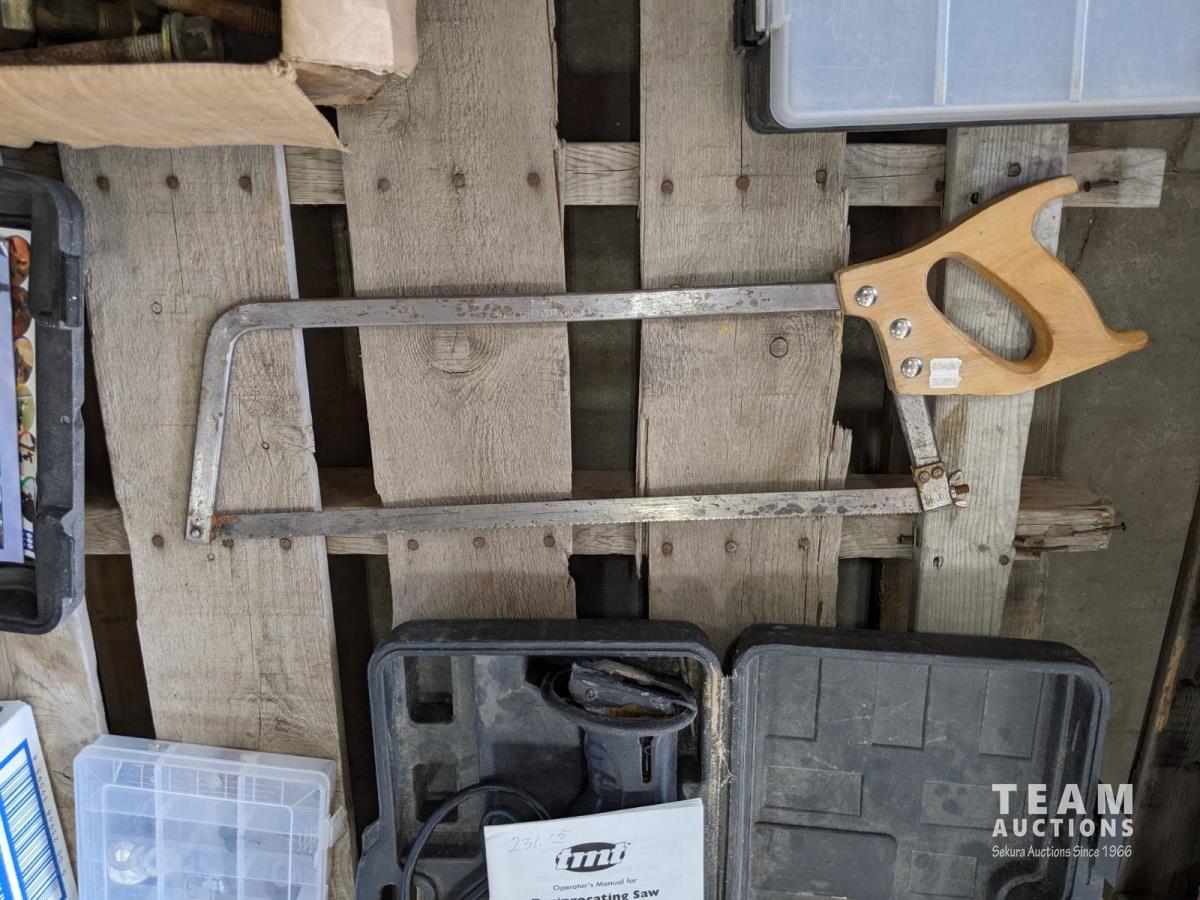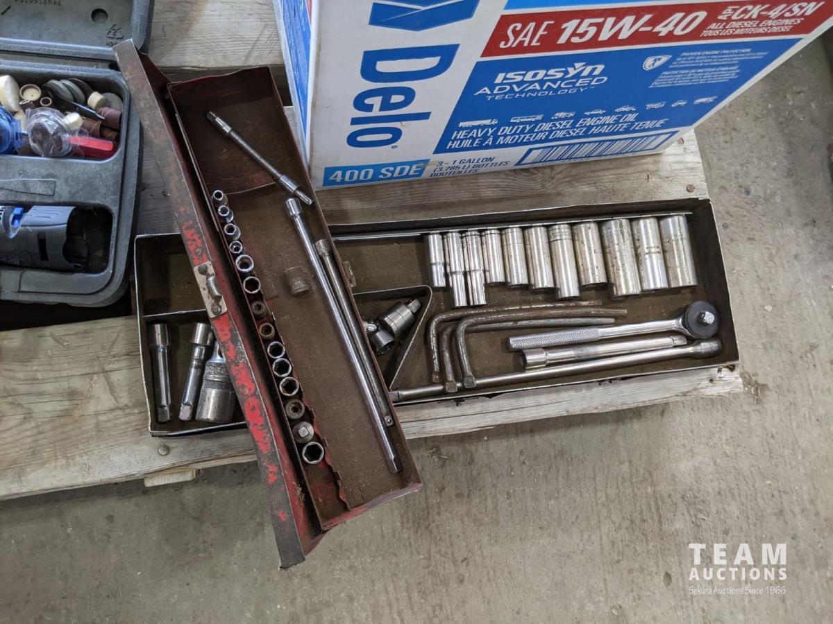 Mastercraft 24v drill, Dremel, 15W-40 oil, miscellaneous nuts and bolts, hand saw, reciprocating saw, sockets