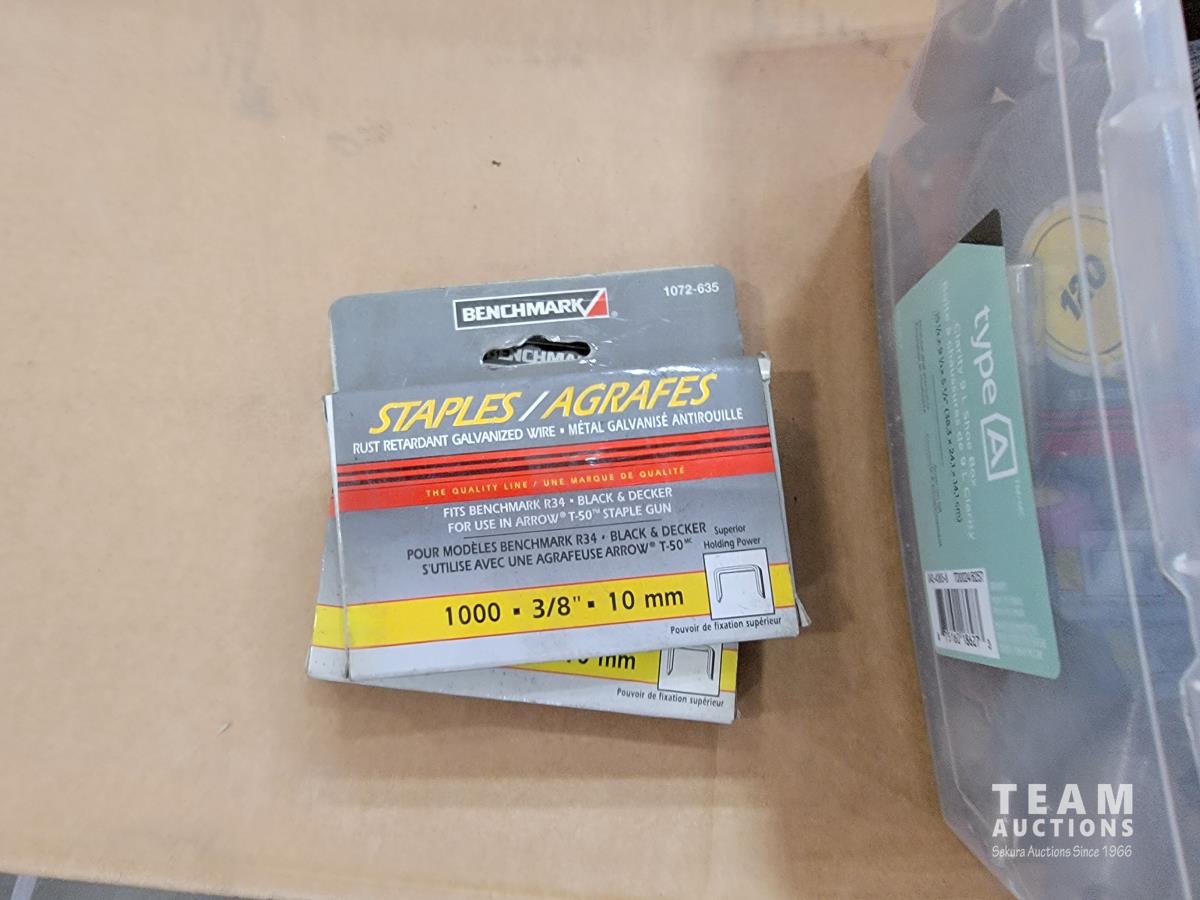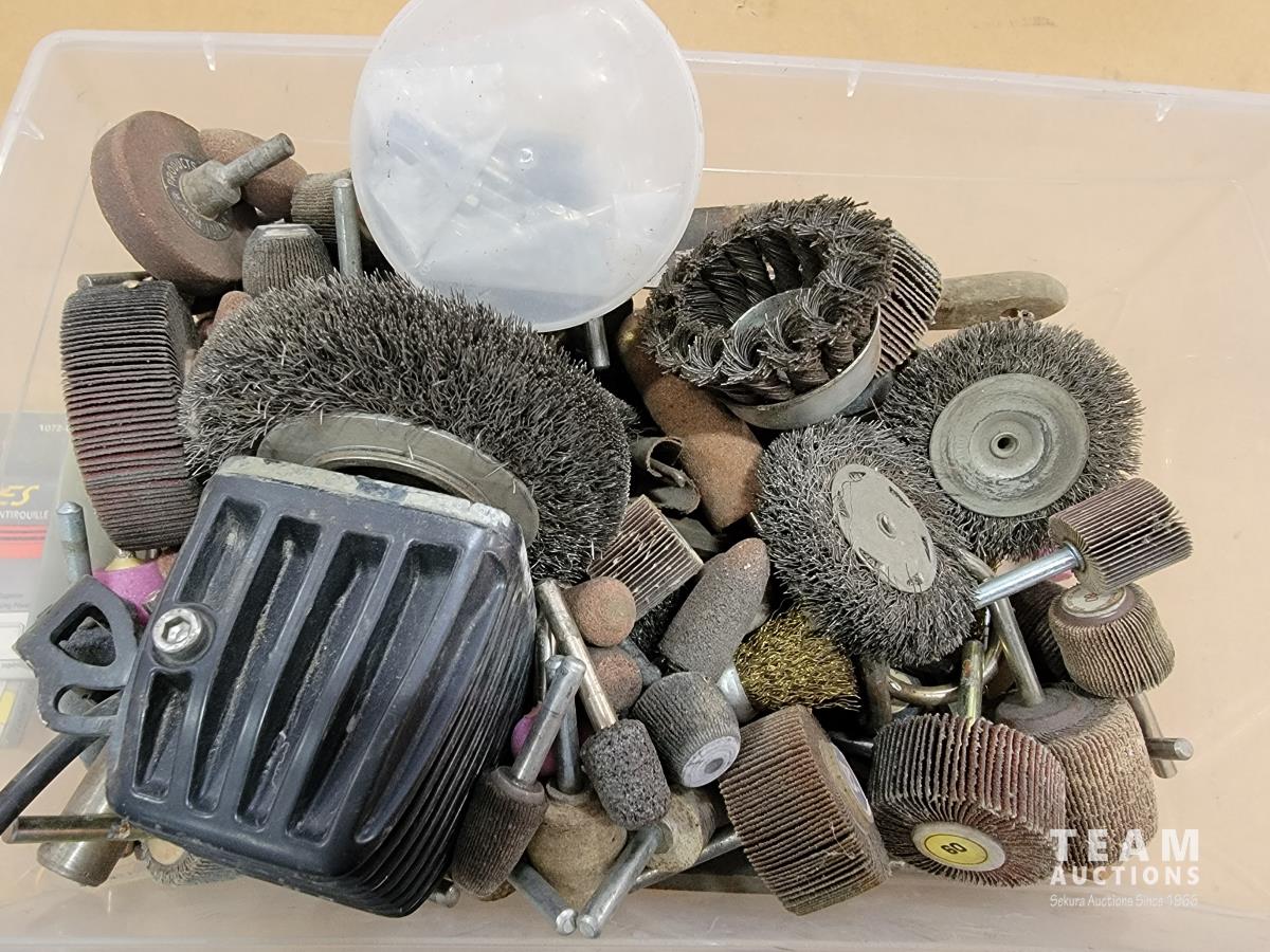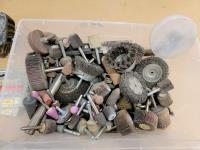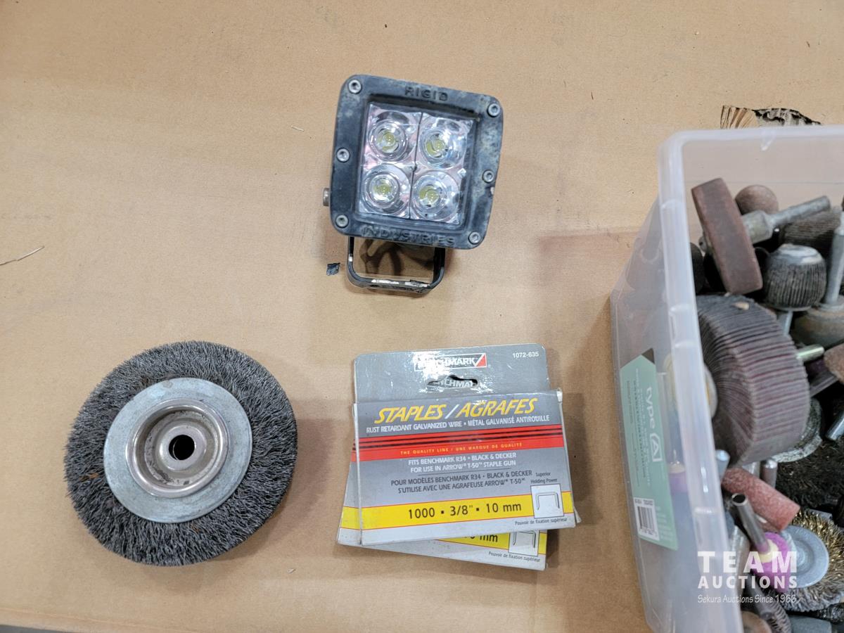 Wire wheel brushes, (2) cordless drills, clamps, staples