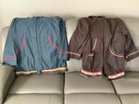 (2) vintage Inuit handmade women's size 14 winter wool coats, fur trimmed hood, hand embroidered designs, virgin wool, manufactured by Canadian Eskimo Company in northern Canada in approximately 1959-1962, Pair of women’s vintage handmade leather moccasins hand embroidered beads, fur trim from approximately 1960, (4) vintage nylon over coats with hoods various sizes with Inuit designs (the red one needs zipper repaired)