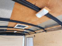 68 inch interior width, 75 inch interior height, ball hitch, side door, barn doors, spring suspension, interior lights, tie down hooks, 2990 lb axles, 205/75R15 tires