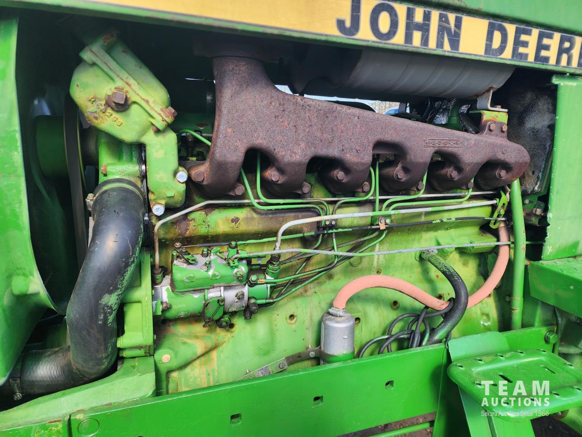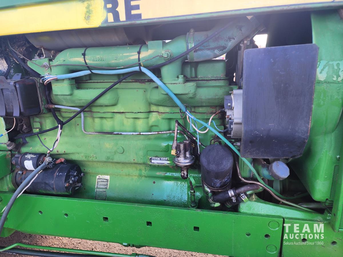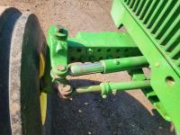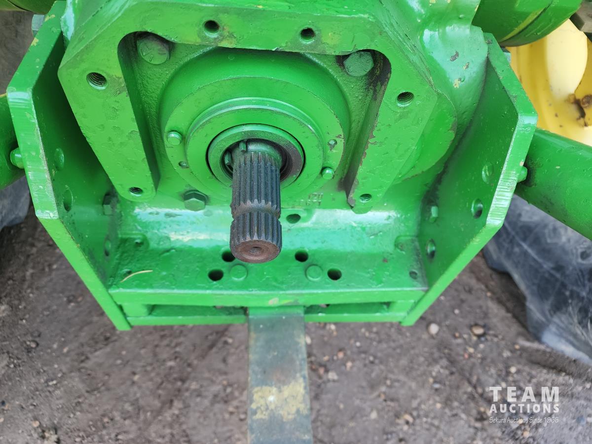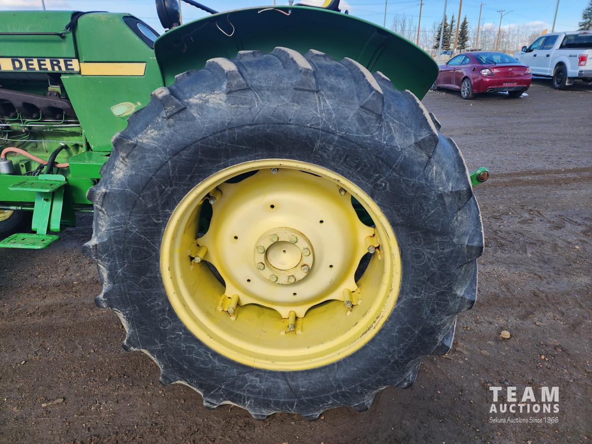 John Deere 5.9 L 6 cylinder engine, 16 speed Power Syncron partial power shift transmission, open station platform, 540/1000 PTO, 3 point hitch, 2 rear hydraulic outlets, 10.00-16 front tires, 18.4-34 rear tires